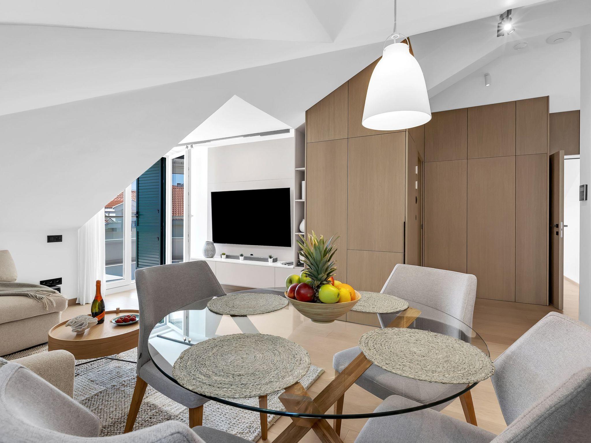 Der Außenbereich dieses beeindruckenden Penthouses zeichnet sich durch einen charmanten Balkon mit Essbereich im Freien aus, der zu gemütlichen Abenden einlädt. Eine private Dachterrasse bietet Ihnen zusätzliche Exklusivität und die Möglichkeit, ungestörte Stunden unter der dalmatinischen Sonne zu verbringen. Genießen Sie hier Ihre Morgenkaffe oder ein Abendessen unter freiem Himmel.