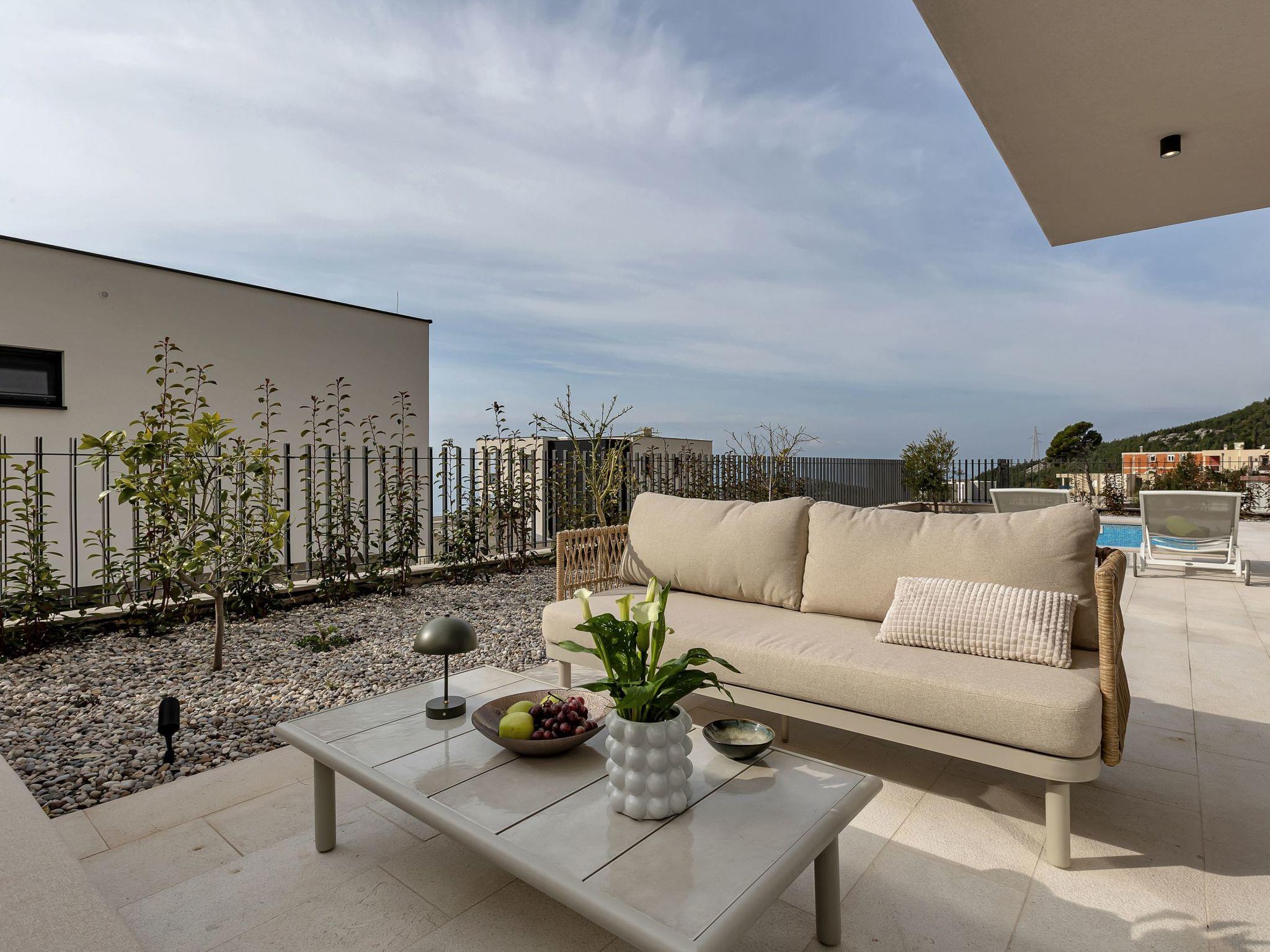 Der Außenbereich mit seinem privaten Pool lädt zum Entspannen und Sonnenbaden ein. Der Poolbereich ist ideal für erfrischende Momente an heißen Tagen. Eine geräumige Terrasse und ein Balkon bieten zusätzlichen Raum für gemeinsame Mahlzeiten im Freien oder einfach, um die Ruhe und den Blick zu genießen. Die Anlage ist so gestaltet, dass Gäste die malerische Umgebung und die friedvolle Atmosphäre in vollen Zügen erleben können, ohne dabei auf Komfort verzichten zu müssen.