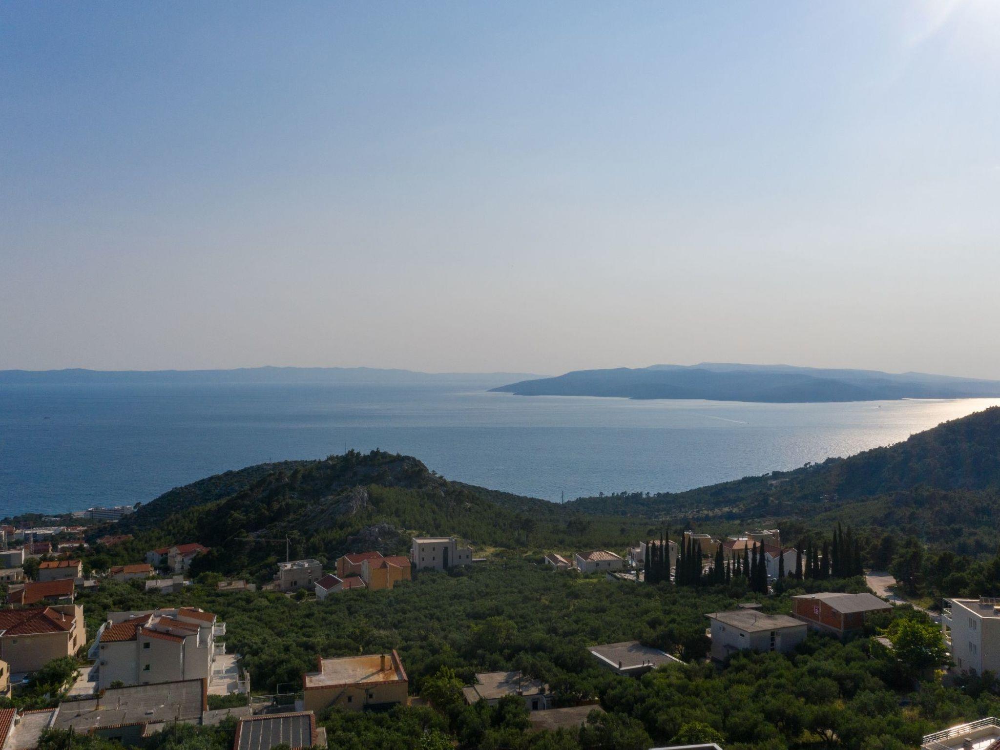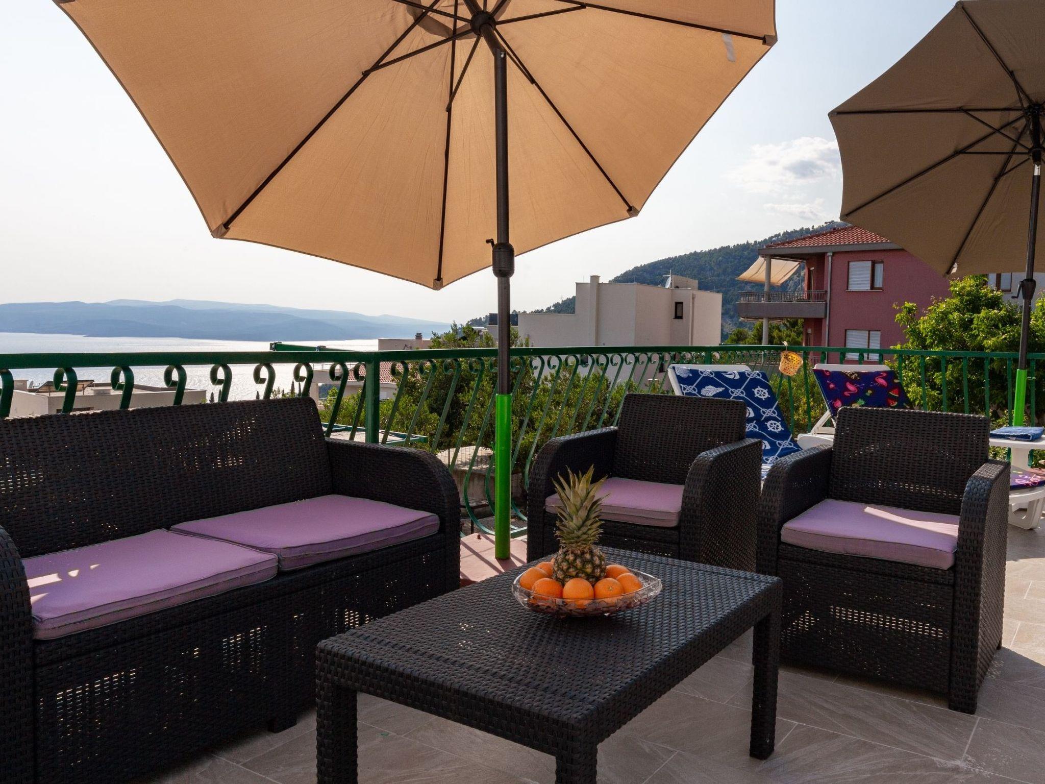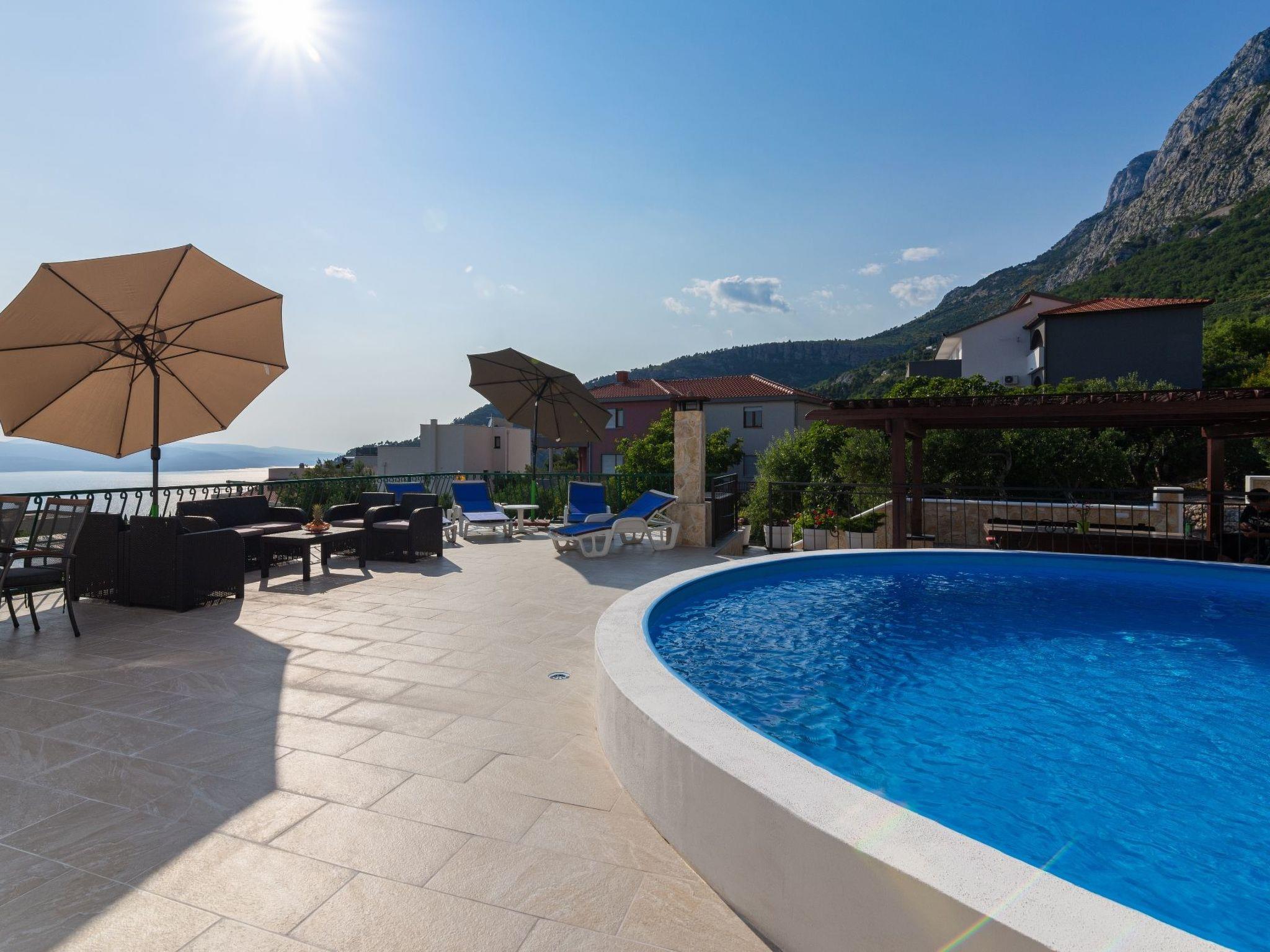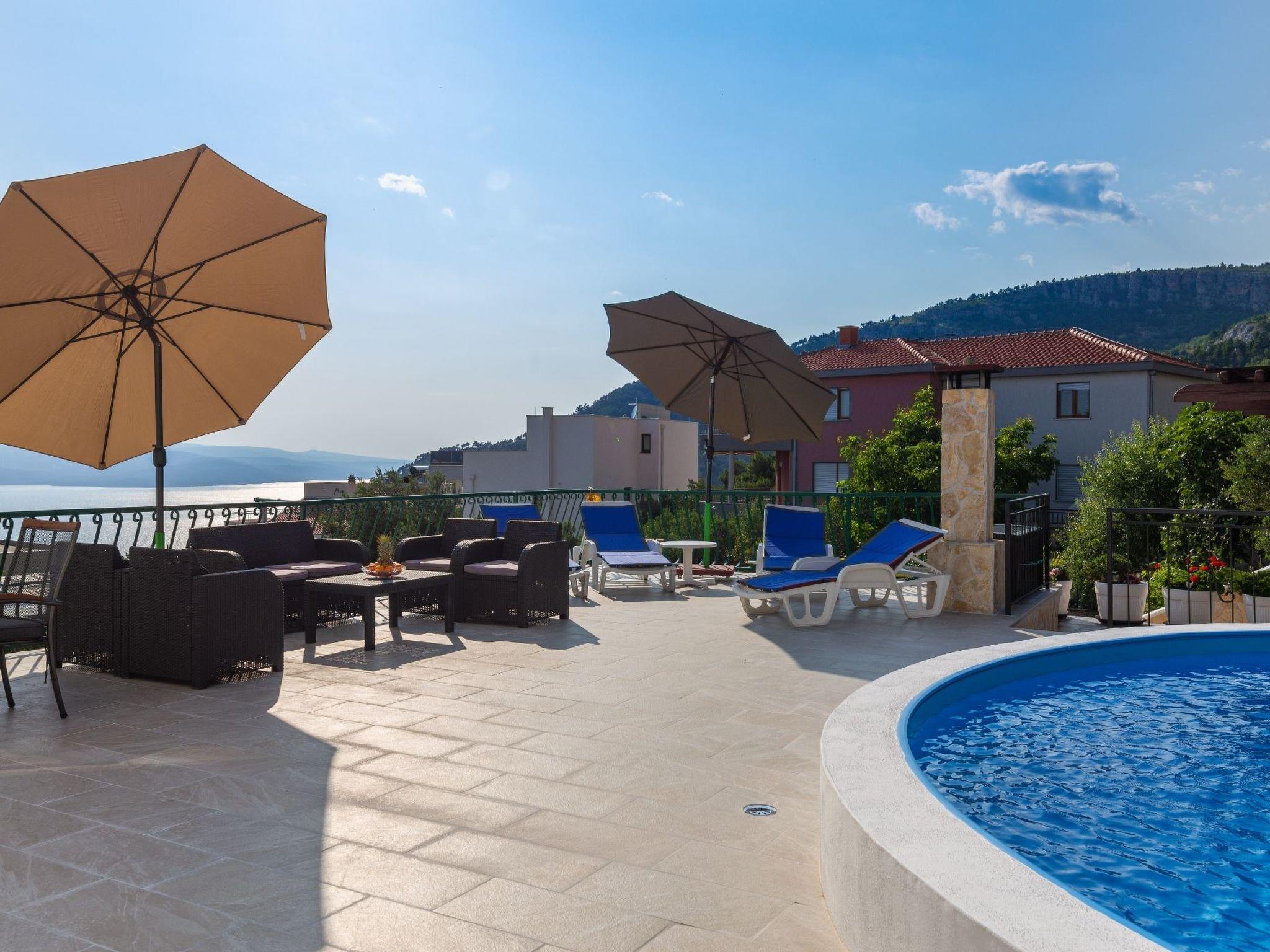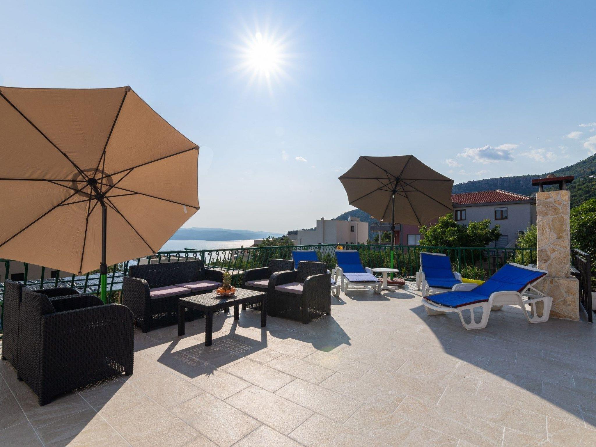 Die 50 m² große Terrasse ist eine Oase des Wohlbefindens und bietet Ihnen eine entspannende Atmosphäre, während Sie auf der Sonnenterrasse liegen oder den lokalen Wein und die auf dem Grill zubereiteten Speisen genießen. Von hier aus können Sie das atemberaubende Panorama auf das Meer, die Inseln von Hvar, das Brac-Tal und den Berg Biokovo genießen.