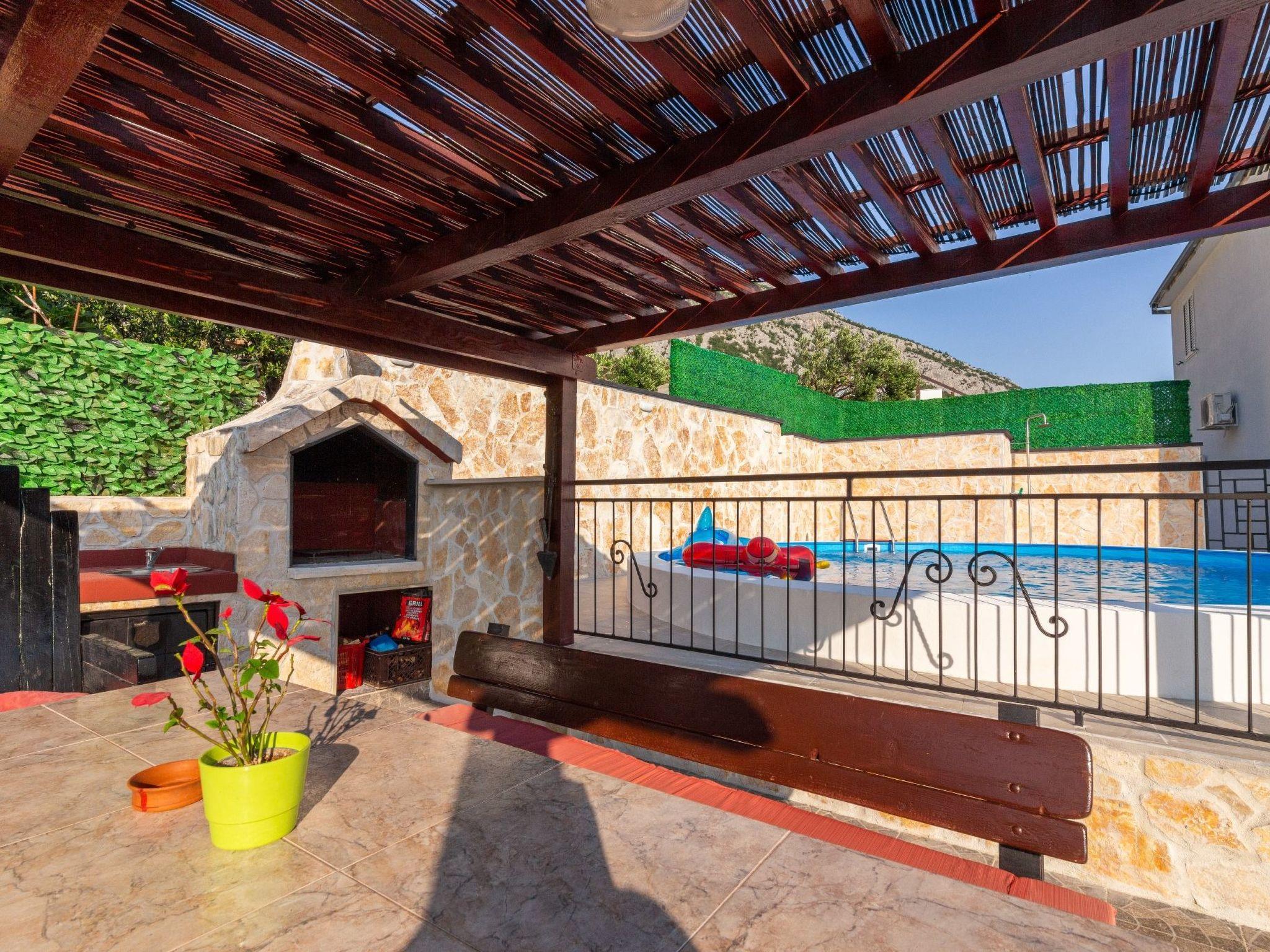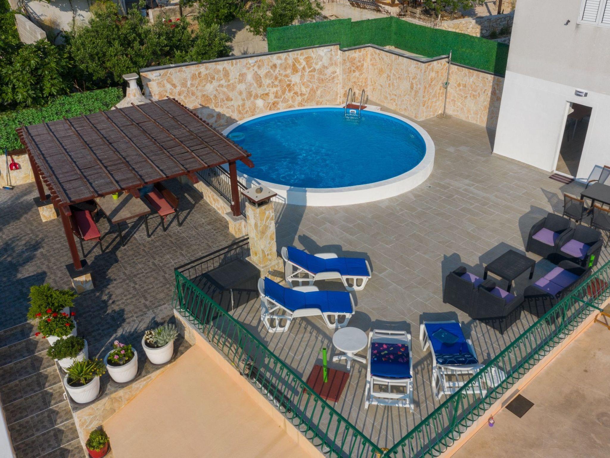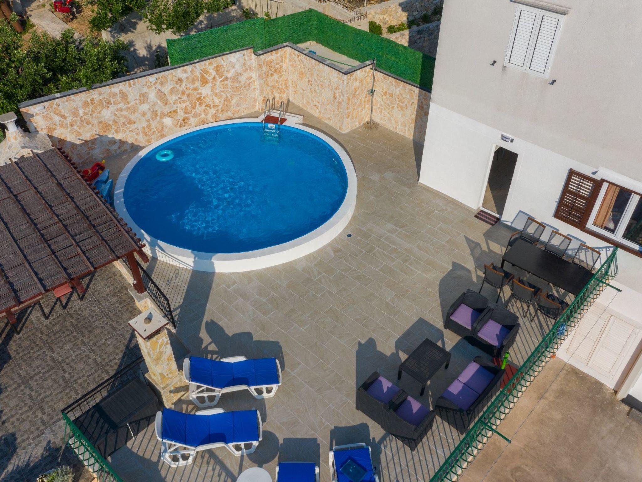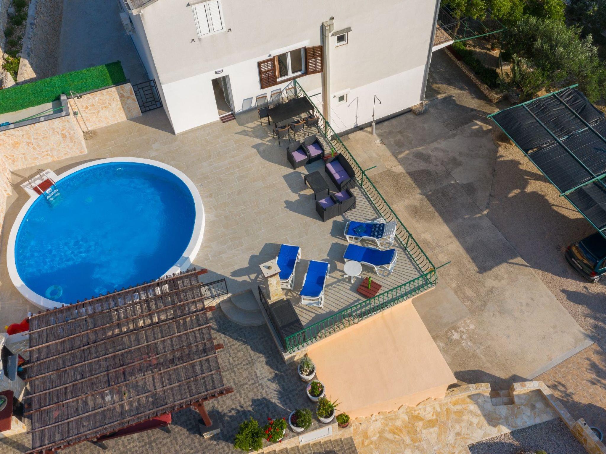 Die 50 m² große Terrasse ist eine Oase des Wohlbefindens und bietet Ihnen eine entspannende Atmosphäre, während Sie auf der Sonnenterrasse liegen oder den lokalen Wein und die auf dem Grill zubereiteten Speisen genießen. Von hier aus können Sie das atemberaubende Panorama auf das Meer, die Inseln von Hvar, das Brac-Tal und den Berg Biokovo genießen.