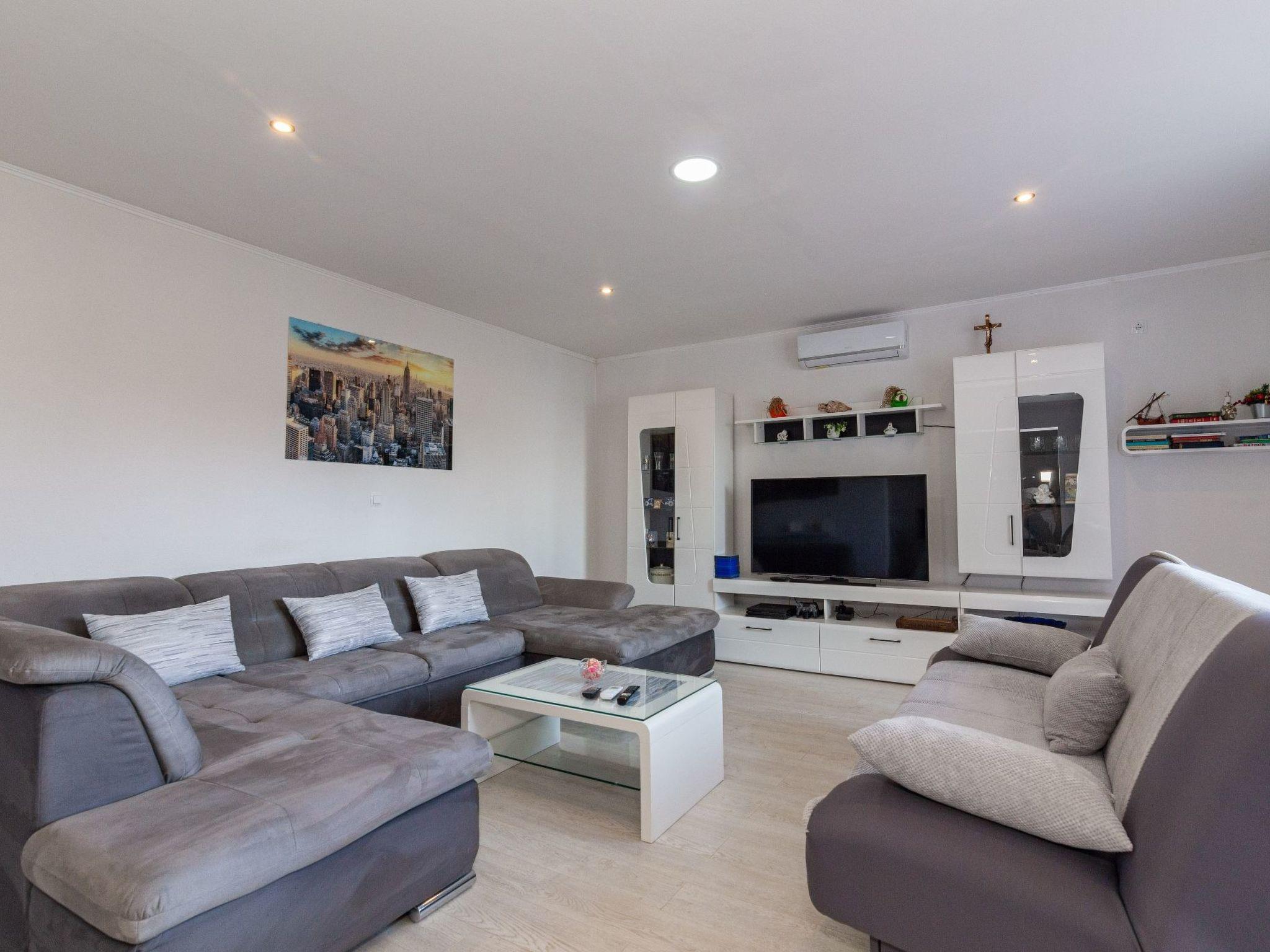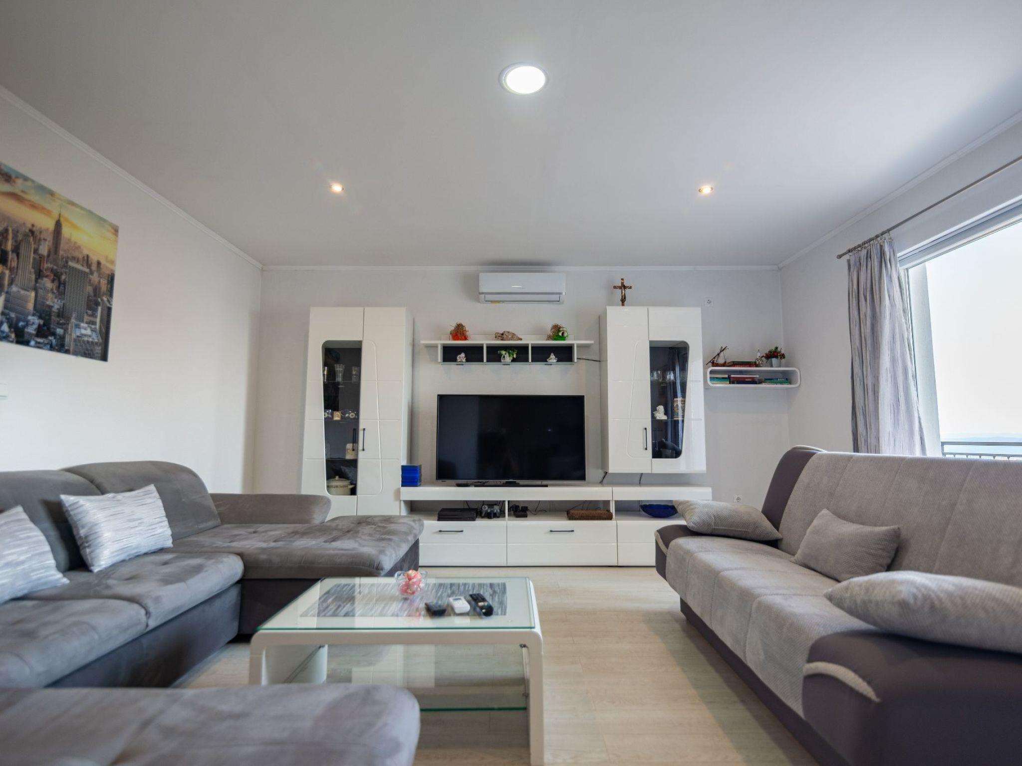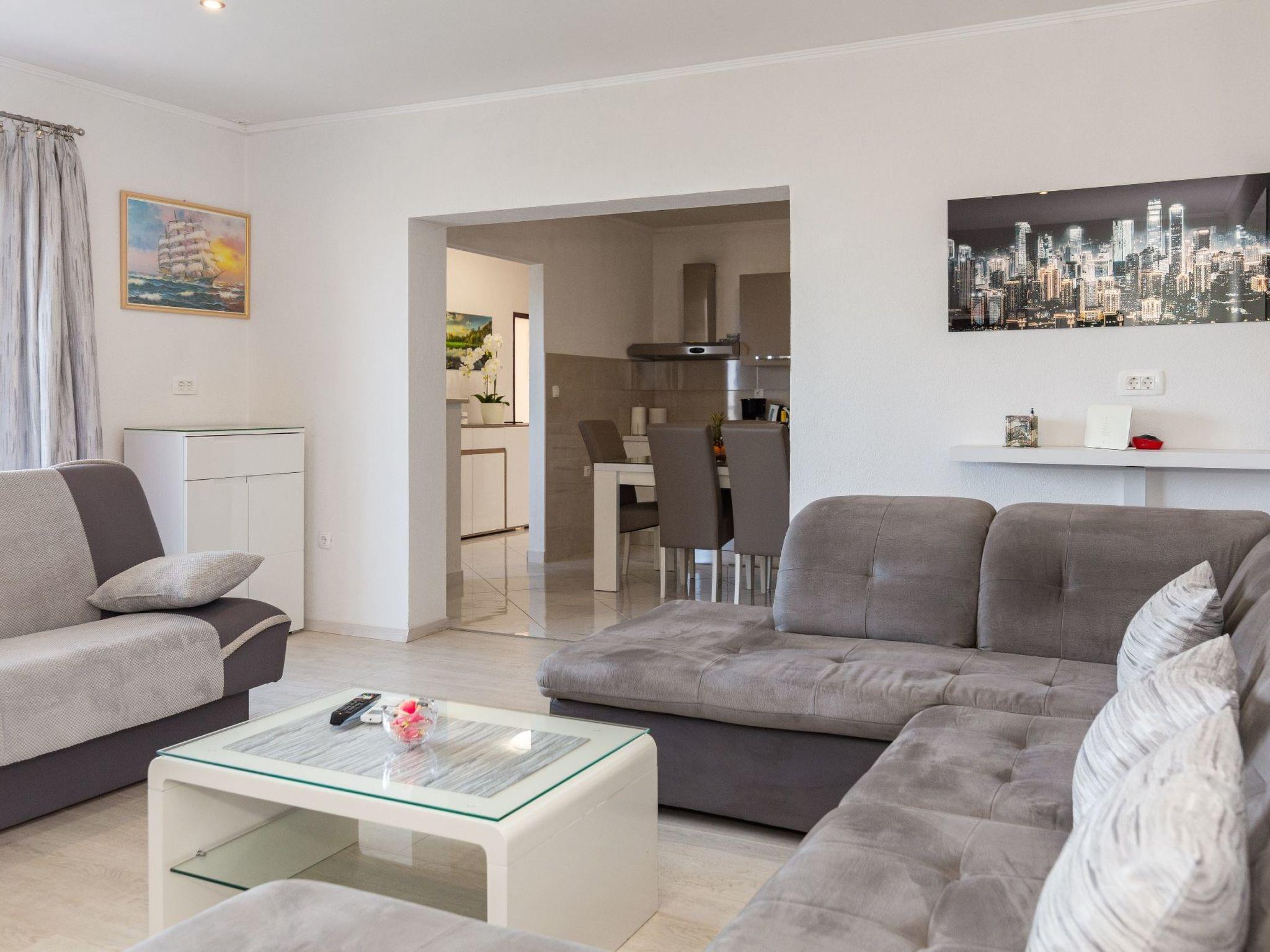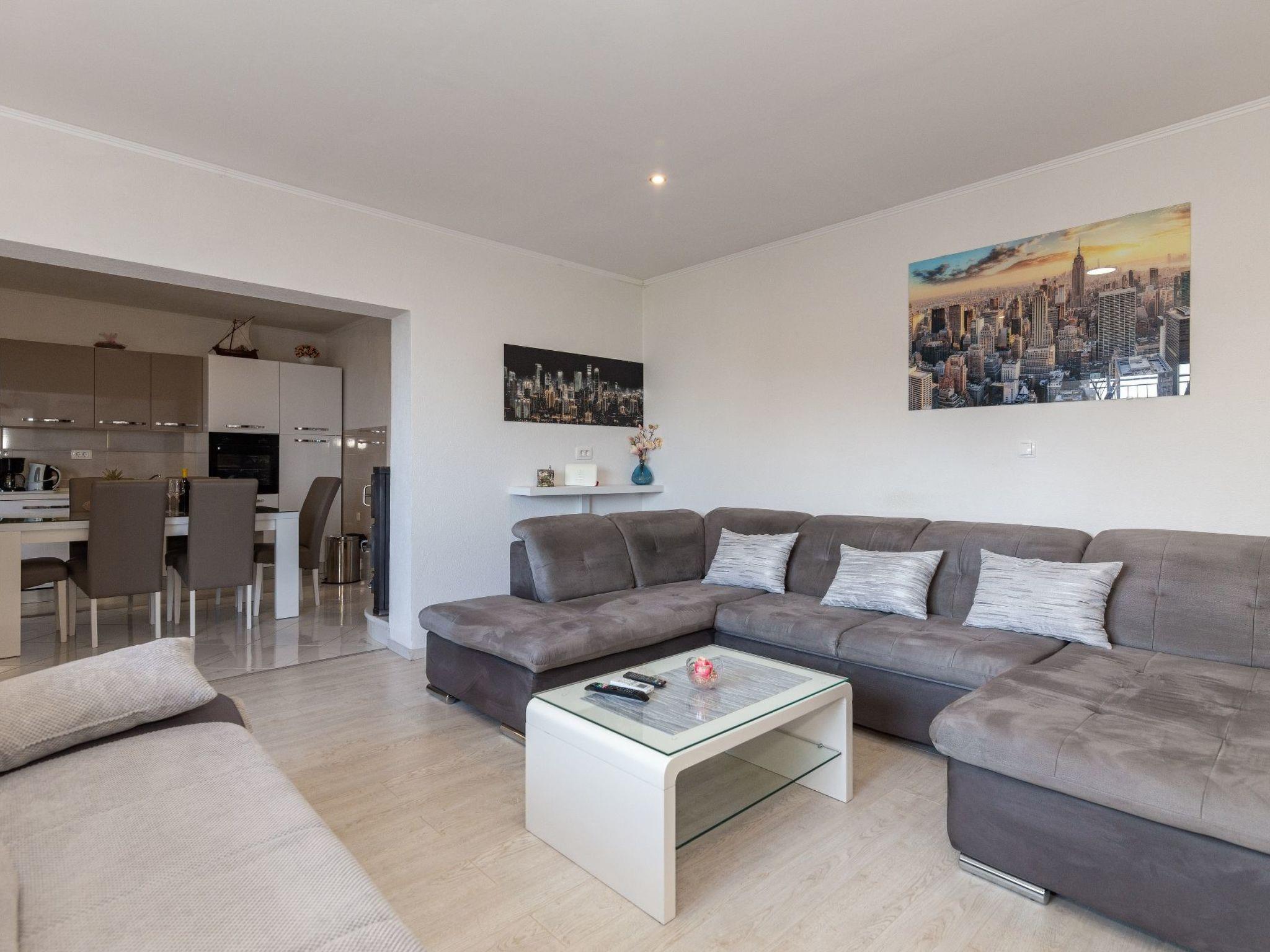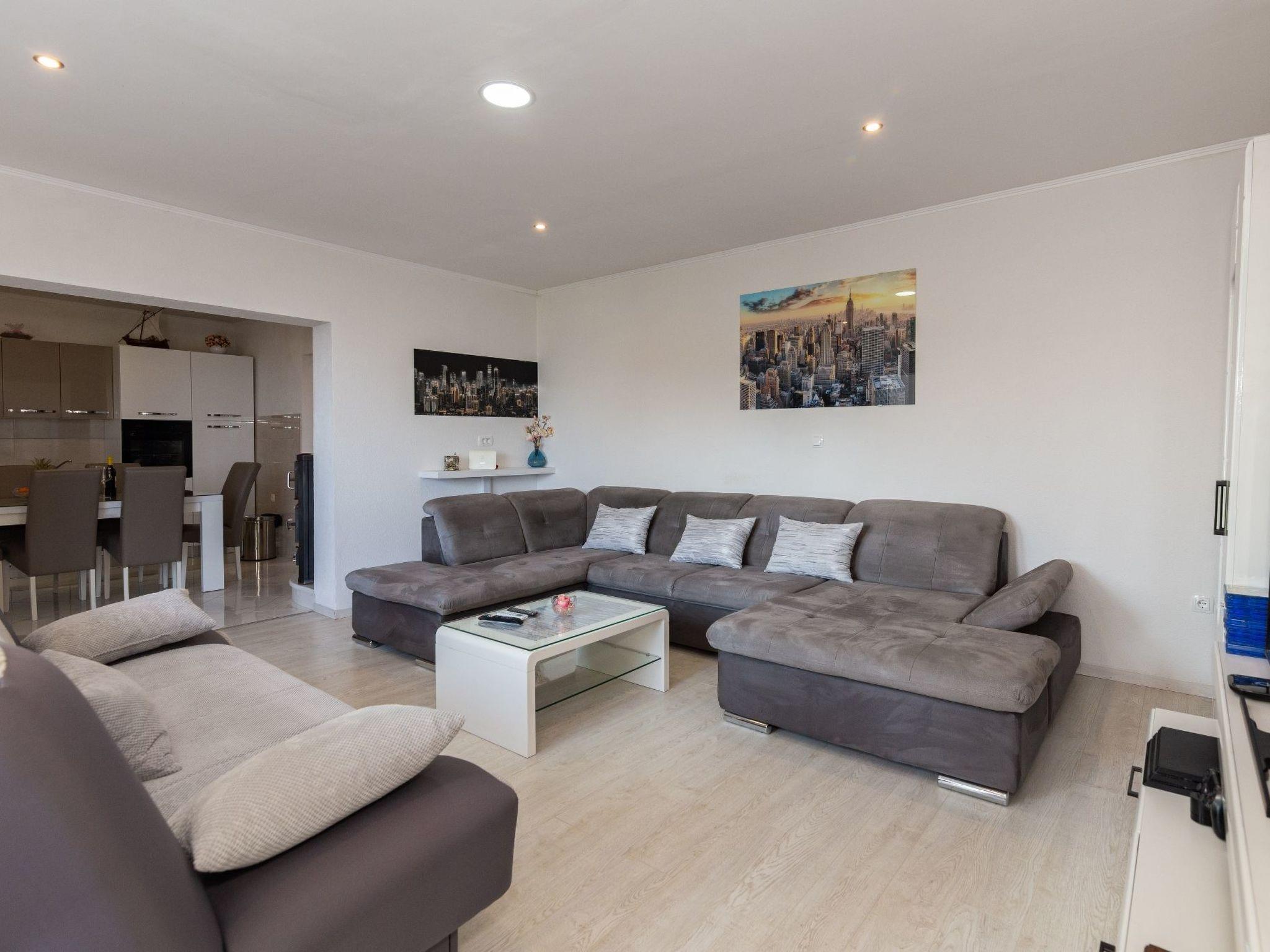 Die 50 m² große Terrasse ist eine Oase des Wohlbefindens und bietet Ihnen eine entspannende Atmosphäre, während Sie auf der Sonnenterrasse liegen oder den lokalen Wein und die auf dem Grill zubereiteten Speisen genießen. Von hier aus können Sie das atemberaubende Panorama auf das Meer, die Inseln von Hvar, das Brac-Tal und den Berg Biokovo genießen.