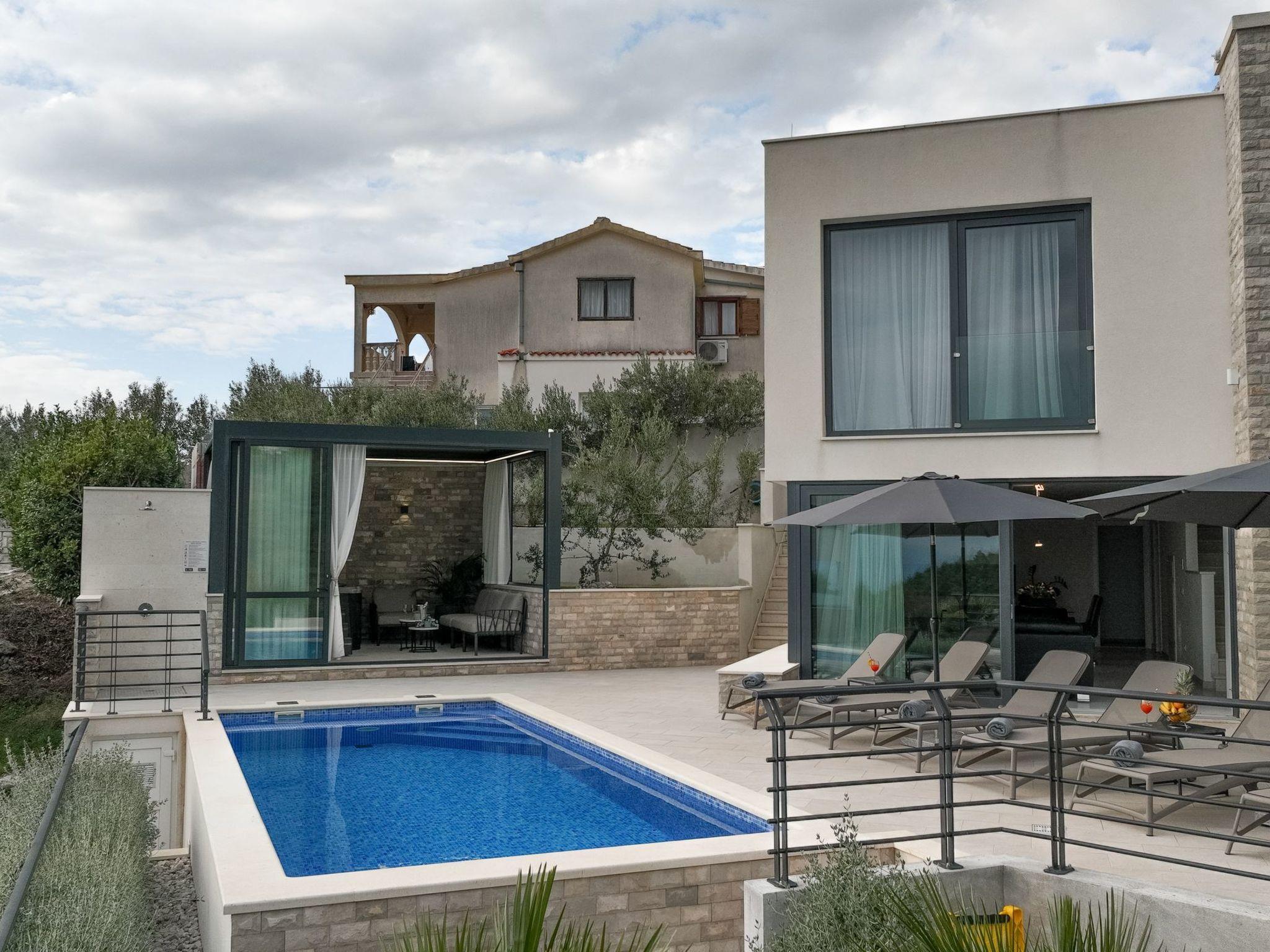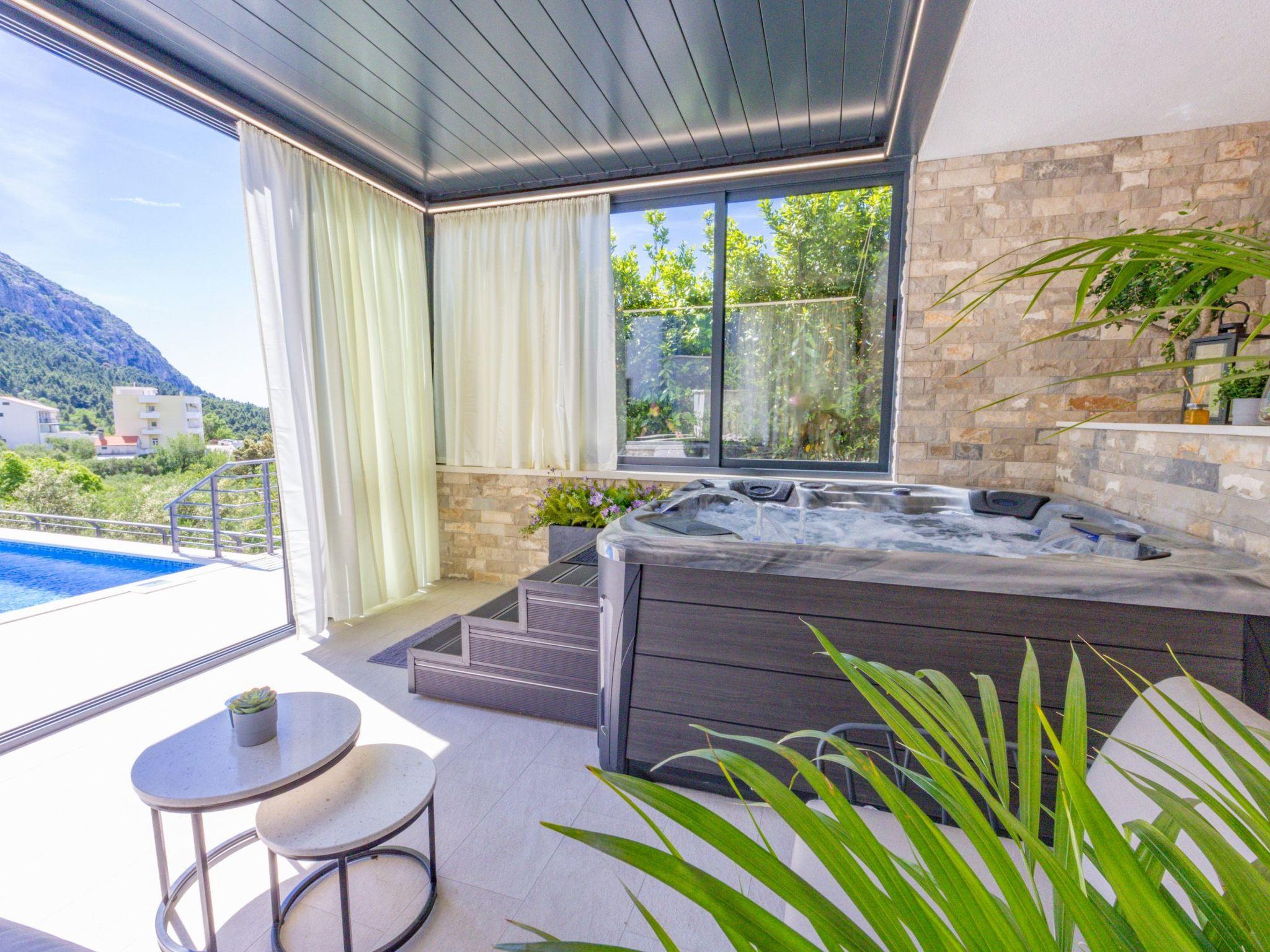 Vom Erdgeschoss aus gelangen Sie auf die Poolterrasse mit einem beheizten Pool, Sonnenliegen und einer Außendusche. Zudem gibt es eine verglaste Terrasse mit einem Whirlpool, der sich an kühleren Tagen vollständig schließen lässt, ideal zum Entspannen. Eine weitere Terrasse beim Schlafzimmer im Erdgeschoss bietet eine überdachte Konoba (Weinkeller) und eine Grillstelle für gemütliche Abende.
