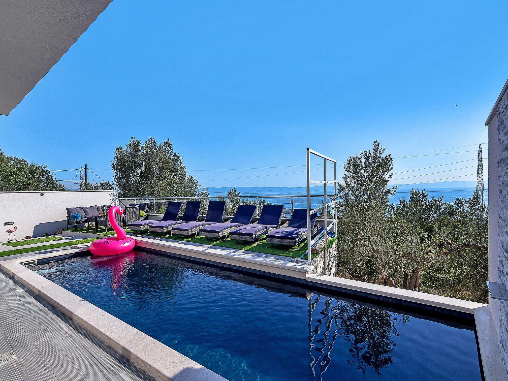 Schöne Villa Nera mit Pool in Makarska, oberhalb der Stadt in ruhiger Lage mieten, mit drei Schlafzimmern. Diese neuerbaute Villa, Doppelhaus, mit Meerblick befindet sich in eine ruhige Hanglage oberhalb der Stadt Makarska. Eröffnung ist für Ende Juni 2017 vorgesehen. Die Räume verteilen sich über zwei Etagen. Es stehen Ihnen drei Doppelbett Schlafzimmer mit eigenem Badezimmer zur Verfügung, jedes Zimmer mit TV/SAT ausgestattet. Das geräumige Wohnbereich mit offenen Küche, schöne Terrasse mit Pool und Meerblick, Sonnenliegen, eine Außendusche und Grillstelle. Alle Räume sind klimatisiert, TV/SAT und Internetanschluß, WLAN. Nach einem Tagesausflug genießen Sie die Entspannung auf der Eckcouchgarnitur. Unterhaltung am Abend bietet Ihnen ein moderner wandmontierter Smart-TV mit Sat.-TV Anschluss. Am Esstisch vorbei, der ausreichend Platz zu gemeinsamen Speisen bietet, gelangen Sie in den offenen Kochbereich. Die moderne Einbauküche ist mit allen Geräten zu einer komfortablen Selbstversorgung ausgestattet, inklusive Herd, Mikrowelle und Geschirrspülmaschine. Zur komfortablen Ausstattung der Villa zählt der kabellose Internetzugang über WLAN, sowie Klimaanlage. Eine ruhige Hanglage oberhalb der Stadt umgeben von vielen Olivenbäumen, ideal für einen entspannten Urlaub. Es handelt sich um ein Doppelhaus das jedoch die volle Privatsphäre bietet. Der Außenpool mit Meerblick, 2.5 m x 8.5 m , Tiefe 1.50 m