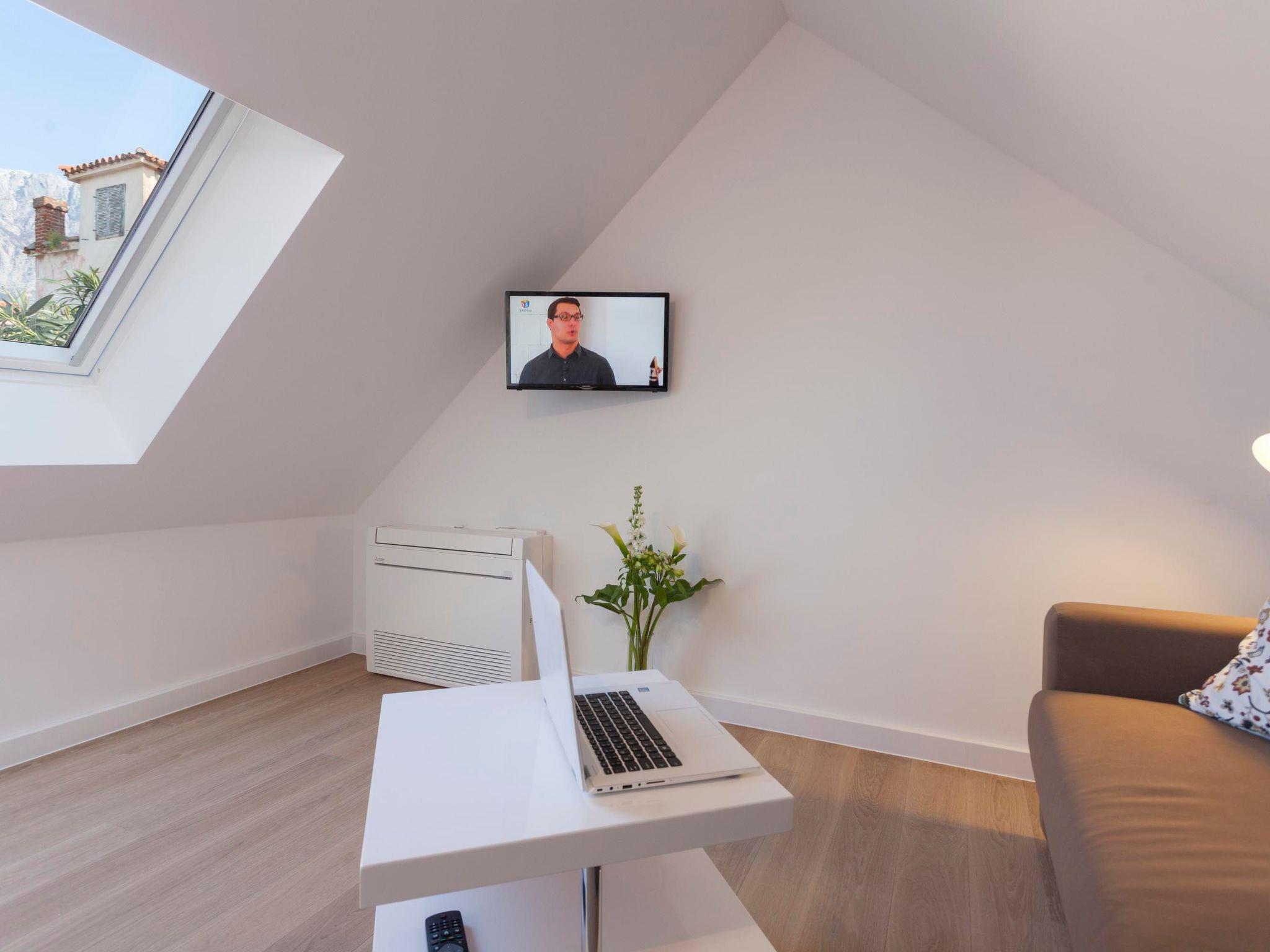 It has two double bedrooms, a workroom, a living room with a fully equipped kitchen, two bathrooms / wc and a large terrace on the top with one side with sea view and the other on the mountain Biokovo.