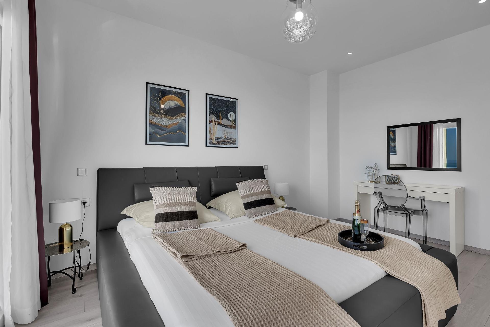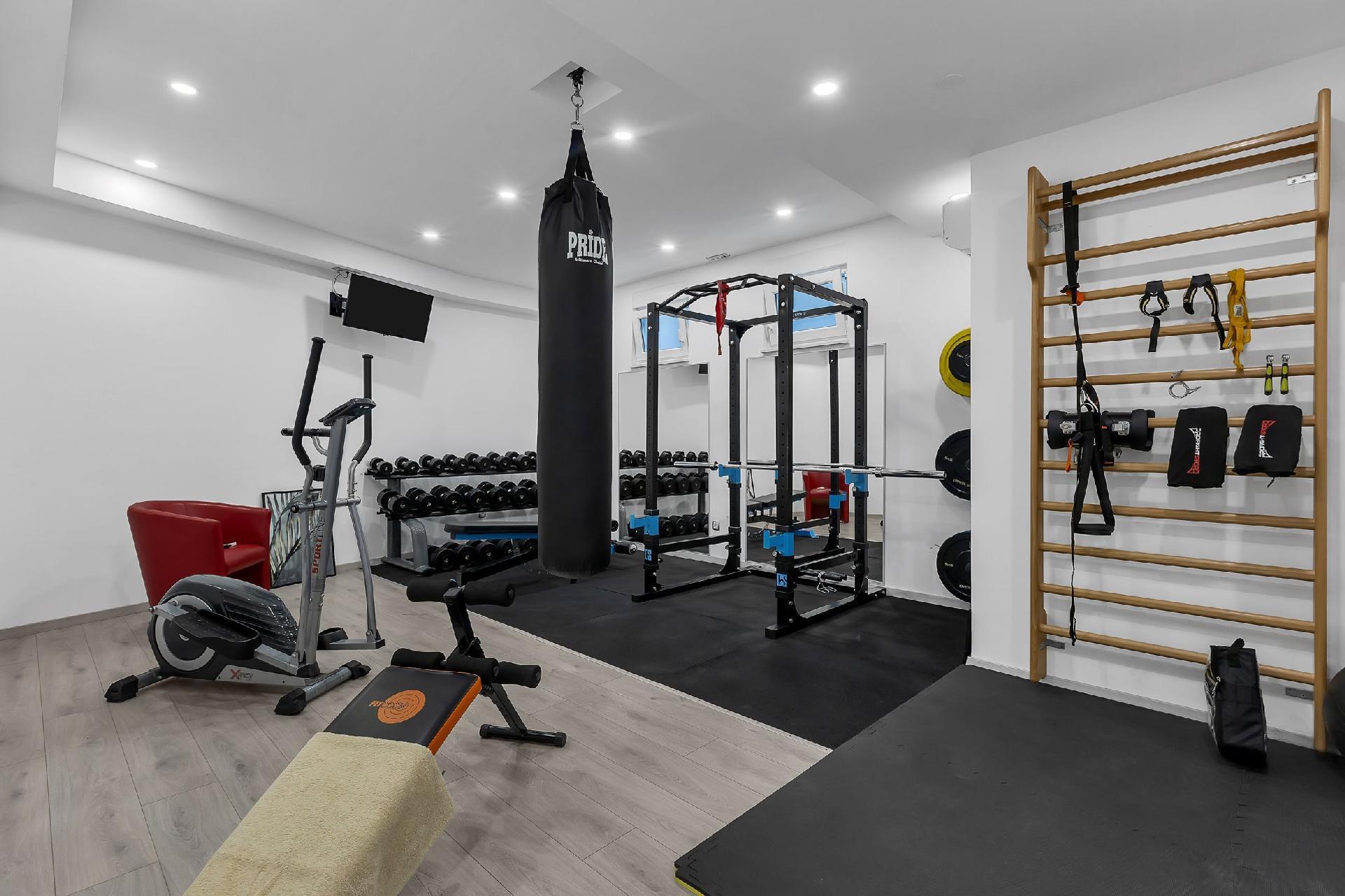 Villa bietet eine 340 m2 Wohnfläche auf 4 Ebenen, Garten mit einem großen privaten, beheizten Swimmingpool und Grill, Französisch Garten Ecke. Sie ist für 6 + 2 Personen geeignet. Im Erdgeschoss befindet sich das geräumige Wohnzimmer mit einer offenen Küche und einem Ausgang zur Terrasse mit Pool und Sonnenliegen und ein Schlafzimmer mit einem Doppelschlafsofa für 2 Personen und auf der gleichen Etage ist die Toilette. Auf der zweiten Etage befinden sich 3 Doppelschlafzimmer, jedes mit eigenem Bad und Balkon, alle mit TV/SAT, Klimaanlage. Im Untergeschoss befindet sich ein großer professioneller Fitnessraum, und es gibt einen 56 m2 großen Sportplatz im Freien geeignet für Fußball, Basketball, Volleyball & etc.
