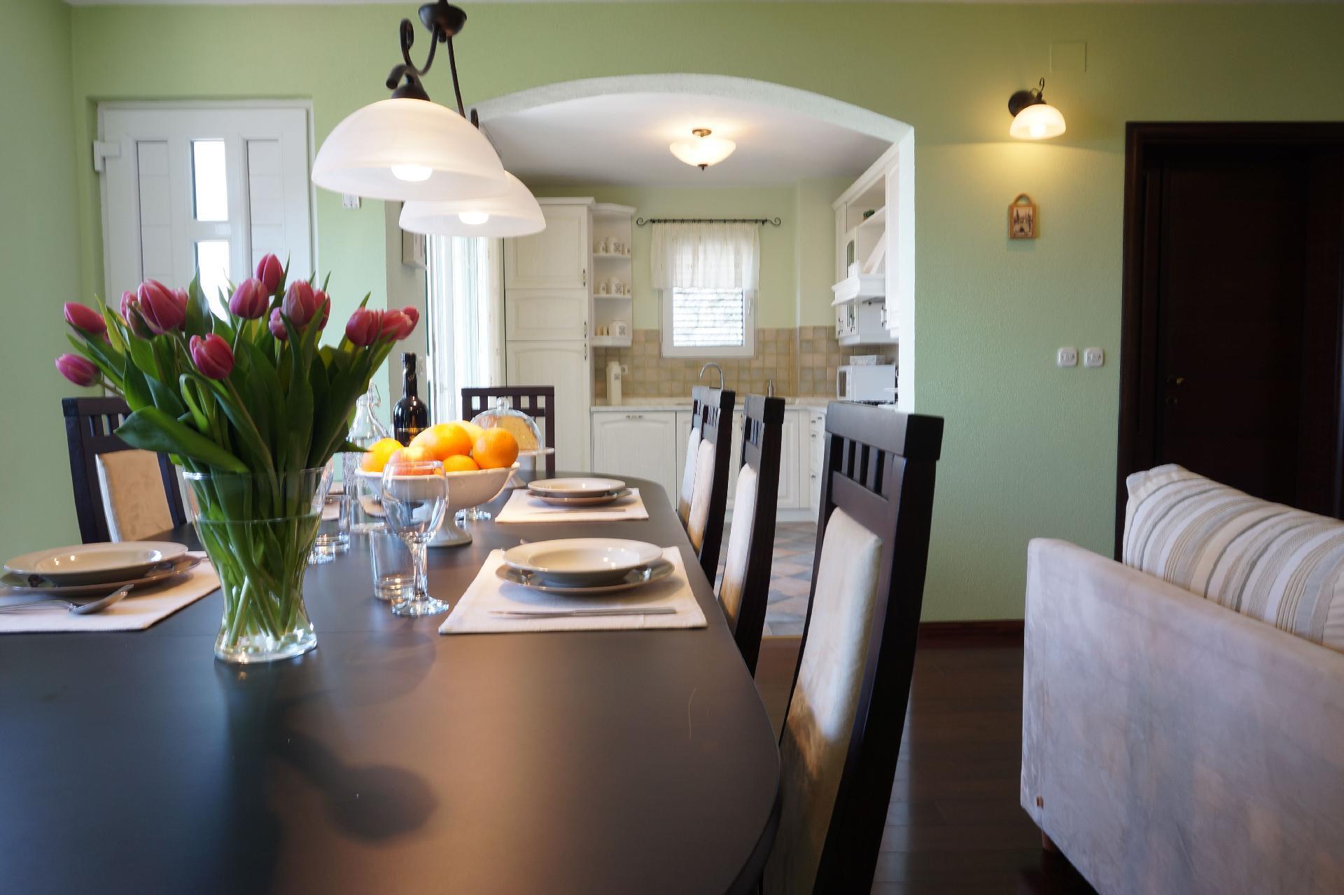 Das Erdgeschoss besteht aus folgenden Räumen: Badezimmer (WC, Dusche); Abstellraum mit Waschmaschine; ein offener Loungebereich. Dort finden Sie eine voll ausgestattete Küche im romantischen Stil (Backofen, Waschmaschine, Kühlschrank, Gefrierfach, Toaster, Wasserkocher, Mikrowelle und andere Einrichtungen), einen Essbereich (für mehr als 10 Personen) und ein Wohnzimmer mit einem charmanten Kamin, in dem Sie sich befinden Sie können auf einem gemütlichen Sofa entspannen, fernsehen (Flachbildschirm, Kabelfernsehen) oder Brettspiele spielen, die Ihnen zur Verfügung stehen.