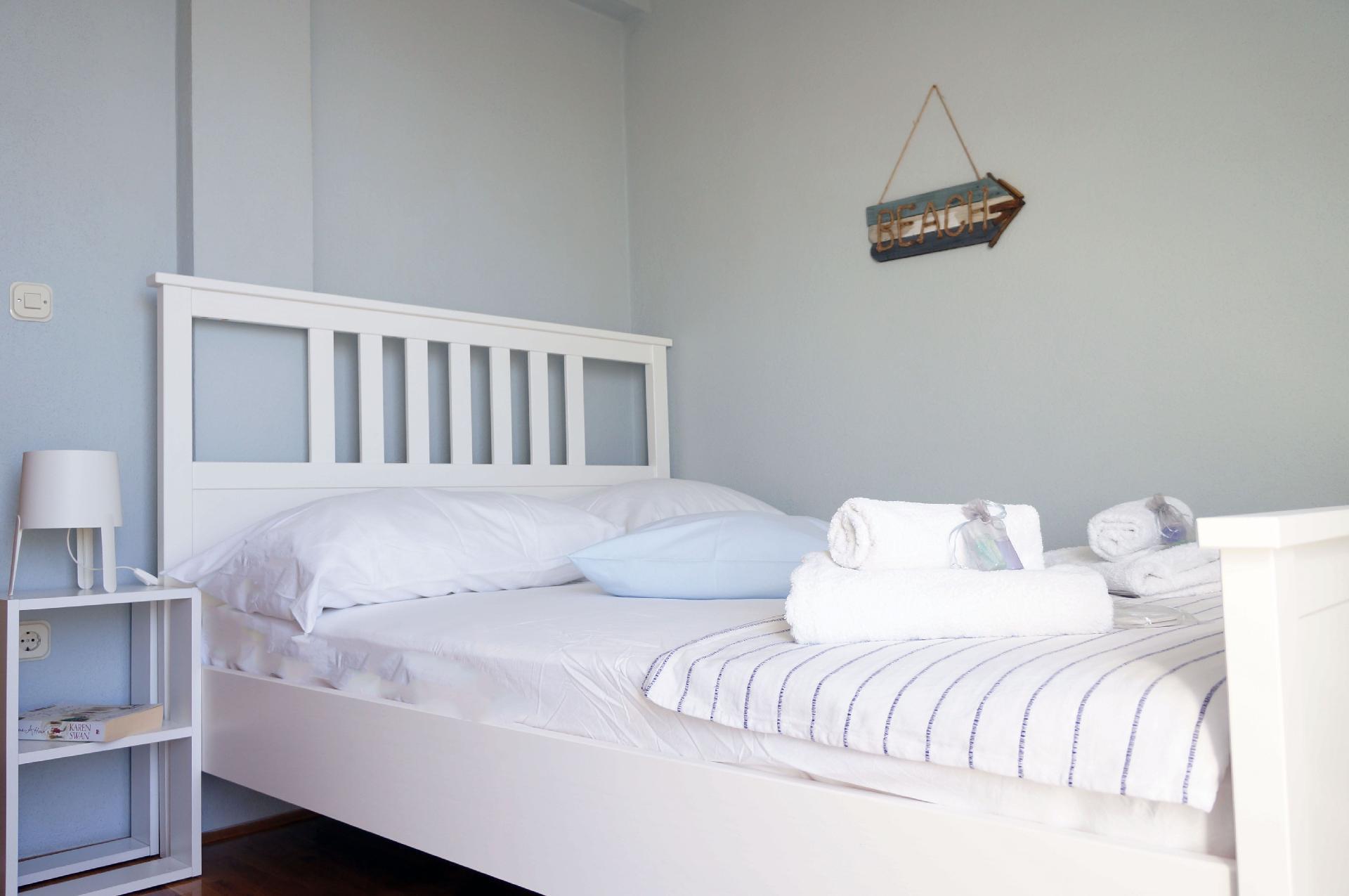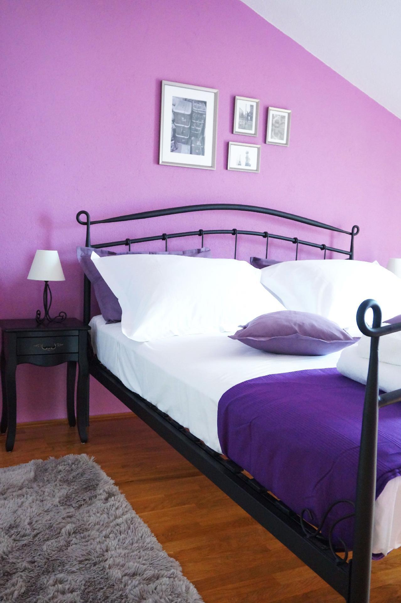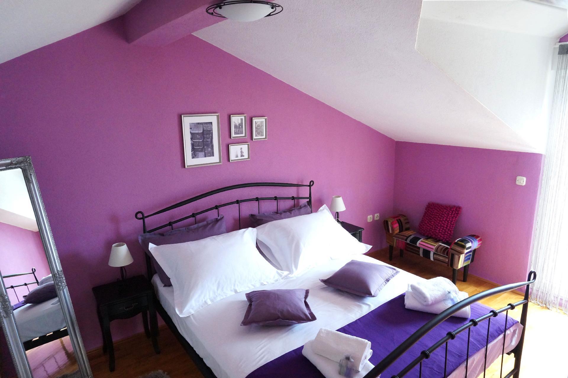 Die Innentreppe verbindet das Erdgeschoss mit zwei Obergeschossen. Im ersten Stock gibt es eine weitere voll ausgestattete moderne Küche mit einem Tisch für vier Personen, einen Balkon, ein stilvolles Wohnzimmer (Klimaanlage, Flachbildfernseher), ein Badezimmer (mit Dusche) und ein erstes Hauptschlafzimmer mit Kingsize-Bett Bett (Pfirsichzimmer). Der zweite Stock (klimatisiert) besteht aus einem dritten Badezimmer (Whirlpool-Badewanne), einer kleinen Sitzecke, einem zweiten Hauptschlafzimmer mit einem Kingsize-Bett und einem geräumigen Schrank mit Schiebetüren (Purple Room) und ein drittes Schlafzimmer mit einem Queensize-Bett (Blue Room). Beide Zimmer haben direkten Zugang zur Dachterrasse mit Liegestühlen und herrlicher Aussicht.