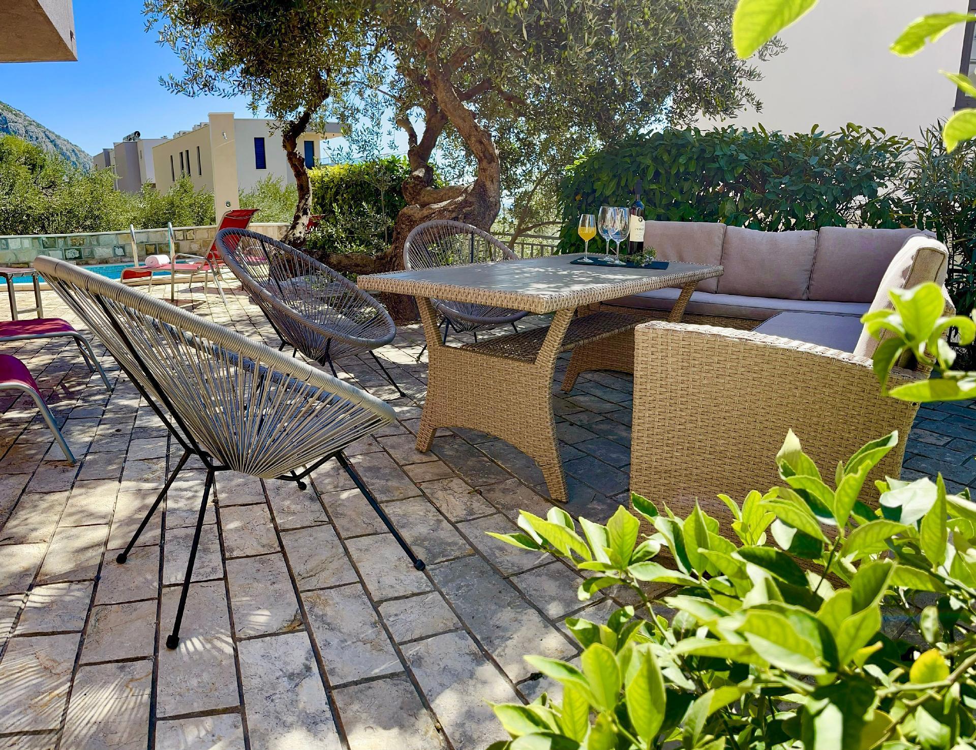 Im oberen Außenbereich finden Sie zwei große Terrassen, die nur Ihnen zur Verfügung stehen. Der ebenfalls private Pool (21 m²), auf der unteren Ebene, bietet eine Liegefläche (ca. 100 m²) mit Sonnenliegen. Zur alleinigen Verfügung steht zudem ein Grill. Die Aussicht auf das Meer und die Inseln Hvar und Brac ist wunderschön. Es bestehen Parkmöglichkeiten auf dem Grundstück.