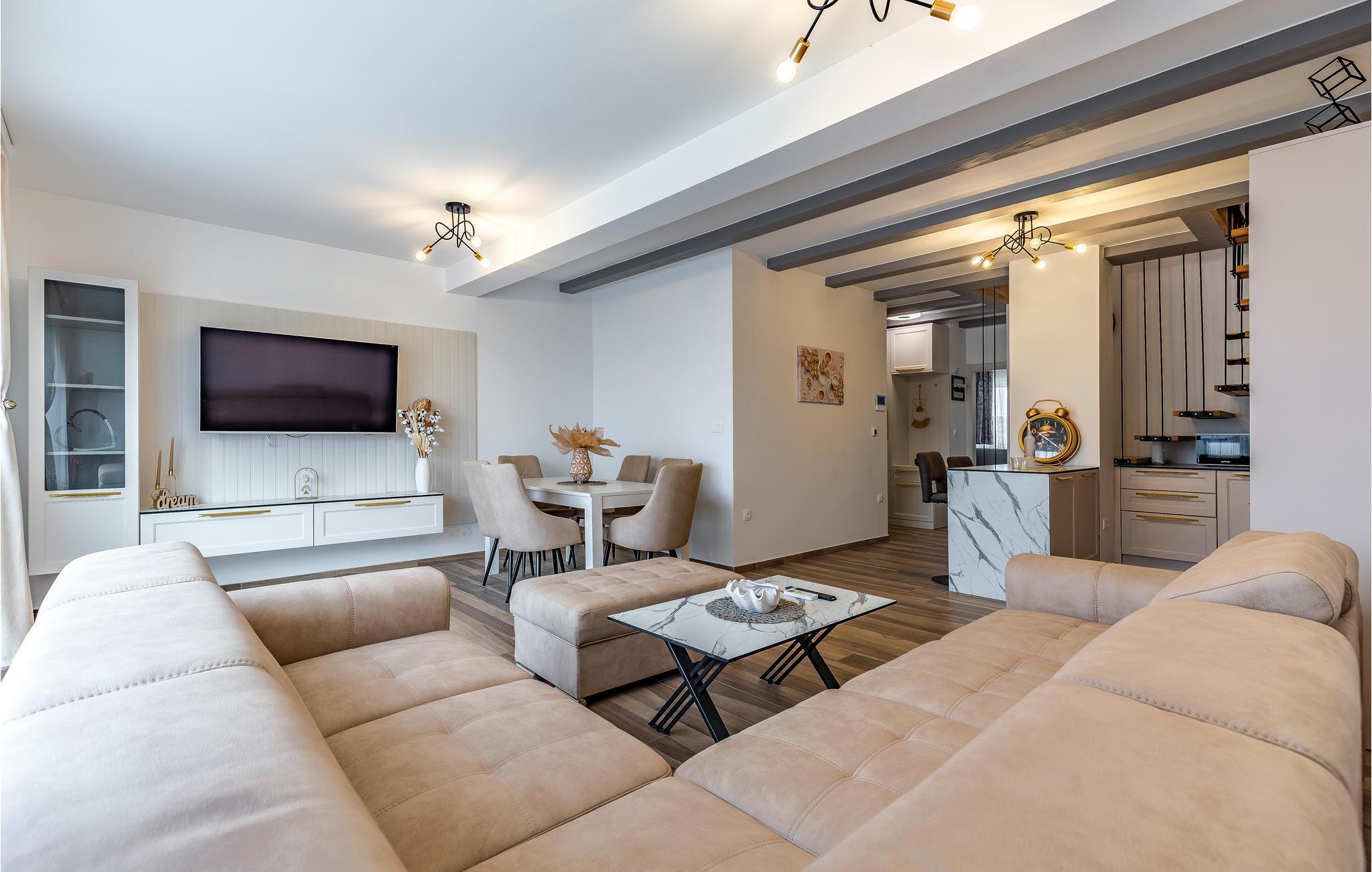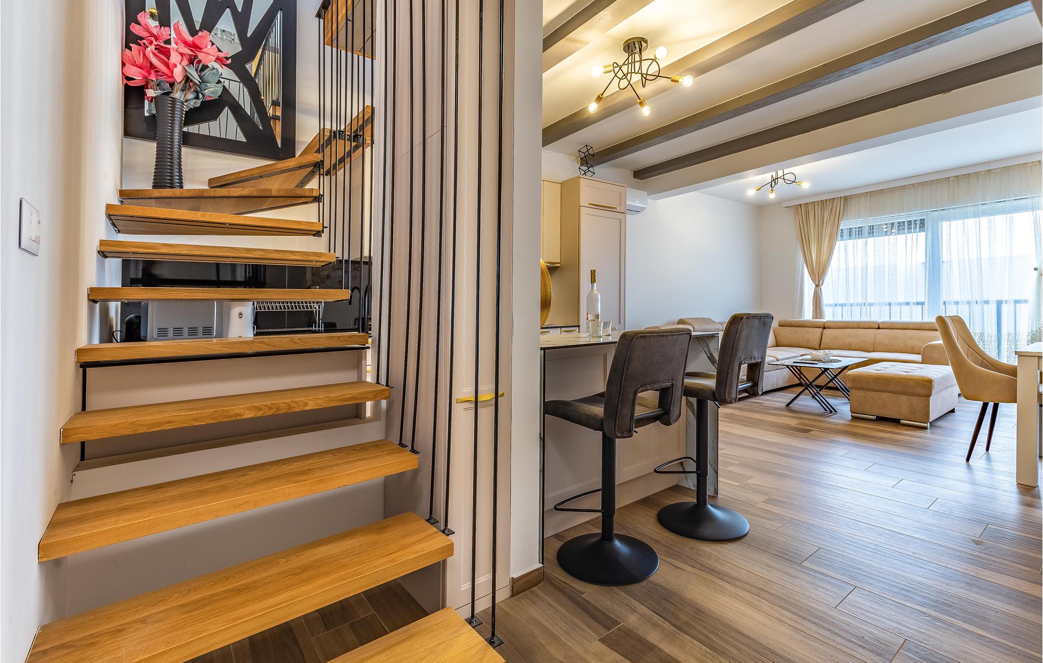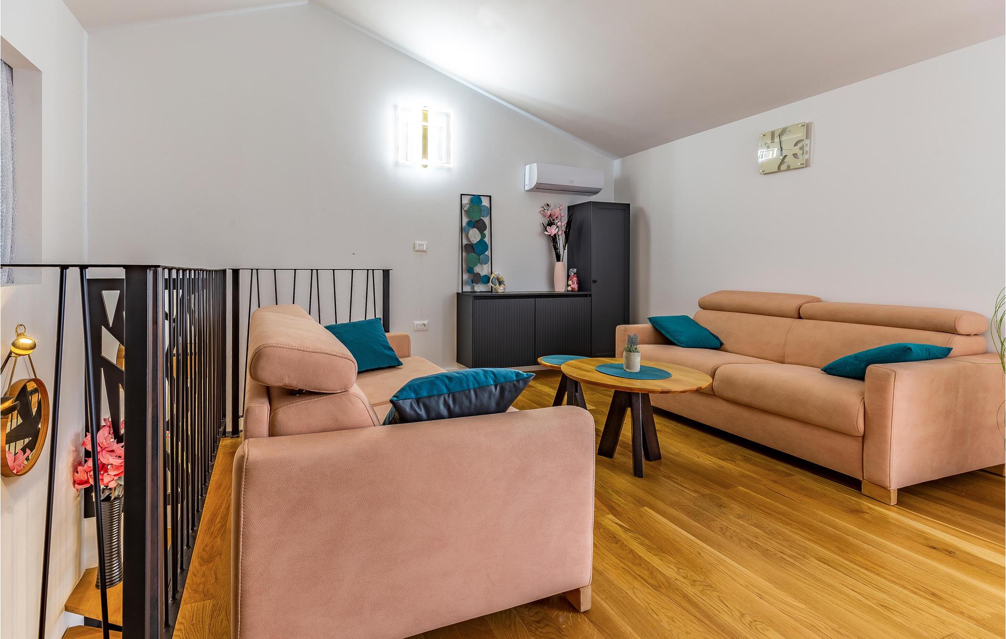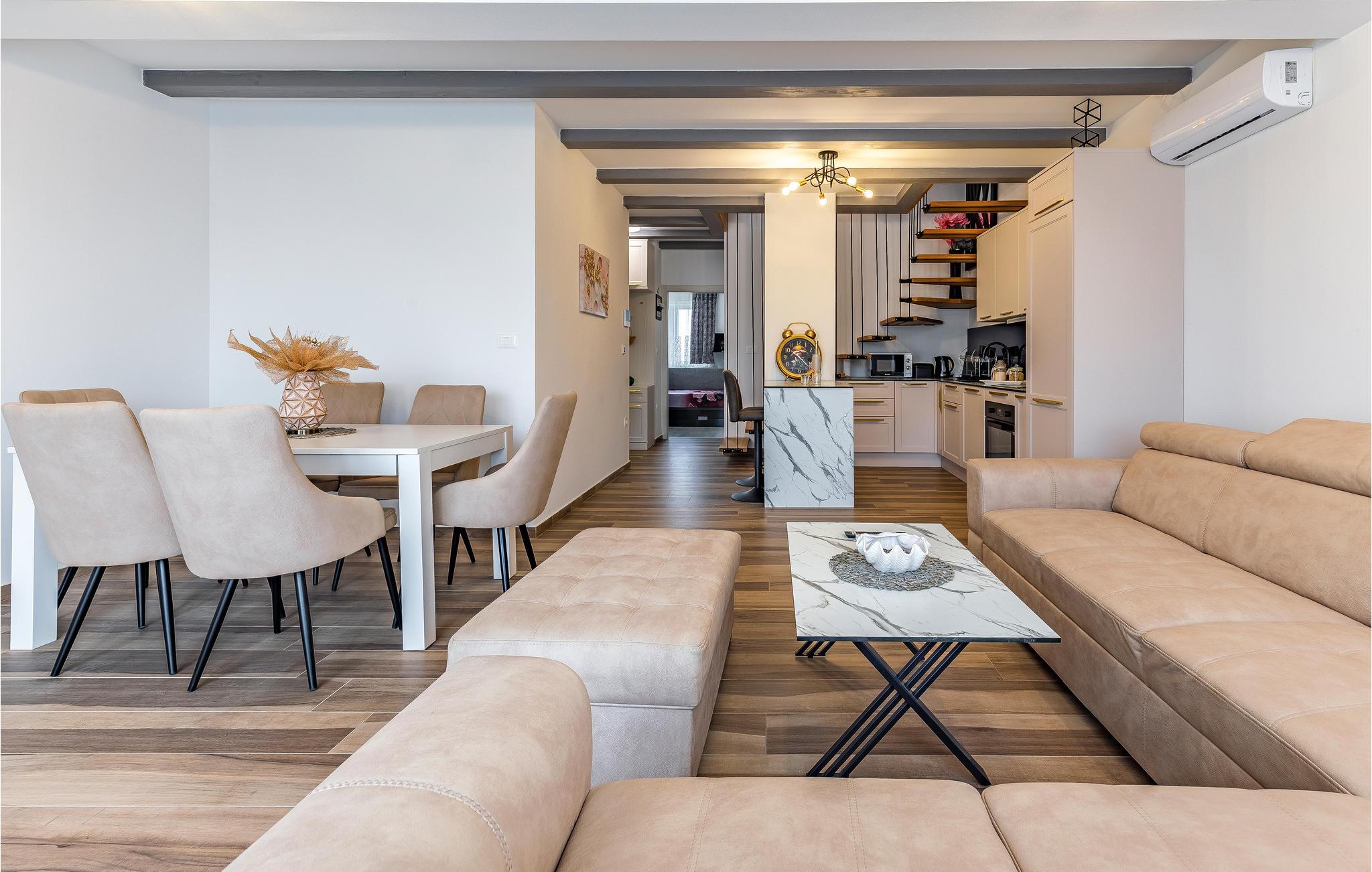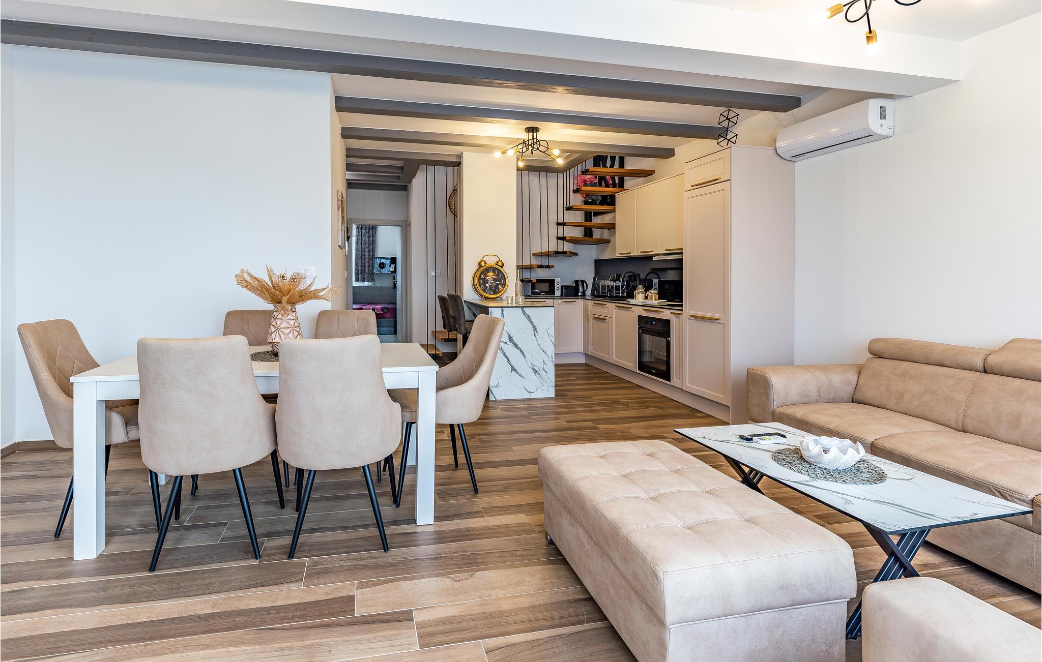 Freuen Sie sich mit Ihrer Großfamilie auf Ihren Urlaub in dieser modernen und komfortablen Wohnung. Auf zwei Etagen können Sie es sich gutgehen lassen und eine entspannte Atmosphäre in der Unterkunft genießen. Erholen Sie sich hier von Ihrem hektischen Alltag und lassen Ihre Alltagssorgen hinter sich und entspannen sich beim gemeinsamen Kochen, Spielen und Filmschauen. Ein Balkon und eine Dachterrasse bieten Ihnen optimale Bedingungen die Zeit bei einer Tasse Kaffee, einem außergewöhnlicher Meerblick und in der Sonne zu genießen.