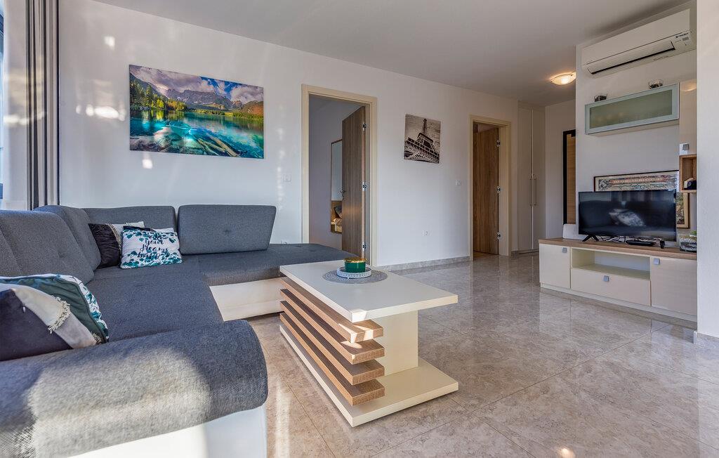 Diese behagliche und lichtdurchflutete Ferienwohnung begrüßt Sie mit einem modernen Interieur im beliebten Küstenort Medulin – nur wenige Schritte vom Sandstrand entfernt. Zaubern Sie in der offenen Küche leckere Gerichte und planen Sie Ihre Unternehmungen am einladenden Esstisch. Nach einem langen Tag lockt eine gemütliche Sofalandschaft – vertiefen Sie sich hier in Ihre Urlaubslektüre oder widmen Sie sich Ihren Liebsten bei einem Spieleabend.