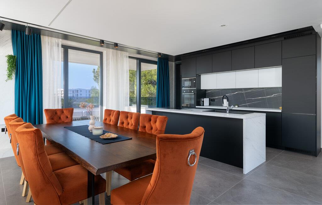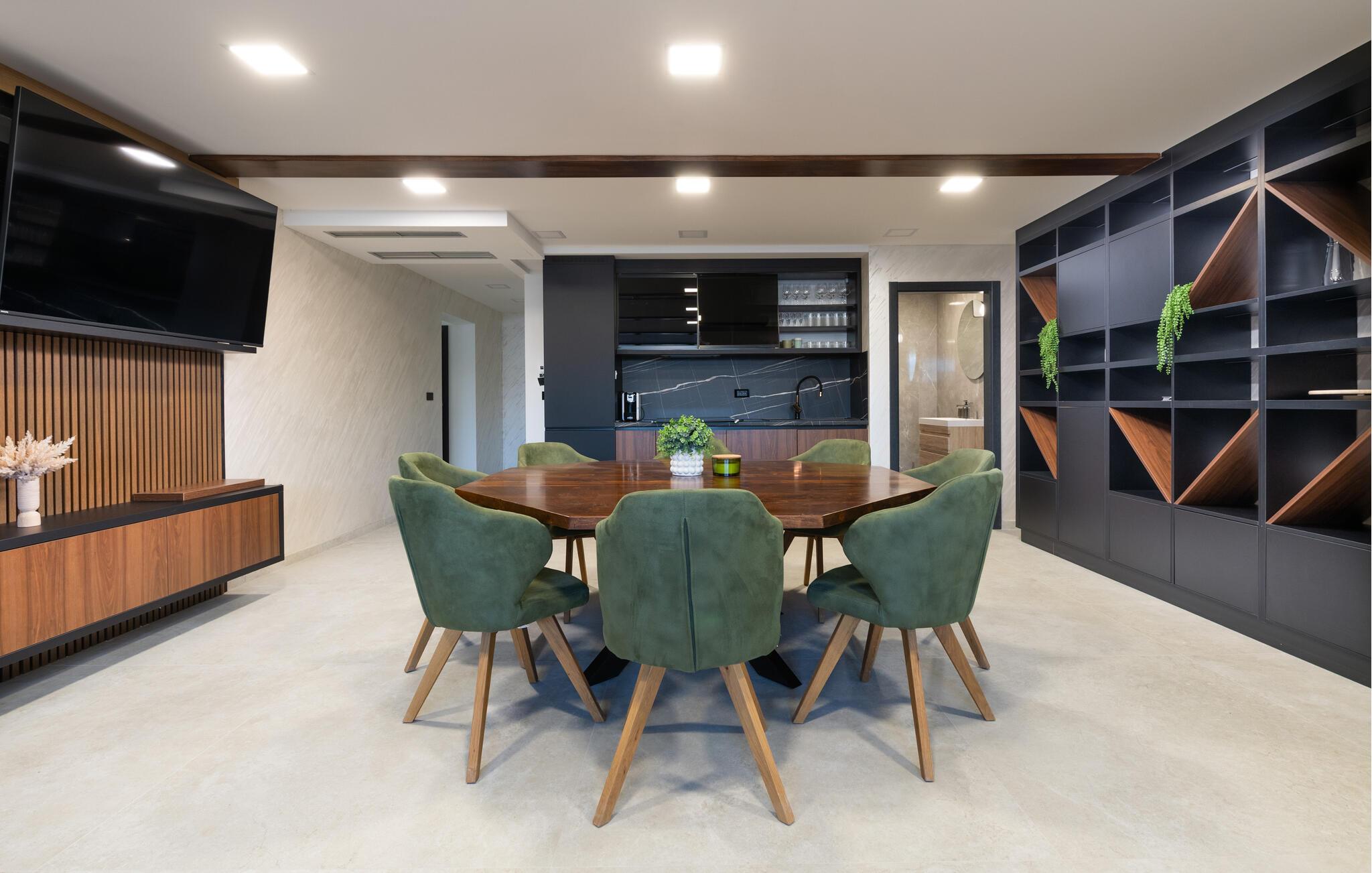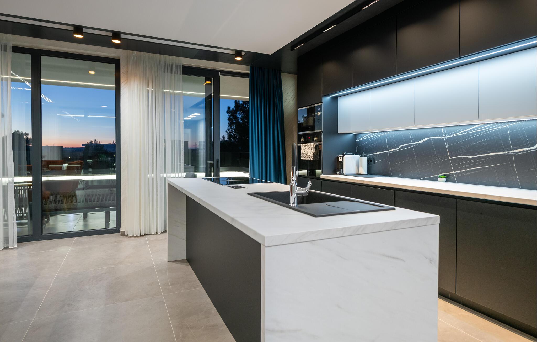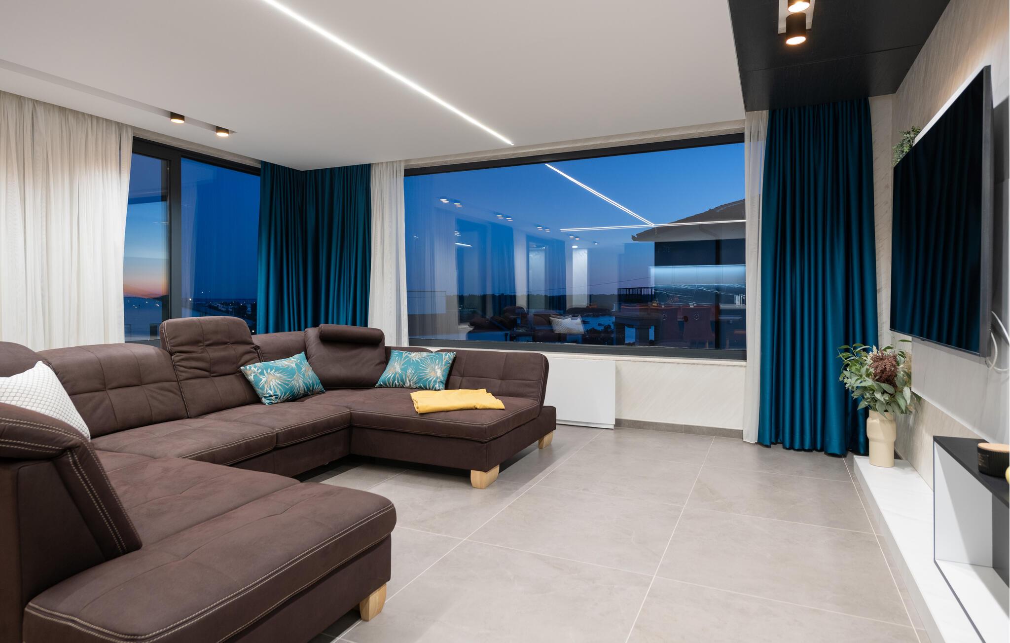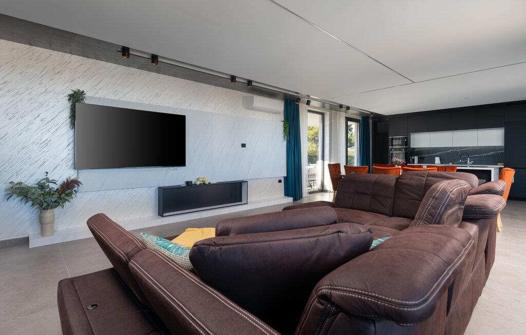 Tanken Sie neue Energie in dieser stilvollen Villa, die modernes Ambiente mit zeitloser Eleganz verbindet. Dank der bodentiefen Fenster fällt der Blick immer wieder auf das Meer, die mediterrane Umgebung und den fantastischen Poolbereich. Machen Sie es sich auf den hochwertigen Sofas gemütlich, schmökern Sie in einem spannenden Buch, genießen Sie einen Film oder entspannen Sie ganz in Ruhe bei einem Glas Wein. In der geschmackvollen Designküche lassen sich kulinarische Highlights zaubern – ideal für genussvolle Abende im kleinen oder großen Kreis.