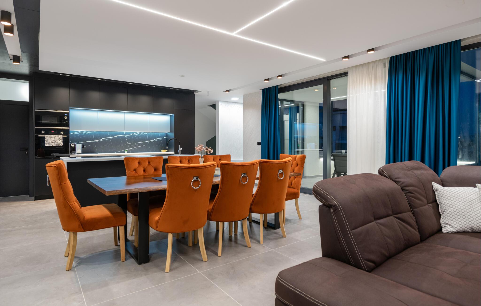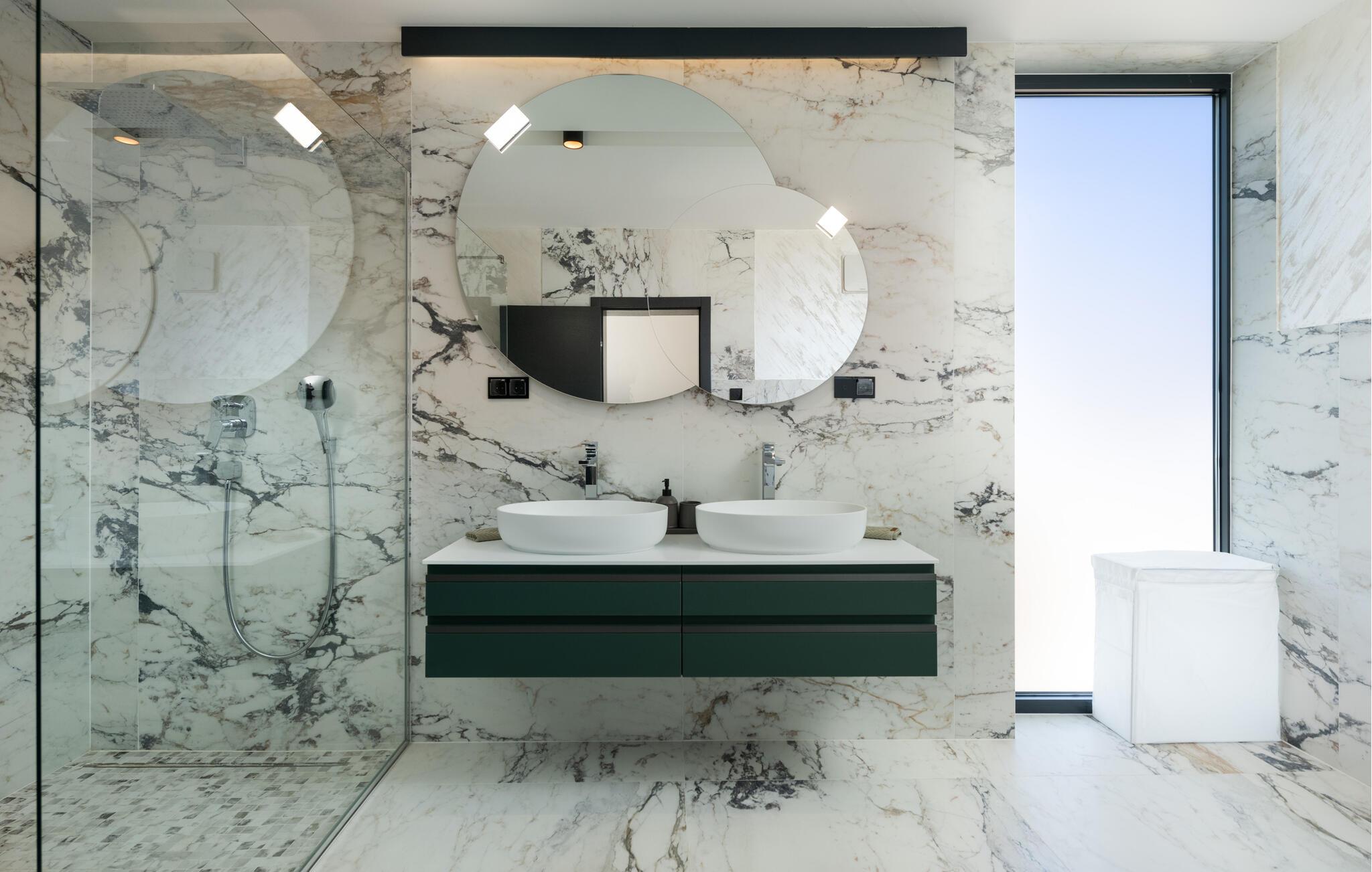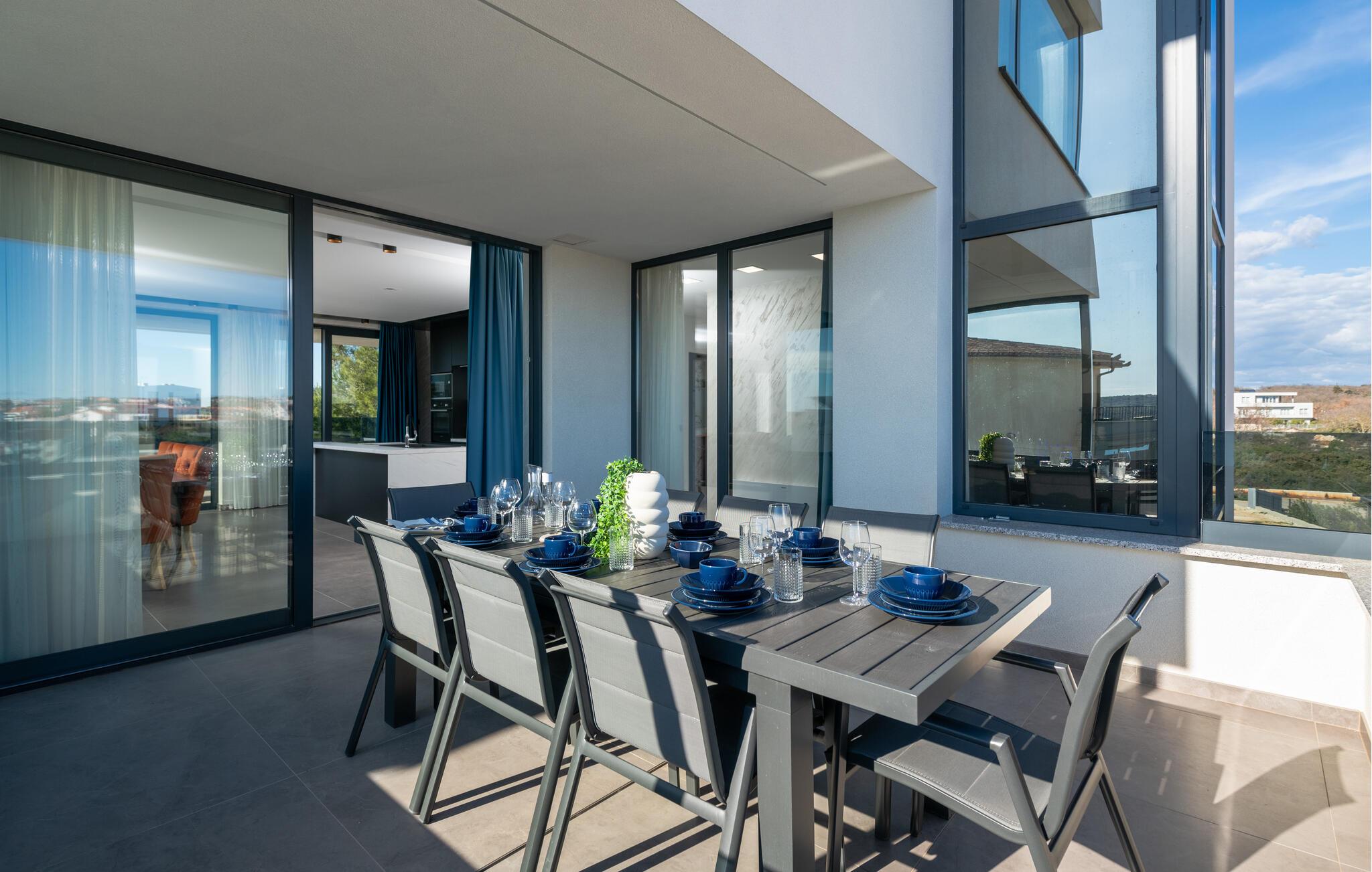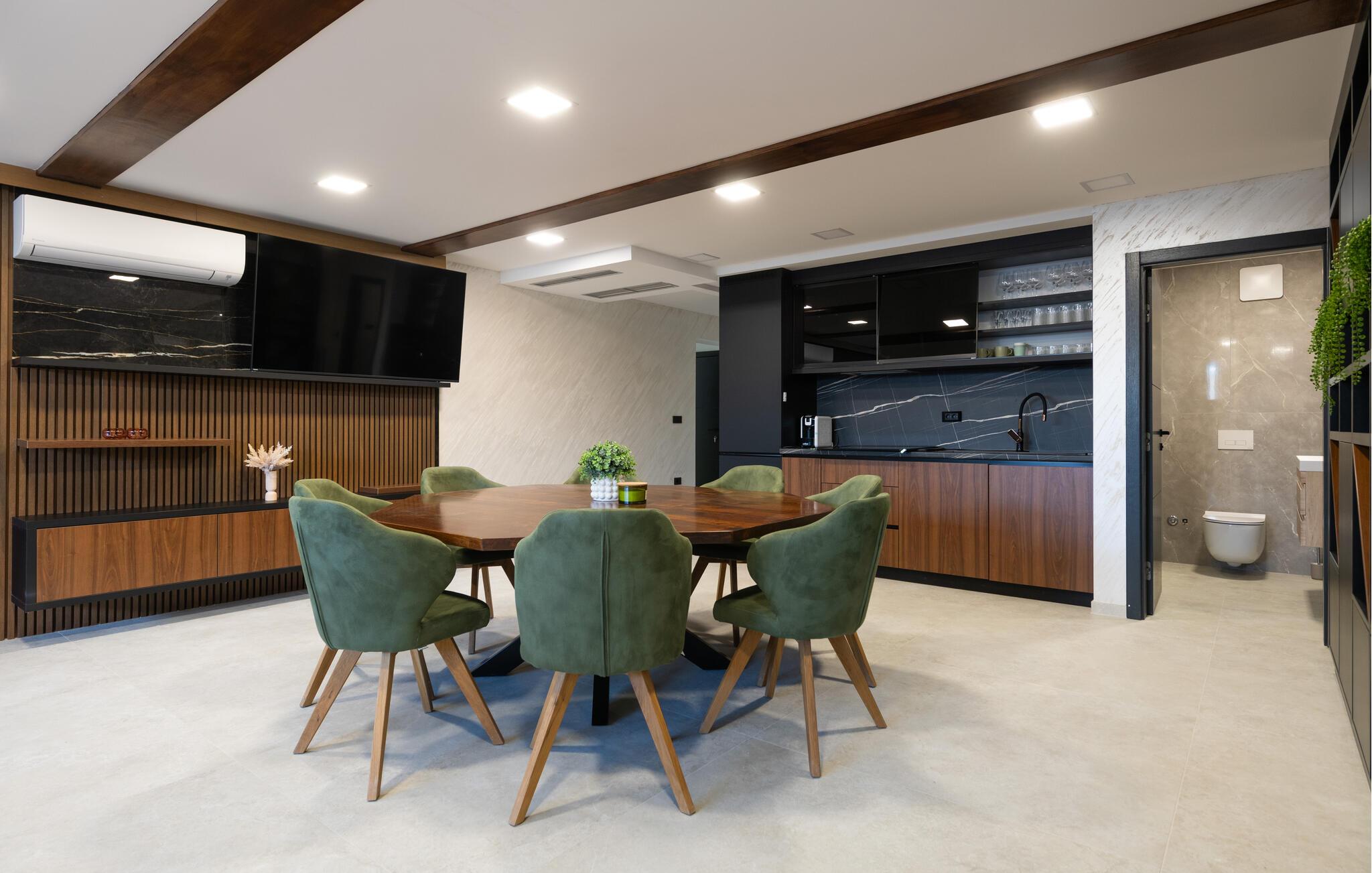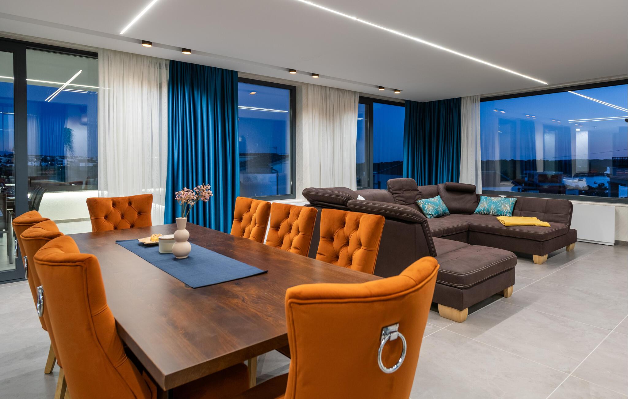 Tanken Sie neue Energie in dieser stilvollen Villa, die modernes Ambiente mit zeitloser Eleganz verbindet. Dank der bodentiefen Fenster fällt der Blick immer wieder auf das Meer, die mediterrane Umgebung und den fantastischen Poolbereich. Machen Sie es sich auf den hochwertigen Sofas gemütlich, schmökern Sie in einem spannenden Buch, genießen Sie einen Film oder entspannen Sie ganz in Ruhe bei einem Glas Wein. In der geschmackvollen Designküche lassen sich kulinarische Highlights zaubern – ideal für genussvolle Abende im kleinen oder großen Kreis.
