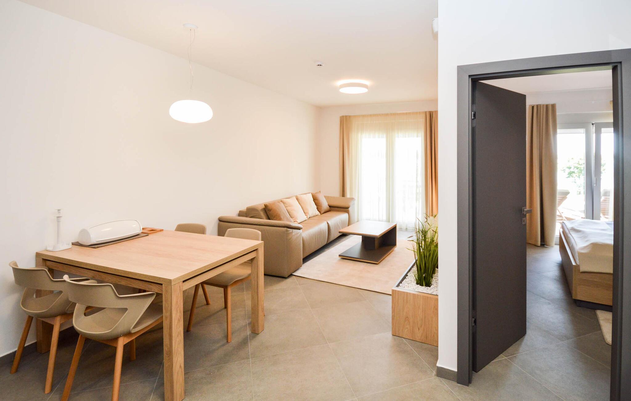Genießen Sie eine sonnige Auszeit in dieser komfortablen Ferienwohnung mit Meerblick und Zugang zum Privatstrand.