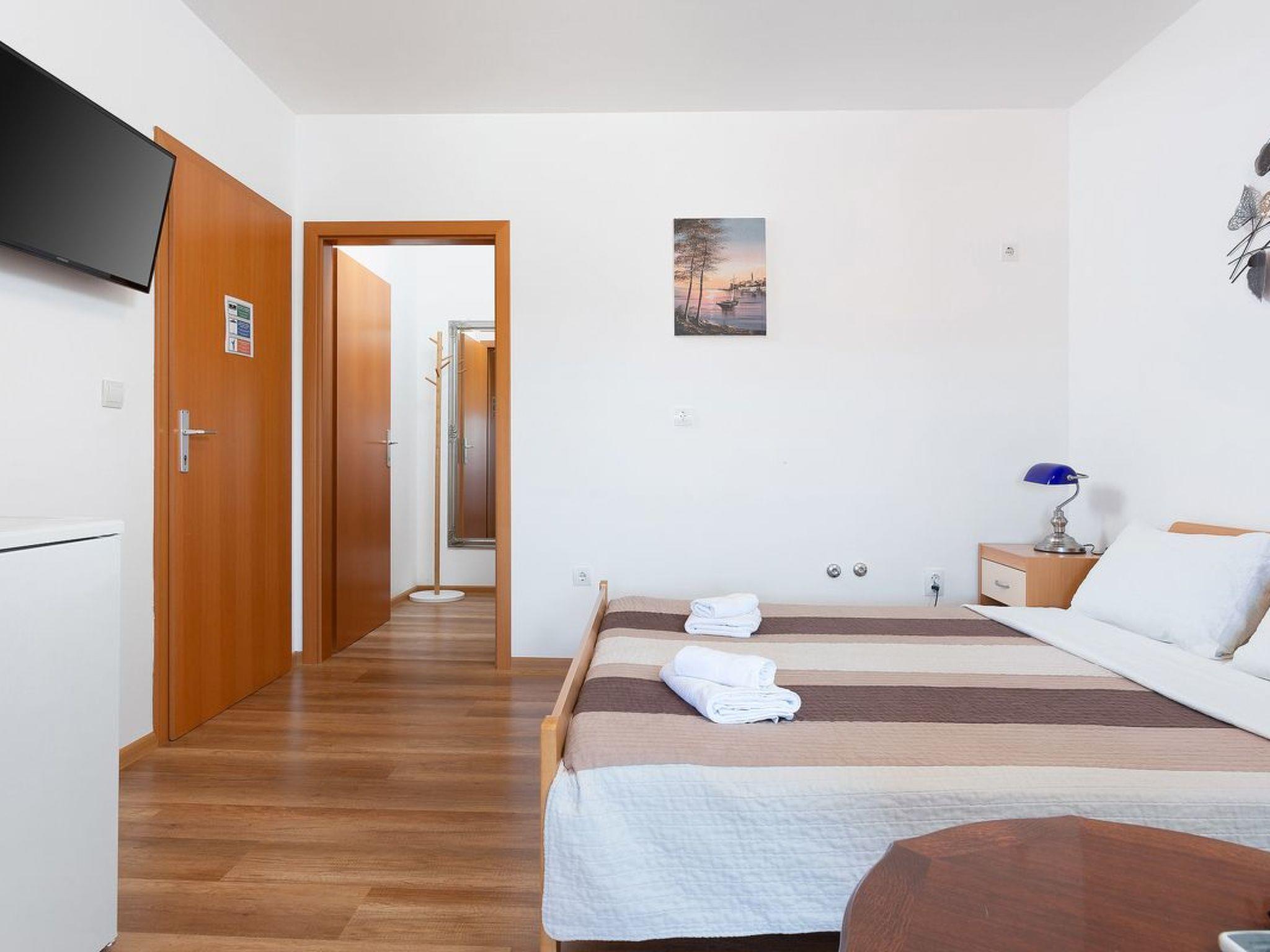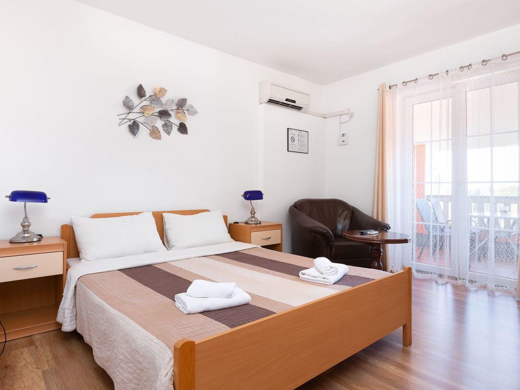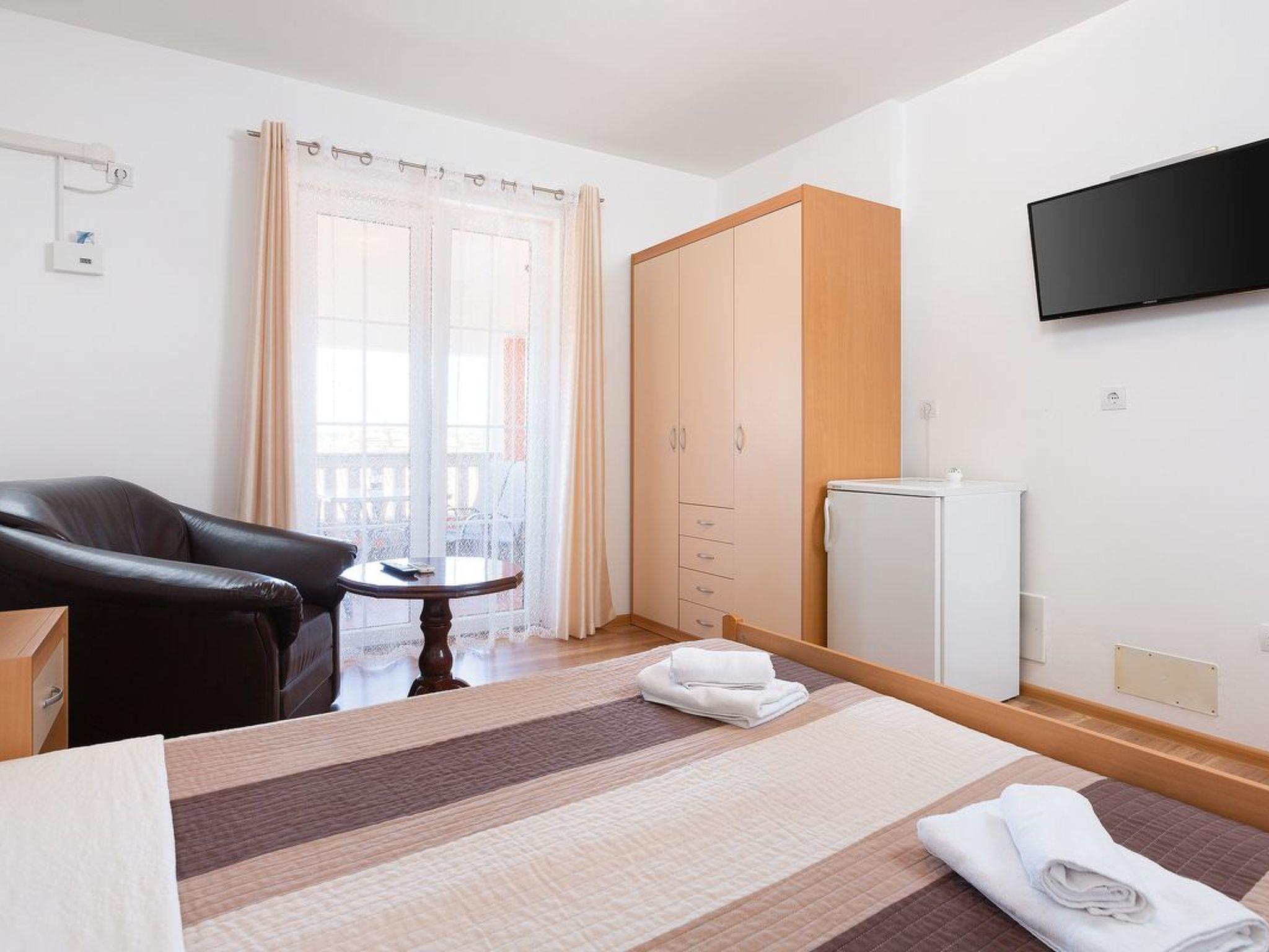 Dies ist ein kleines und hübsch eingerichtetes Schlafzimmer für zwei Personen im ersten Stock. Es verfügt über ein Doppelbett, SAT/TV, Klimaanlage, Kühlschrank, Bad und Ausgang zum Balkon, wo die Gäste den schönen Meerblick in der Ferne genießen können. Die Gäste haben auch Bettwäsche und Handtücher.