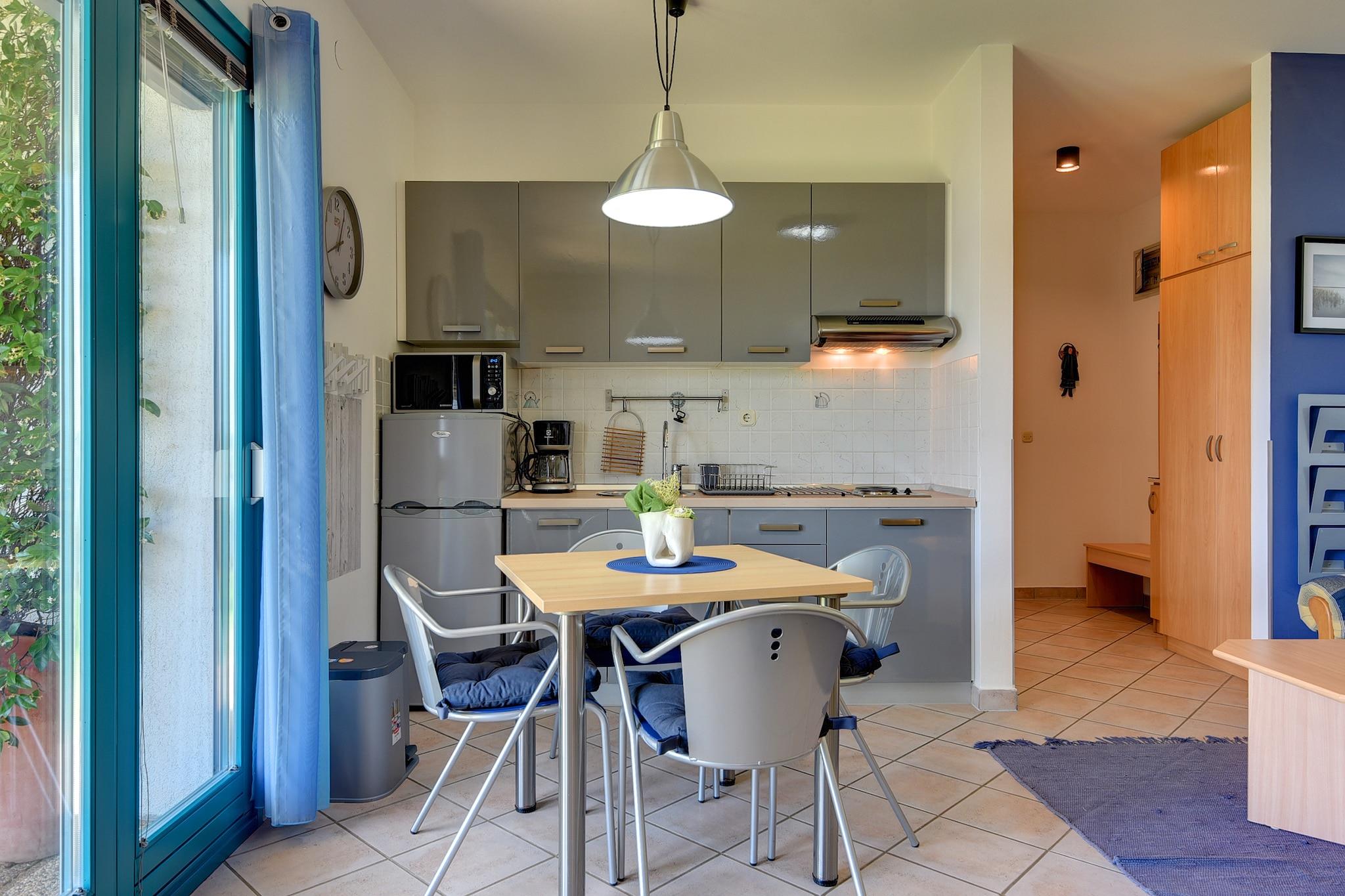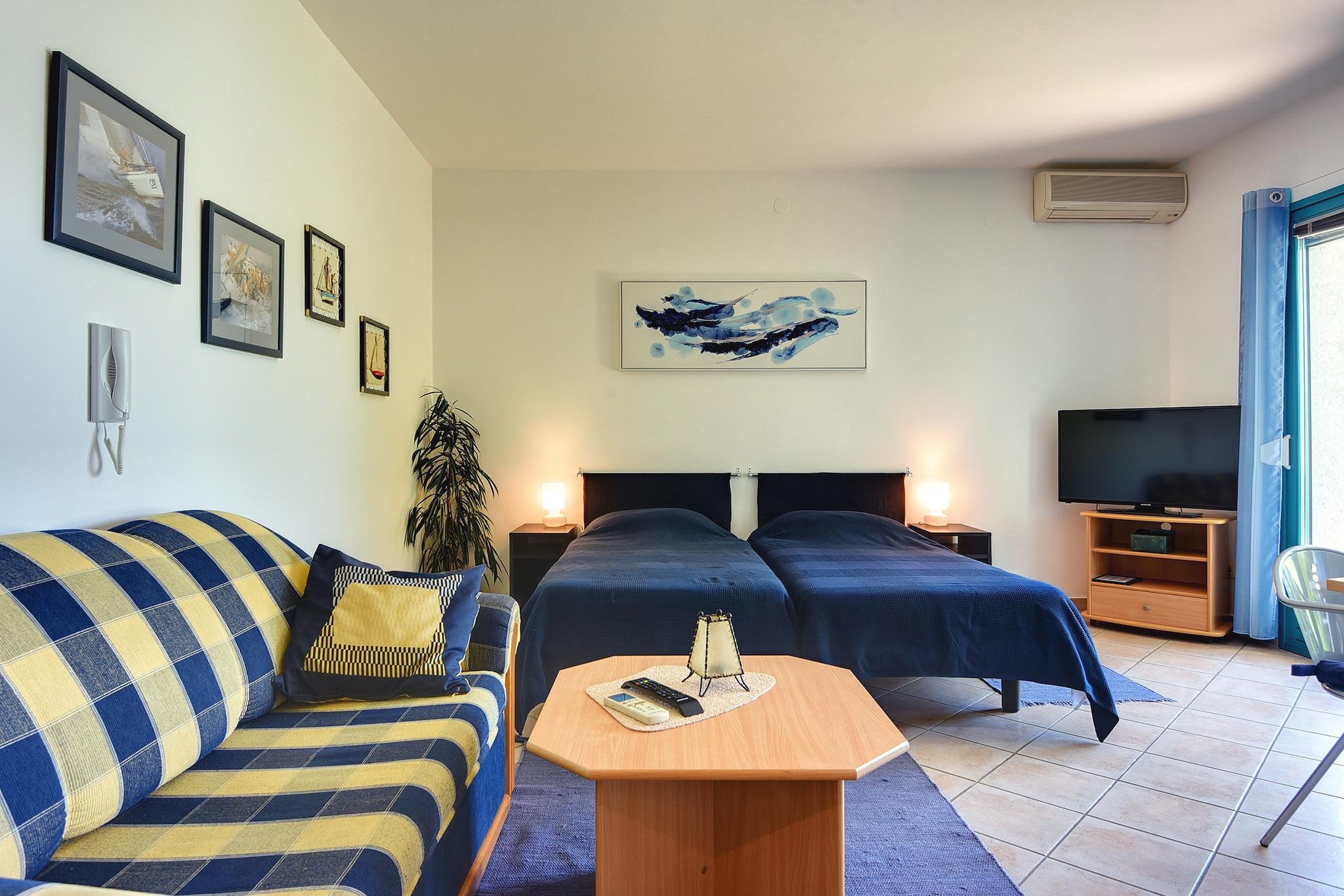 Located in Medulin, this studio bedroom apartment hosts 3 guests and is ideal for a family to enjoy the direct sea view. It features a terrace and air conditioning. You can walk down to the sea that is just round the corner. there are many activities to indulge in like tennis (300 m), watersports (500 m), horse riding (1.5 km), and nightlife (500 m). Enjoy some delicacies from the nearest restaurants at 100 m. This home comes with a living bedroom that is furnished with single sofa bed, double bed, TV, air conditioning, cooker, coffee machine, and fridge-freezer. You can relax with your family on the terrace with garden furniture. You also have access to free WiFi. Airport and train station are both at 10 km and public transport is at 100 m.