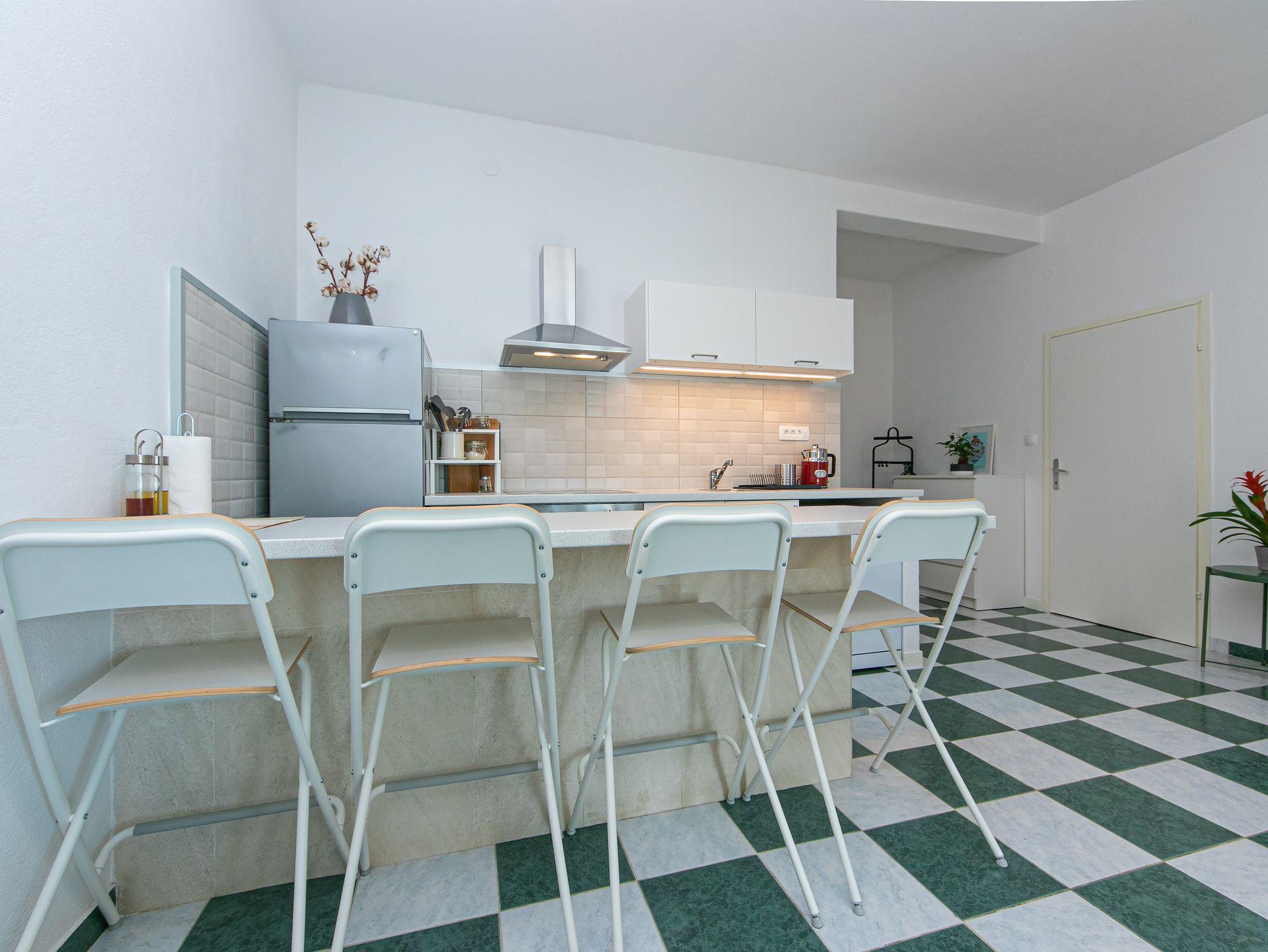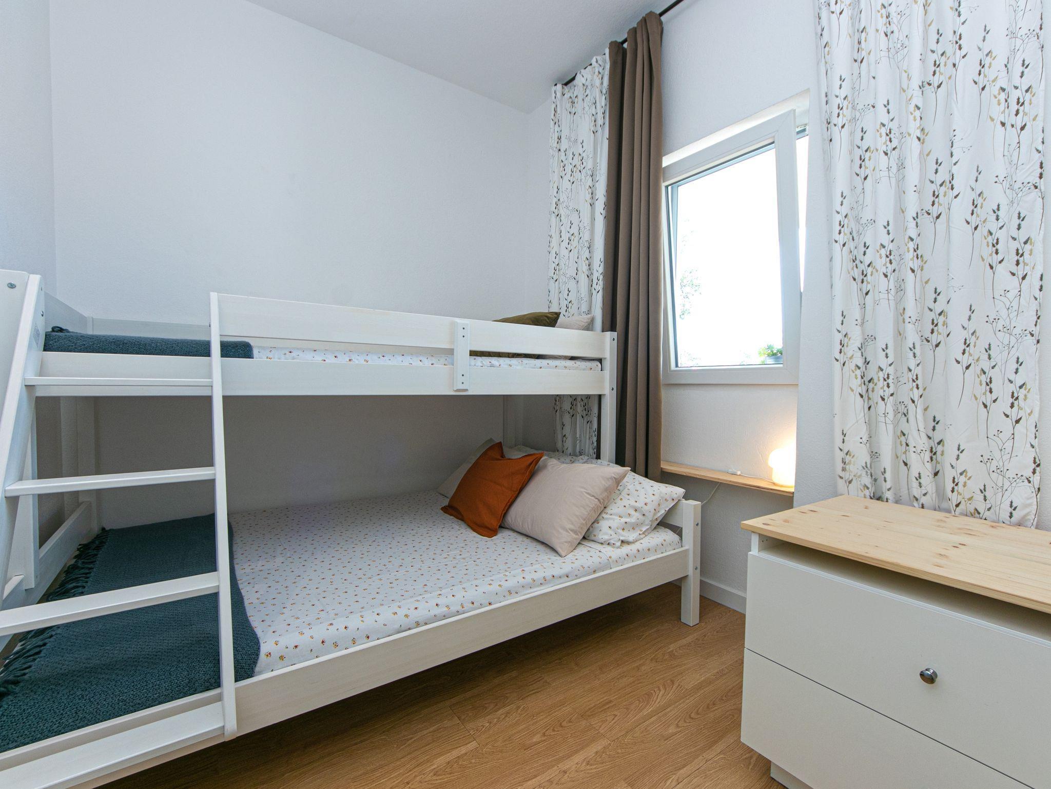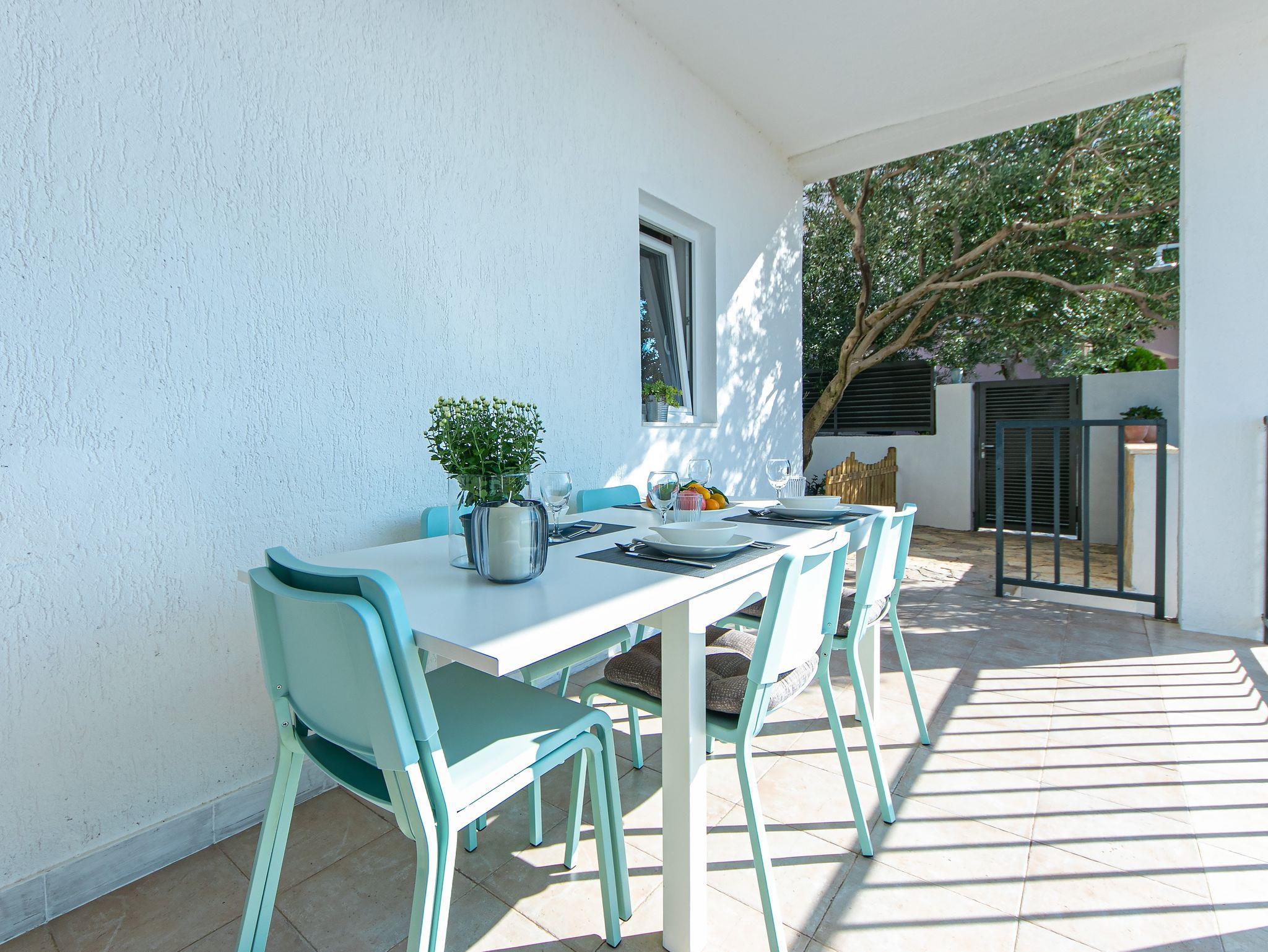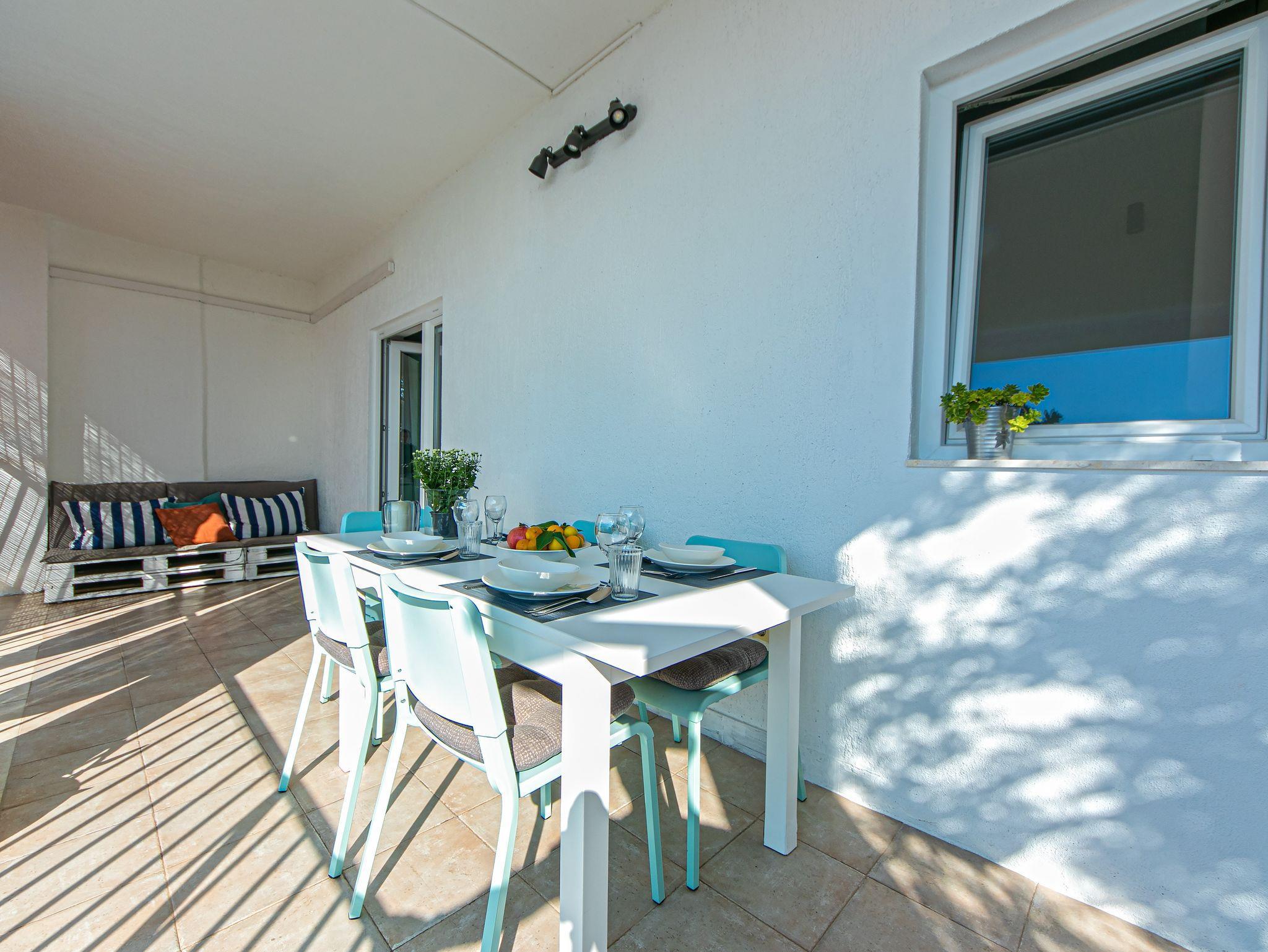 Ferienwohnung bietet Platz für 6 Gäste. Die Betten sind in Schlafzimmern, die es 2 gibt, und in Wohnzimmer, innerhalb einer Gesamtfläche von 49m2, angeordnet. Die Gäste haben eine eigene Terrasse zur Verfügung, auf der sie in warmen Sommernächten genießen können. Das Apartment bietet Meerblick. Es ist erlaubt, Speisen auf dem Gemeinschafts-Grill vorzubereiten. In der Unterkunftseinheit besteht die Möglichkeit des Mitbringens von Haustieren gegen Aufpreis. IM PREIS INBEGRIFFEN: Kurtaxe, Endreinigung, Klimatisierung, Parkplatz, Garage, Internet, Wäschewaschen, Kinderbett, Bügeleisen, Bügelbrett, Föhn, Sonnenschirm. UNVERBINDLICHE ZUSÄTZLICHE KOSTEN: Haustiere (7,00 € pro Nacht), Zusatzbett (25,00 € pro Nacht). Die Verfügbarkeit zusätzlicher Dienstleistungen in Ihrem reservierten Termin und die Preise derselben (falls nicht aufgeführt) müssen im Voraus überprüft werden. Zusätzliche Dienstleistungen die in der Zahlungsaufforderung nicht aufgeführt sind werden direkt beim Vermieter bezahlt, angenommen der Gast nutzt auch diese. Ermäßigung auf den Grundpreis: Gratistag 14=13 (bei einem Aufenthalt von 14 Tagen oder mehr erhalten Sie einen Gratistag für den Aufenthalt bis 31.12.26).