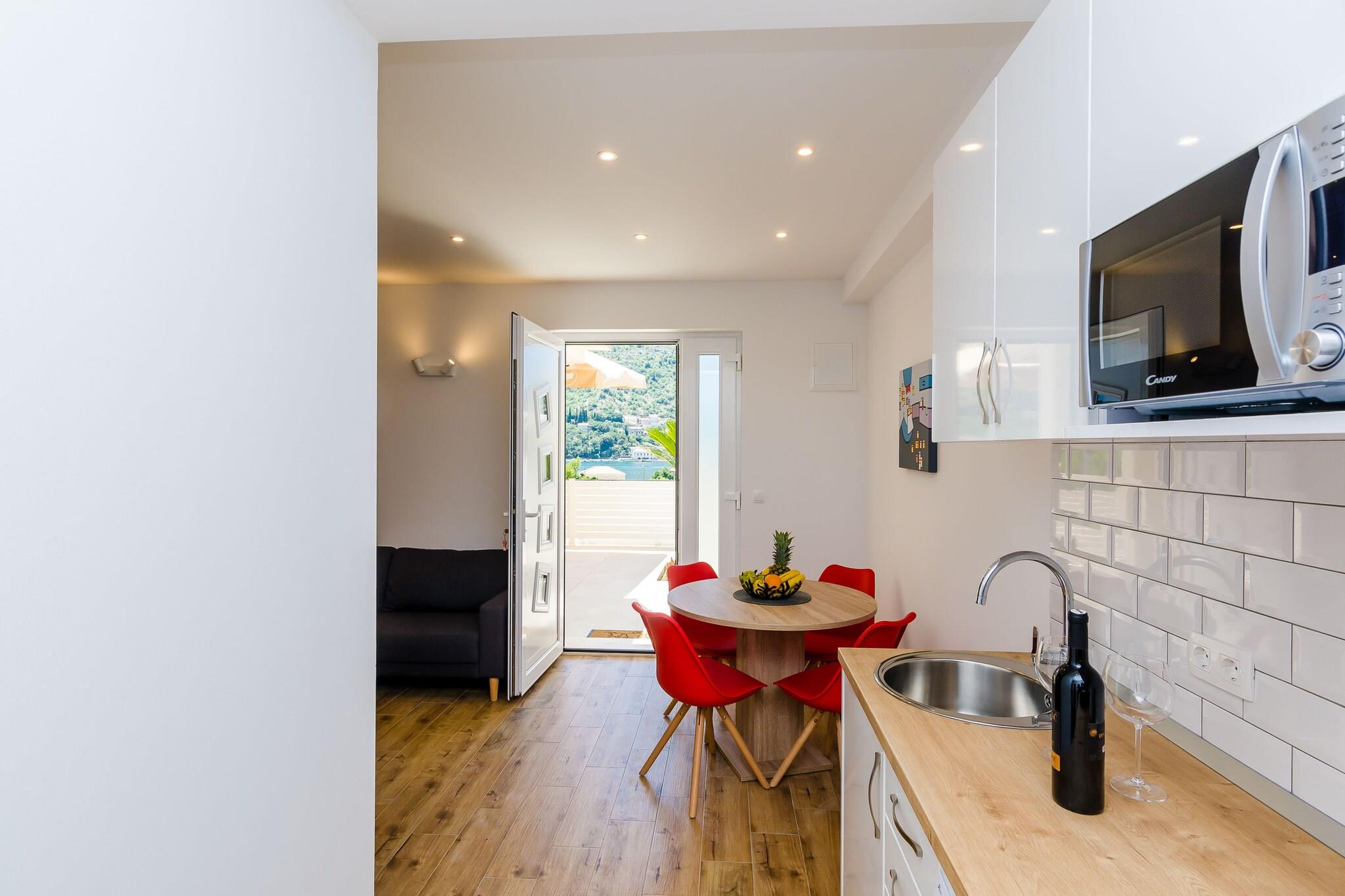 Apartment Moon River offers self-catering accommodation in Mokošica, quite suburban area of Dubrovnik. The apartment consists of two bedrooms, living room, kitchen, private bathroom and furnished terrace. Apartment is air conditioned and free WiFi is provided. Free private parking is available on site and luggage storage is possible prior to check-in. Please note that at restaurant Mediteraneo Sushi Seafood and Mex Cantina Bona Fide as our guest you have 30% discount. This lovely two-bedroom apartment features free WiFi, air conditioning, flat-screen cable & SAT TV, as well as kitchen fitted with stove, oven, refrigerator, freezer, microwave, toaster, water kettle, coffee machine and dishwasher. Private bathroom comes with shower ,hair-dryer and washing machine. Underfloor heating is available in all rooms. The apartment will also provide guests with furnished terrace with outdoor dining area. Iron and ironing board will be at guests' disposal. Apartment Moon River is situated in Mokošica, a quiet suburban neighbourhood just 10 km away from the historic Old Town of Dubrovnik. Surrounded by mountains, Ombla river and Adriatic sea it is a perfect place for a peaceful holiday. Ferry port and main bus station are approximately 6 km away, while Dubrovnik Airport is 27 km away from the apartment.