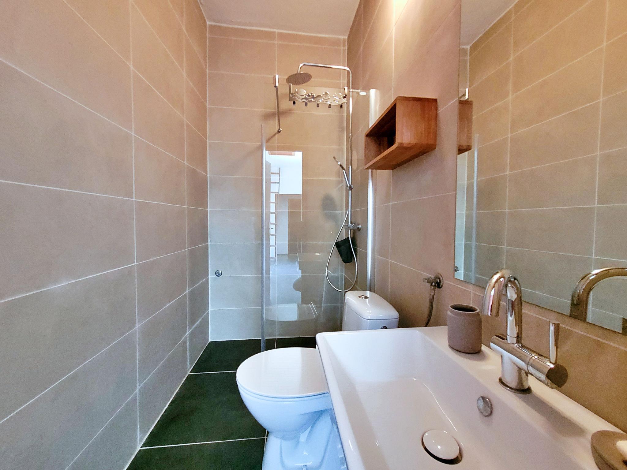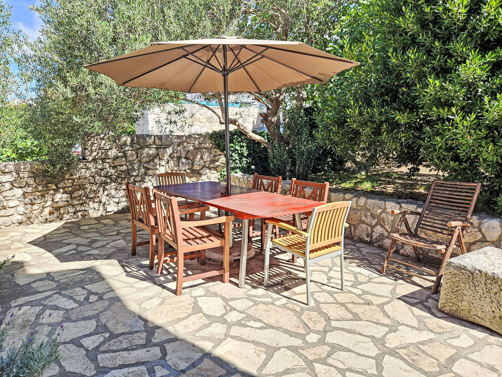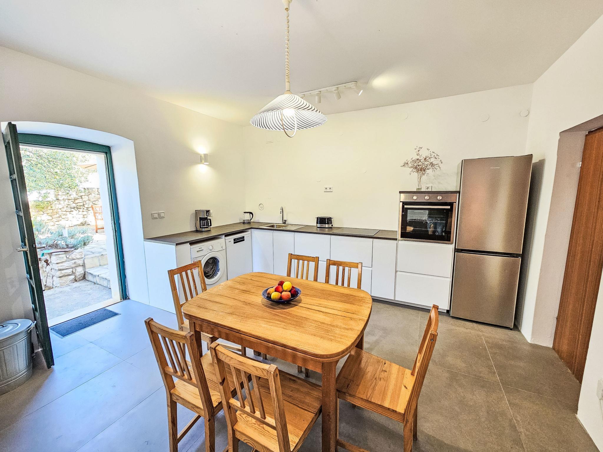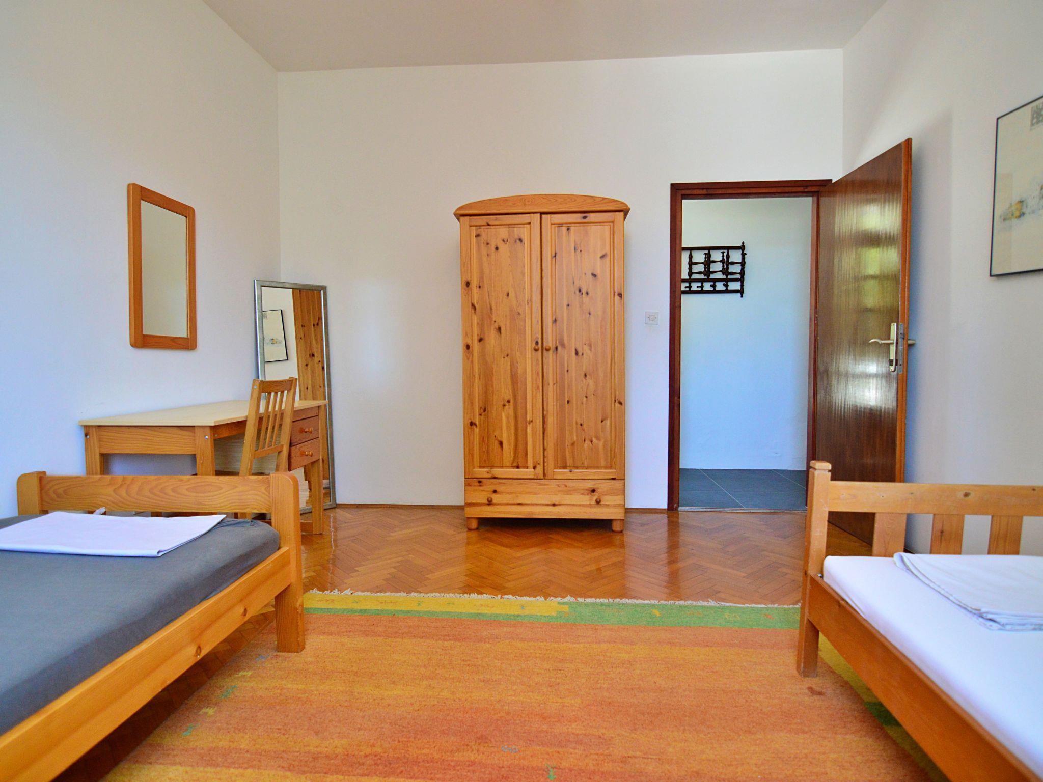 5-Zimmer-Haus 130 m2 auf 2 Stockwerken. Wohnzimmer mit 1 Diwanbett (140 cm, Länge 200 cm), Dusche/WC. Offene Küche (Backofen, Geschirrspüler, 4 Glaskeramikplatten, Toaster, Wasserkocher, Tiefkühler, elektrische Kaffeemaschine) mit Esstisch, Sat-TV und DVD. Ausgang zur Terrasse. Obergeschoss: (Aussentreppe) 1 Zimmer mit 1 franz. Bett (180 cm, Länge 200 cm). 1 Zimmer mit 1 Doppelbett (180 cm, Länge 190 cm). 1 Zimmer mit 2 Betten (90 cm, Länge 200 cm). 2 Duschen/WC. Keine Heizmöglichkeit. Zur Verfügung: Kinderhochstuhl, Babybett (extra). Internet (Wireless LAN, gratis). Bitte beachten: Nichtraucher-Haus. Maximal 2 Haustiere/Hunde erlaubt.