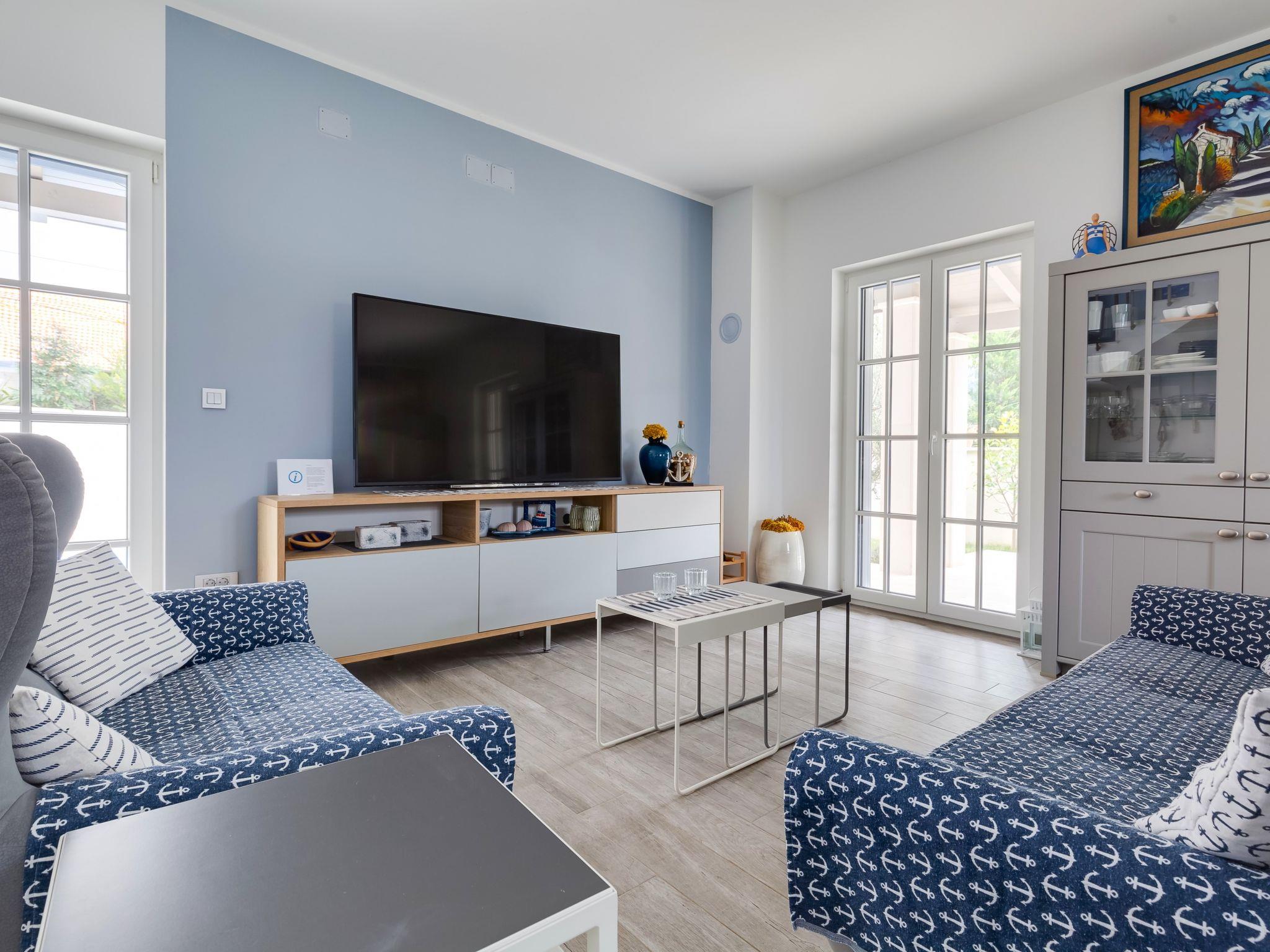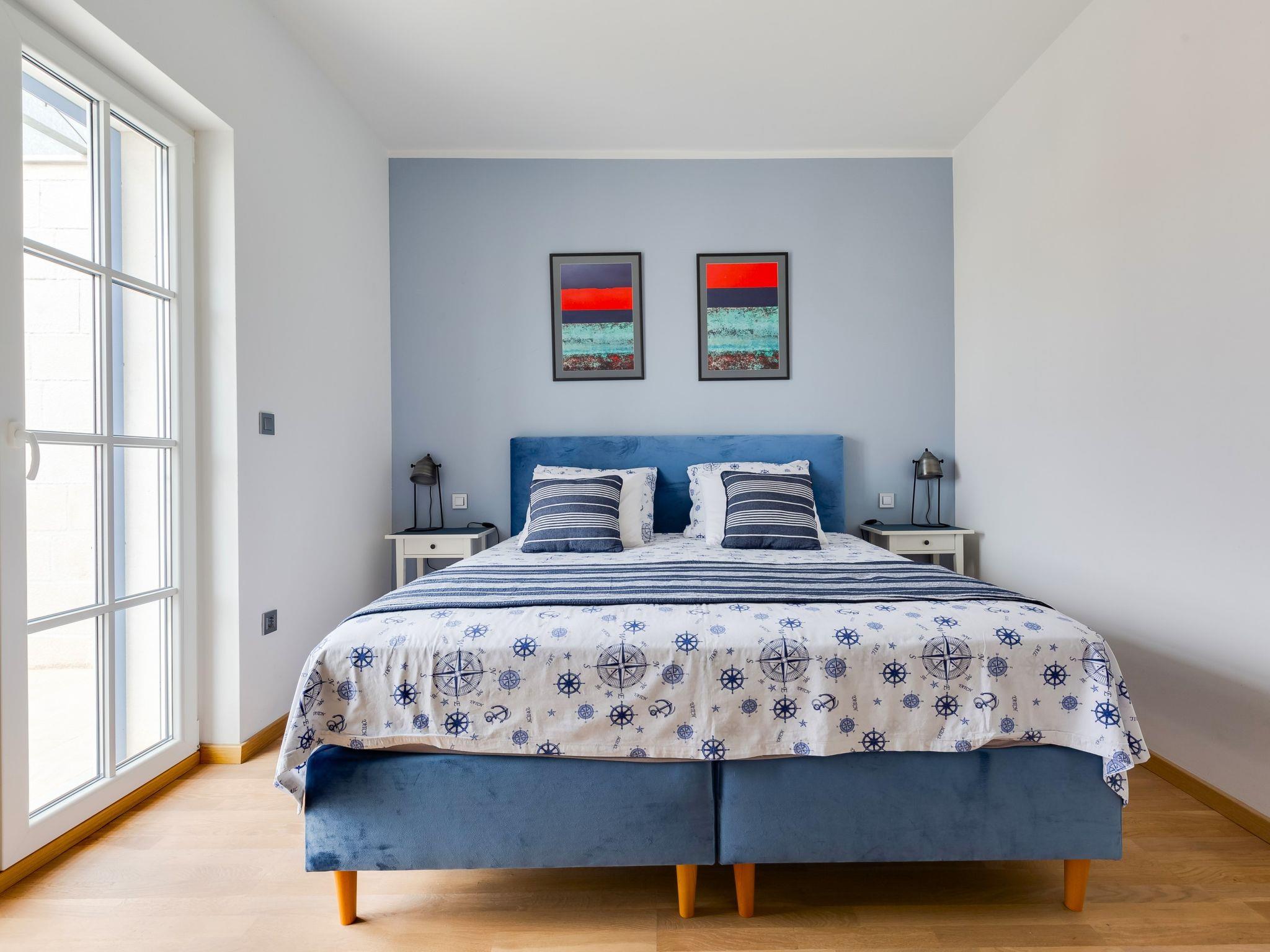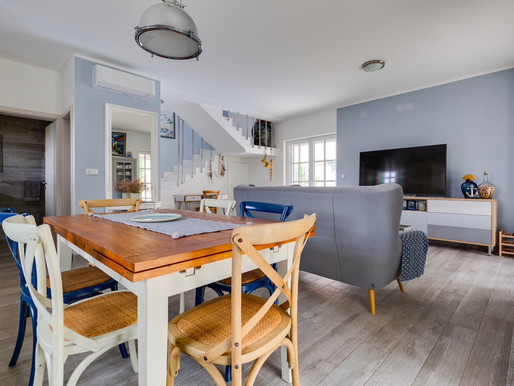 3-Zimmer-Doppelhaushälfte 120 m2 auf 2 Stockwerken. Wohn-/Esszimmer 30 m2 mit 2 Betten (100 cm, Länge 200 cm), TV (Flachbildschirm), Klimaanlage. Ausgang zur Terrasse. Offene Küche (Backofen, Geschirrspüler, 4 Glaskeramikplatten, Toaster, Tiefkühler, elektrische Kaffeemaschine). Ausgang zur Terrasse. Dusche/WC. Obergeschoss: 1 Zimmer mit 1 franz. Bett (200 cm, Länge 220 cm), TV (Flachbildschirm), Klimaanlage. Ausgang zum Balkon. 1 Zimmer mit 2 Betten (100 cm, Länge 200 cm), Klimaanlage. Ausgang zum Balkon. Bad/WC. Keine Heizmöglichkeit. 2 Balkone 6 m2. Terrassenmöbel, Balkonmöbel, Liegestühle. Zur Verfügung: Safe, Bügeleisen, Haartrockner. Internet (Wireless LAN, gratis). Bitte beachten: Nichtraucher-Haus. 1 kleines Haustier/Hund erlaubt.
