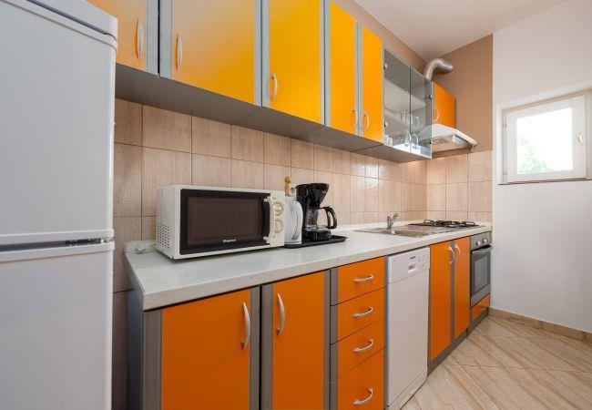 Die Küche ist ausgestattet mit Kühlschrank, Mikrowelle, Backofen, Gefrierschrank, Waschmaschine, Spülmaschine, Geschirr/Besteck, Kochutensilien, Kaffeemaschine, Toaster und Wasserkocher.