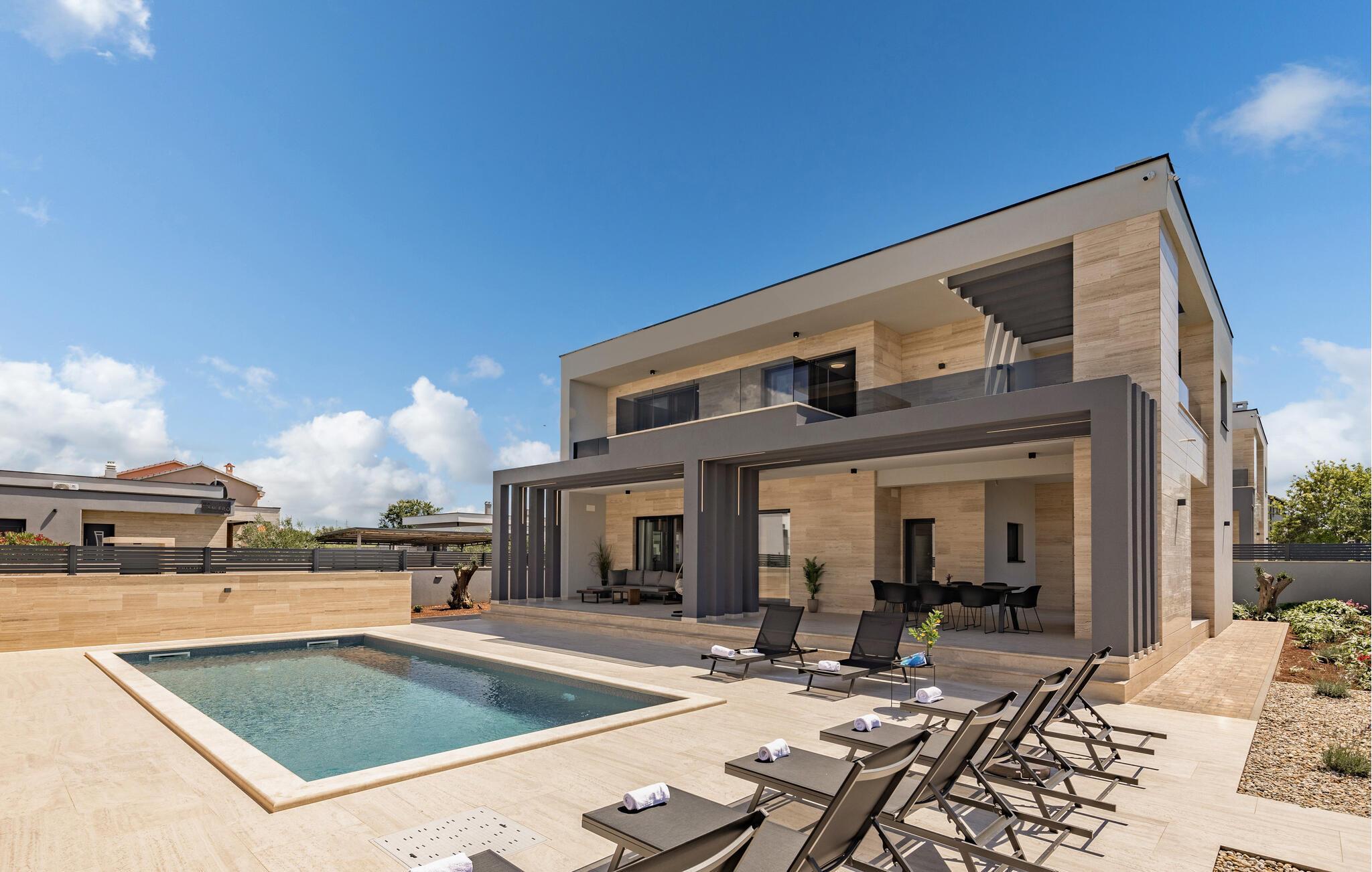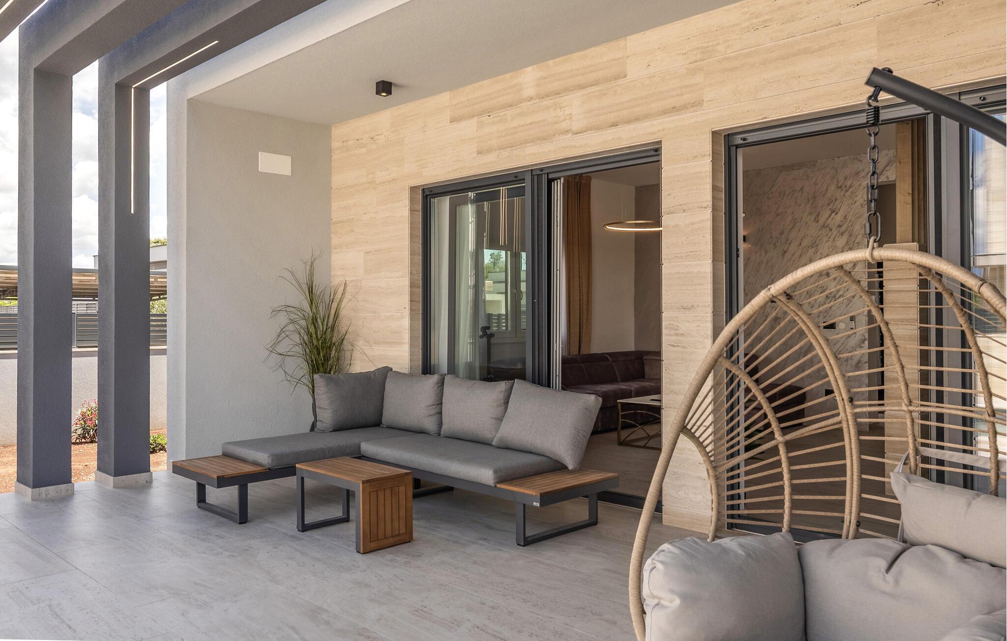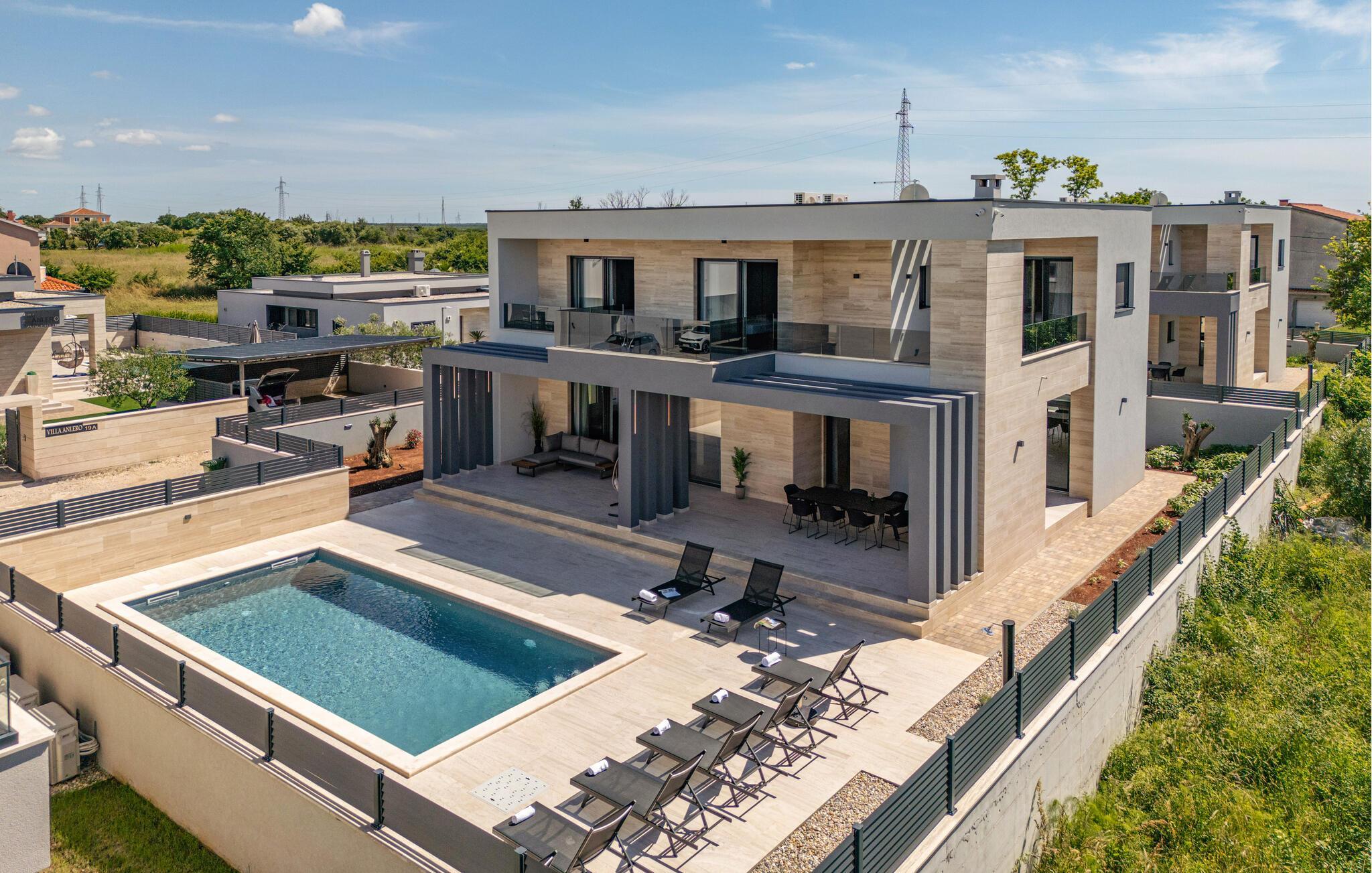 Auch im Freien können Sie herrliche Stunden auf dem gepflegten Grundstück verbringen. Genießen Sie die Sonne und ein paar kalte Getränke auf den Terrassen, im privaten Pool können Sie sich jederzeit erfrischen und anschließend im Liegestuhl entspannen oder eine Partie Kicker spielen. Lassen Sie einen wunderbaren Urlaubstag mit Leckereien vom Grill zu Ende gehen.