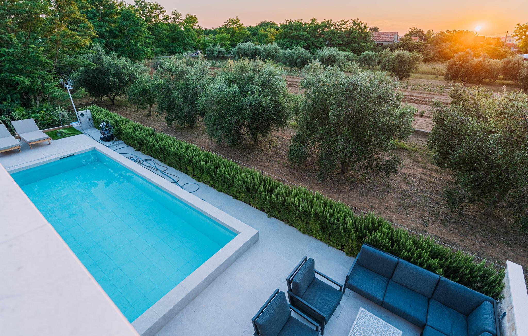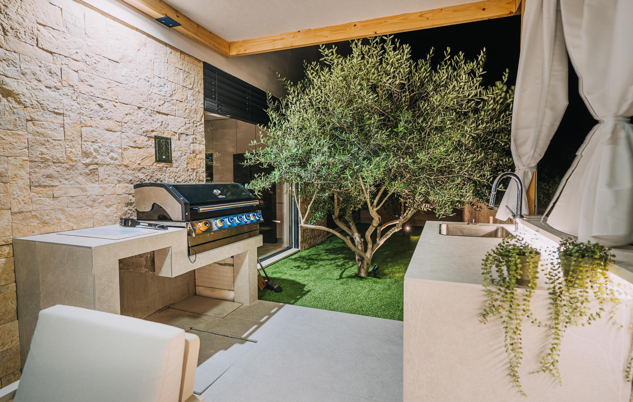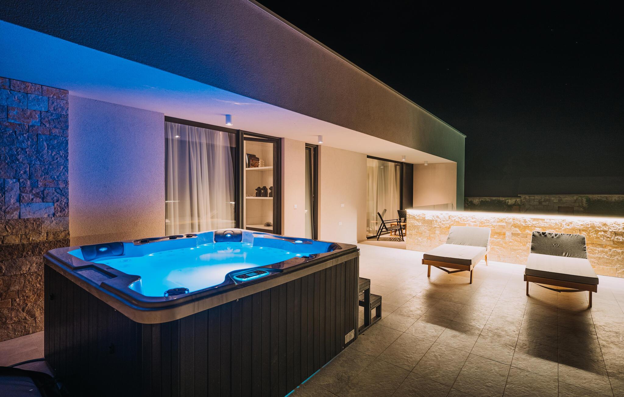 Ebenso großzügig präsentiert sich der sensationelle Außenbereich. Verbringen Sie lange Sonnenstunden auf den bequemen Liegen und erfrischen Sie sich in warmen Sommernächten im beleuchteten Pool. Gönnen Sie sich bei Sonnenuntergang wohltuende Momente im Whirlpool und versammeln Sie sich für ein Barbecue am erstklassigen Gasgrill.