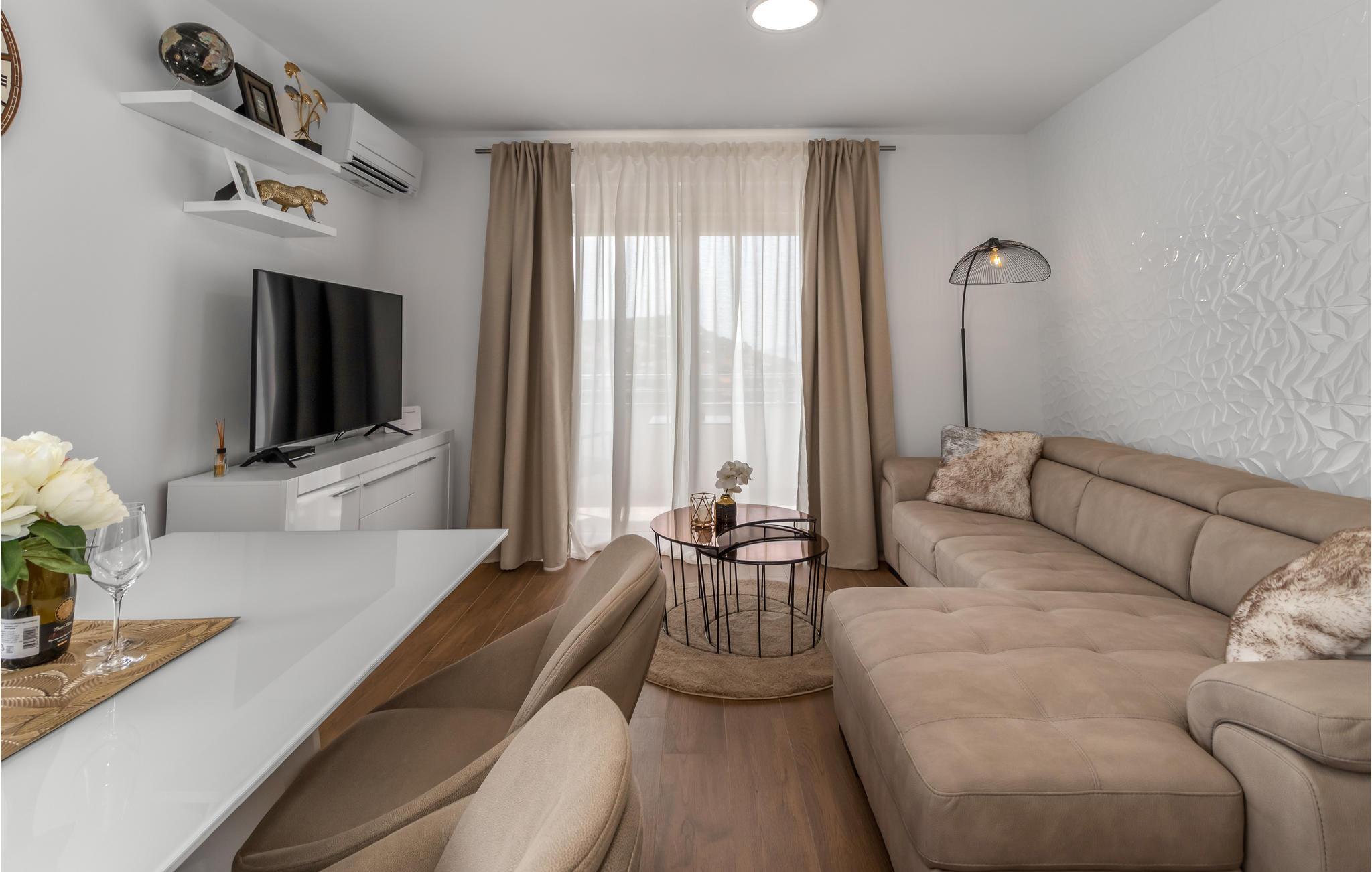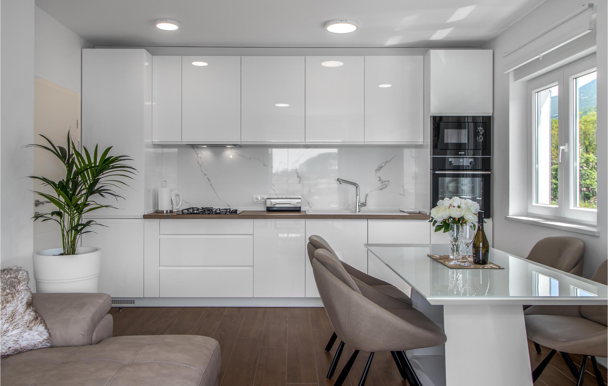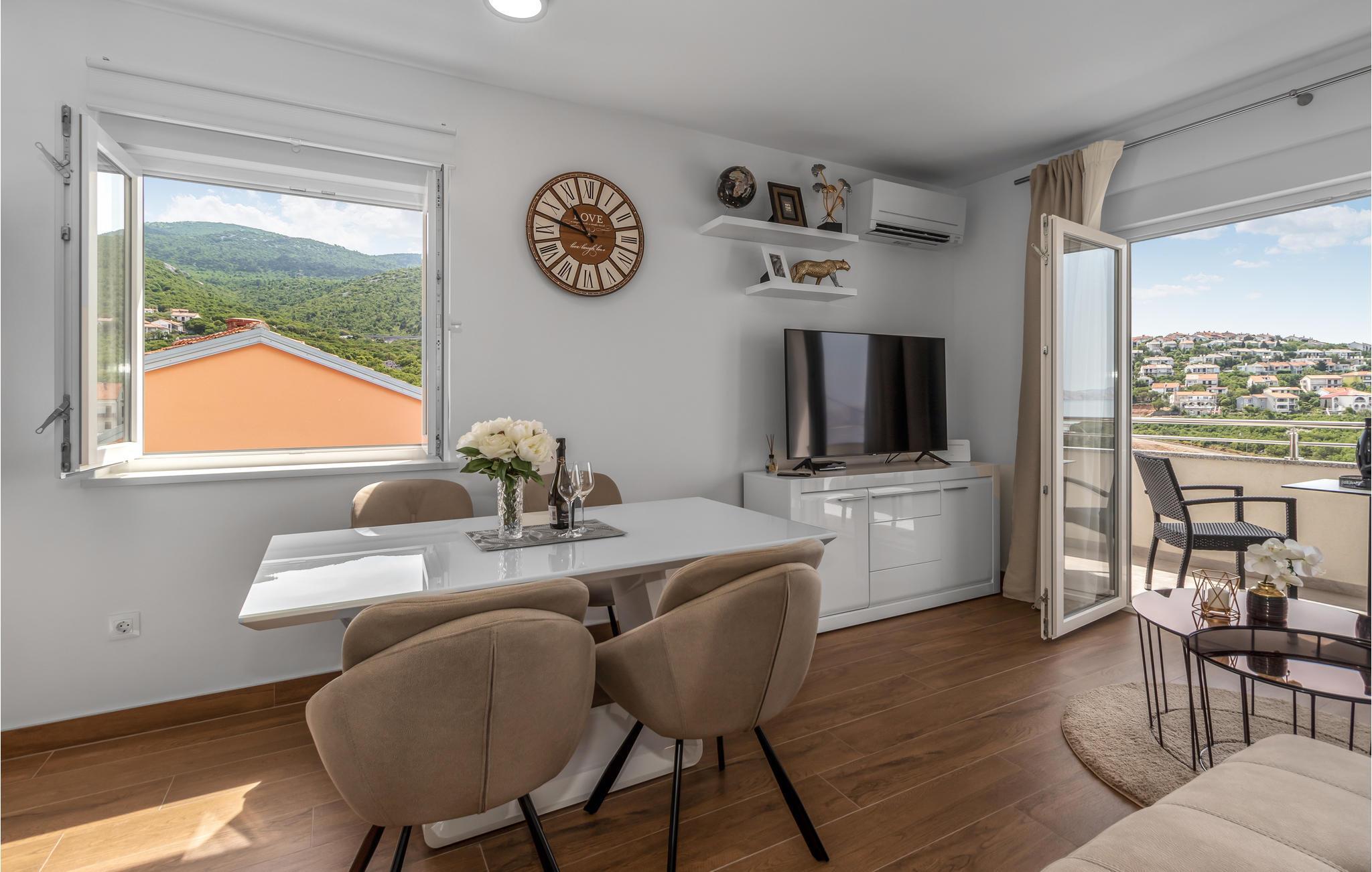 Hierbei handelt es von einer Ferienwohnung im dritten Stock, wodurch Sie einen wunderbaren Meerblick auf die Kvarner Bucht genießen können. Ihnen steht ein schöner Balkon zur Verfügung, wo Sie gemeinsam frühstücken und Ihren ersten Kaffee am Morgen trinken, während Sie die Aussicht genießen und den bevorstehenden Tag planen. Im Innenraum erwartet Sie eine funktionelle Ausstattung und heimelige, sowie gemütliche Einrichtung, die Ihnen den Charme Kroatiens vermitteln kann.