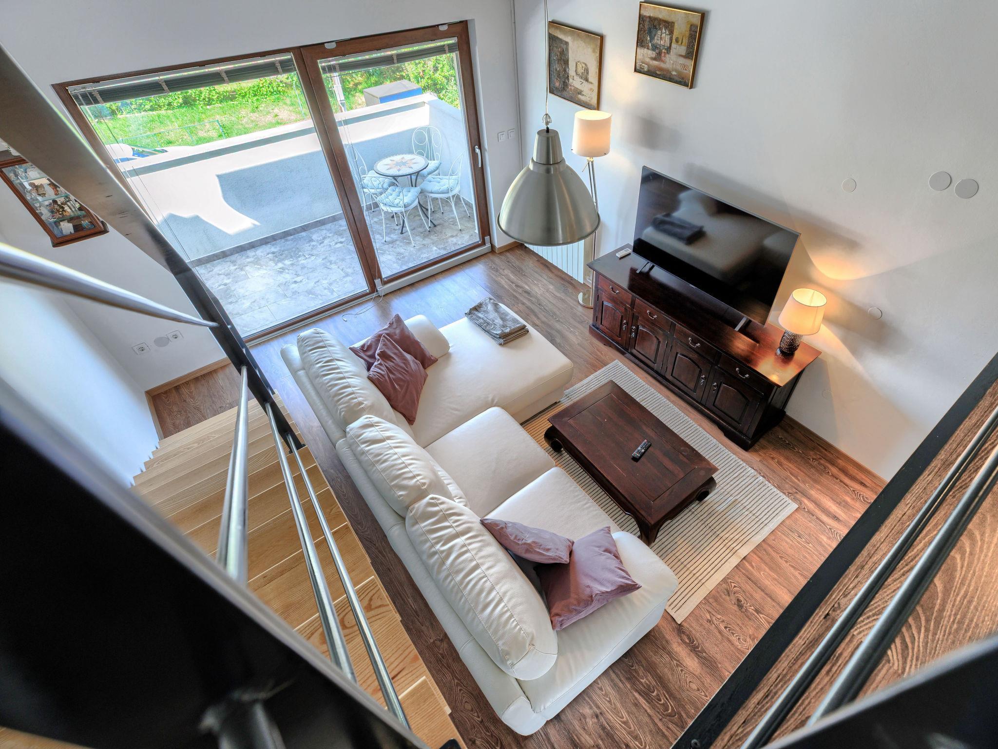 2-Zimmer-Wohnung 80 m2 im 1. Stock. Schön und geschmackvoll eingerichtet: Wohn-/Esszimmer 45 m2 mit Sat-TV und Klimaanlage. Ausgang zur Terrasse. 1 Zimmer mit 1 franz. Bett (140 cm, Länge 200 cm). Abgeschrägte, offene Galerie, Deckenhöhe 70 - 215 cm mit 1 franz. Bett (180 cm, Länge 200 cm). Offene Küche (4 Kochplatten, Backofen, Geschirrspüler, Mikrowelle, Tiefkühler, elektrische Kaffeemaschine). Dusche/Bidet/WC. Keine Heizmöglichkeit. Terrasse 6 m2, überdacht, Terrasse 20 m2. Terrassenmöbel. Sicht auf den Garten. Zur Verfügung: Waschmaschine, Safe, Haartrockner. Internet (Wireless LAN, gratis). Bitte beachten: eigener Eingang.