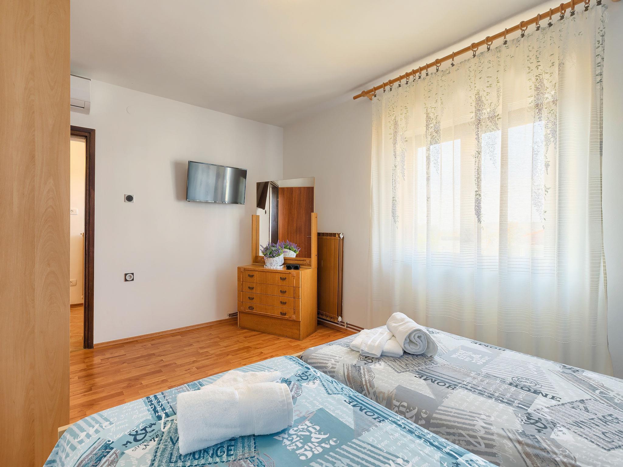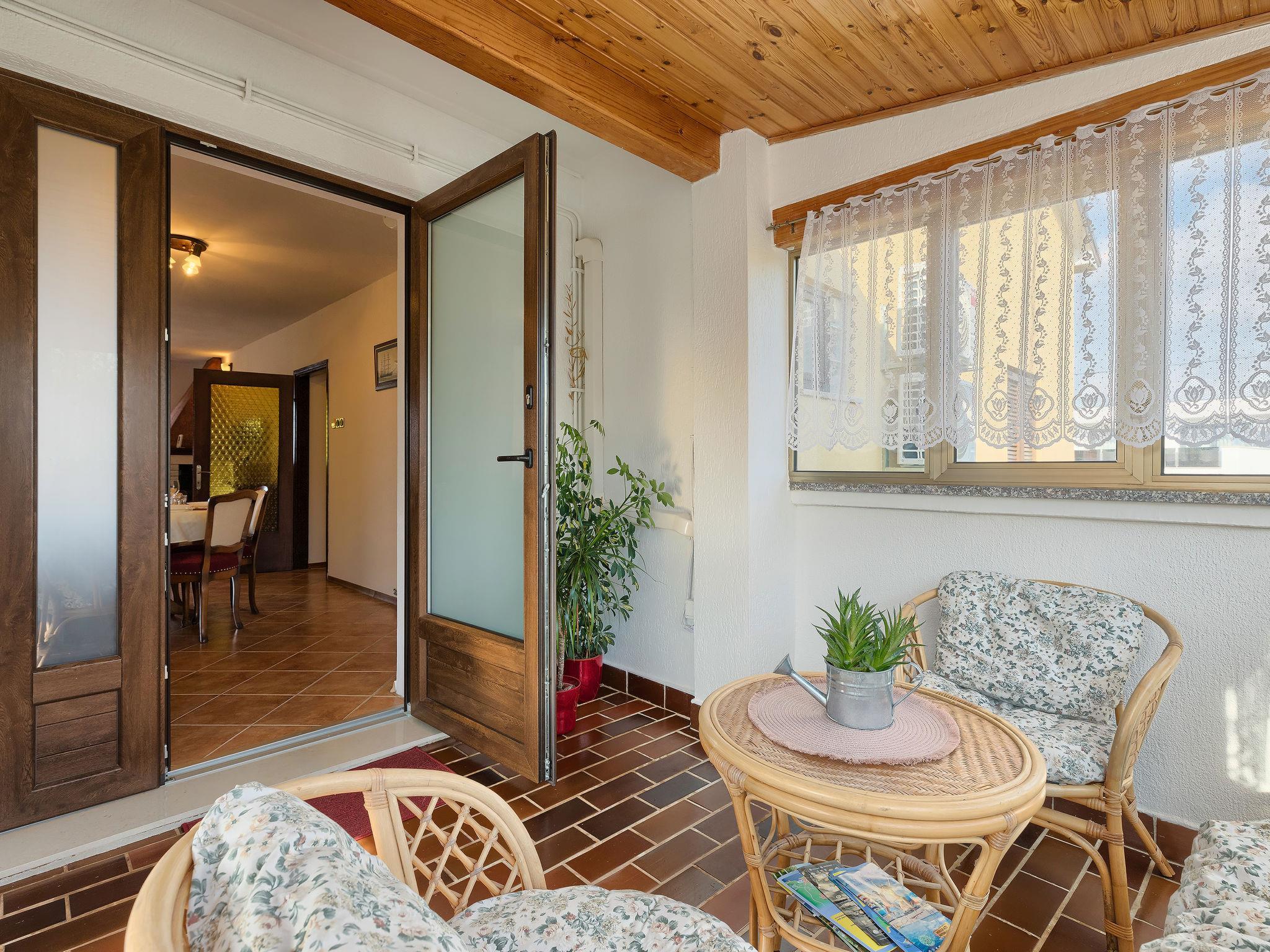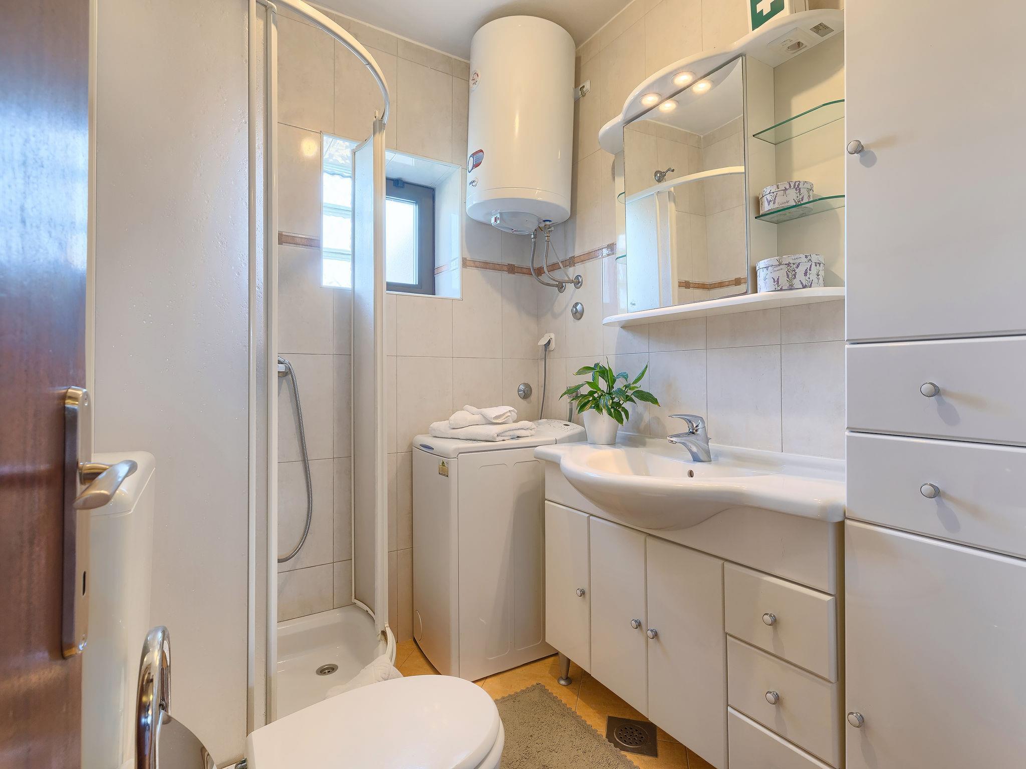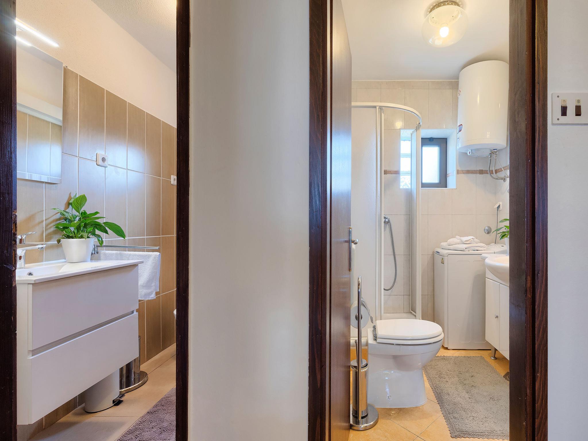 3-Zimmer-Wohnung 108 m2 im 1. Stock. Wohn-/Esszimmer 33 m2 mit 1 Doppeldiwanbett (160 cm, Länge 190 cm), Sat-TV (Flachbildschirm), Klimaanlage. Ausgang zur Terrasse. 1 Zimmer mit 1 Doppelbett (2 x 90 cm, Länge 200 cm), Sat-TV und Klimaanlage. 1 Zimmer mit 2 Betten (90 cm, Länge 200 cm), Sat-TV und Klimaanlage. Offene Küche (Backofen, Geschirrspüler, 4 Flammen, Wasserkocher, Tiefkühler, elektrische Kaffeemaschine). Dusche/Bidet/WC, sep. WC. Heizung (extra). Terrasse 8 m2, überdacht, Terrasse 15 m2. Terrassenmöbel, Liegestühle. Sicht auf das Schwimmbad und den Garten. Zur Verfügung: Waschmaschine, Bügeleisen, Babybett, Haartrockner. Internet (Wireless LAN, gratis). Bitte beachten: Nichtraucher-Unterkunft. Eigener Eingang.