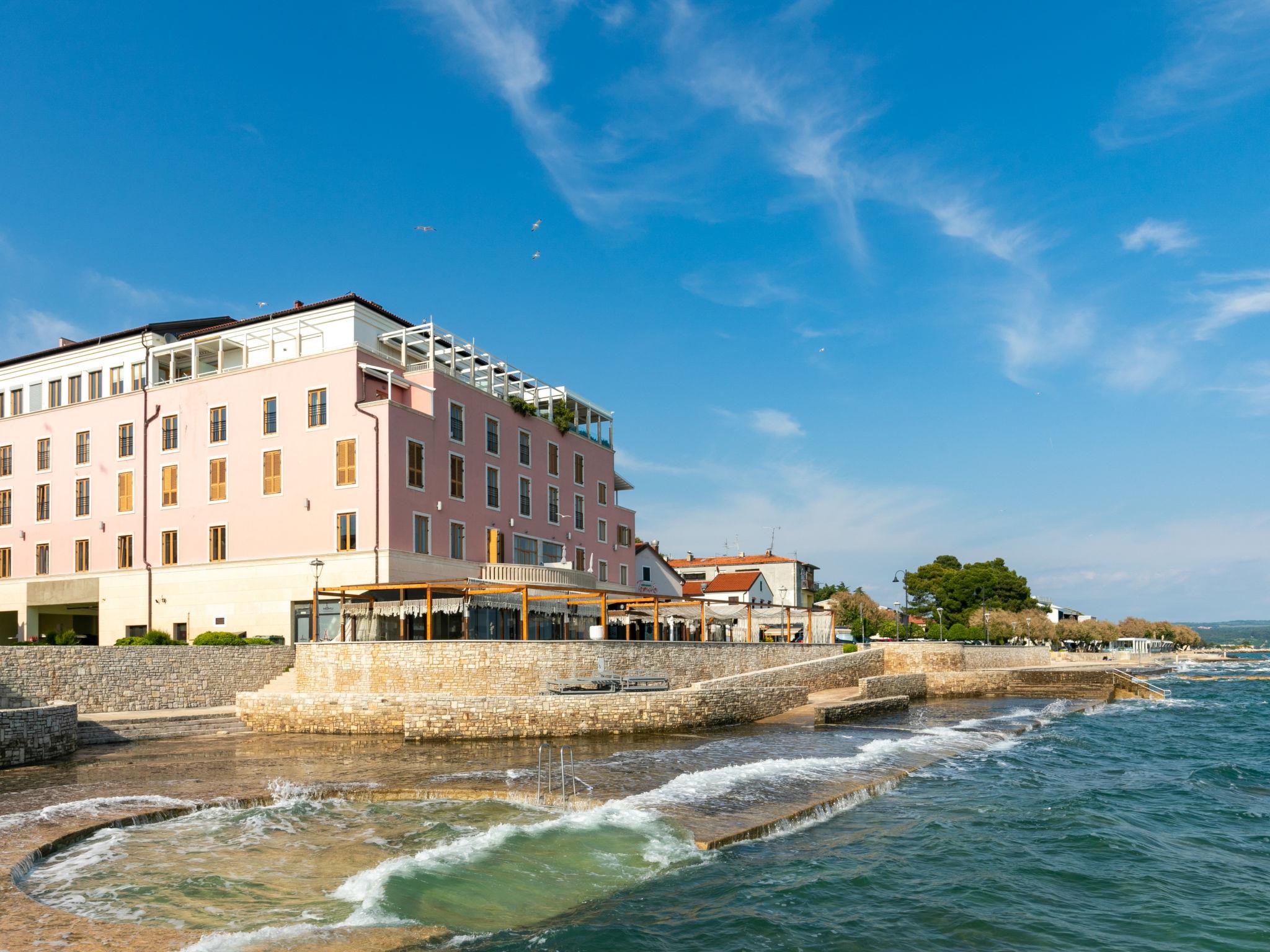 Apart-Hotel "Aparthotel Rotonda Inn", auf 4 Stockwerken. 50 m vom Zentrum von Novigrad, 15 km vom Zentrum von Umag, 15 km vom Zentrum von Porec, exzellente Lage: Absolut zentral und dennoch ruhig, 20 m vom Meer, 20 m vom Strand. Im Hause: Empfang, Internetzugang. Wohnungsreinigung täglich möglich (extra). Abholservice vom Flughafen (extra). Parkplatz (beschränkte Anzahl, extra), öffentliche Parkplätze extra. Einkaufsgeschäft 100 m, Restaurant, Bar, Bäckerei 50 m, Bushaltestelle 2 km, Bahnstation 35 km, Kieselstrand 100 m, betonierter Strand 20 m. Jacht-Hafen 1 km, Golfplatz (18 Loch) 25 km, Sportzentrum 1 km. Nahe gelegene Sehenswürdigkeiten: Aquapark 7 km.