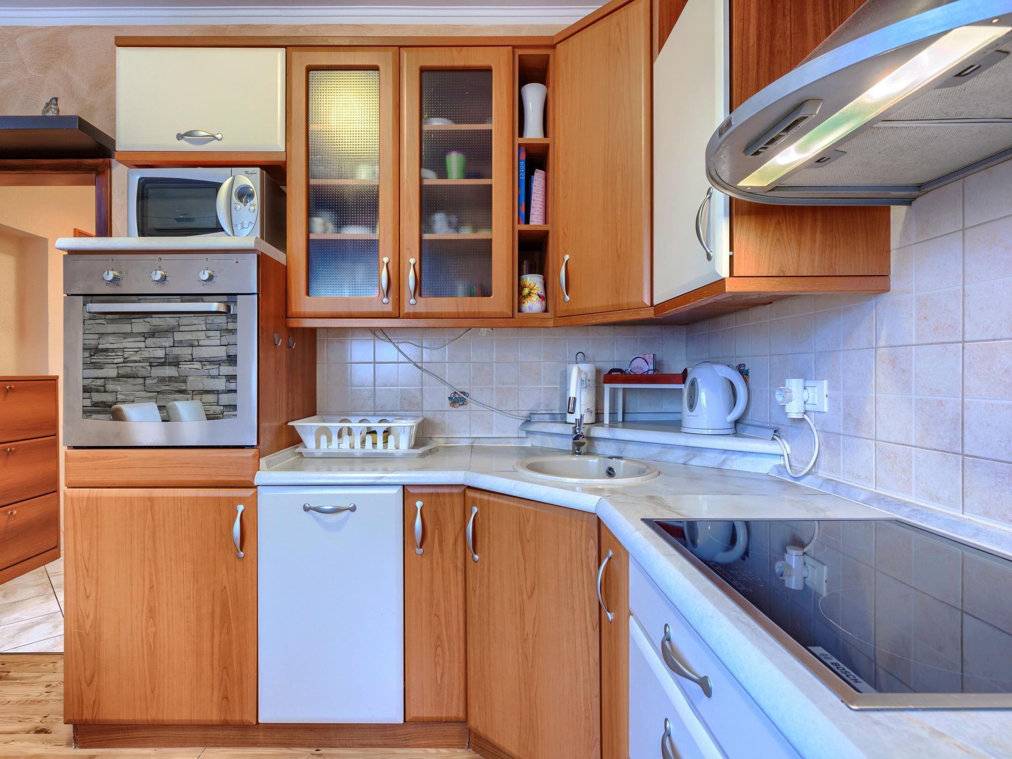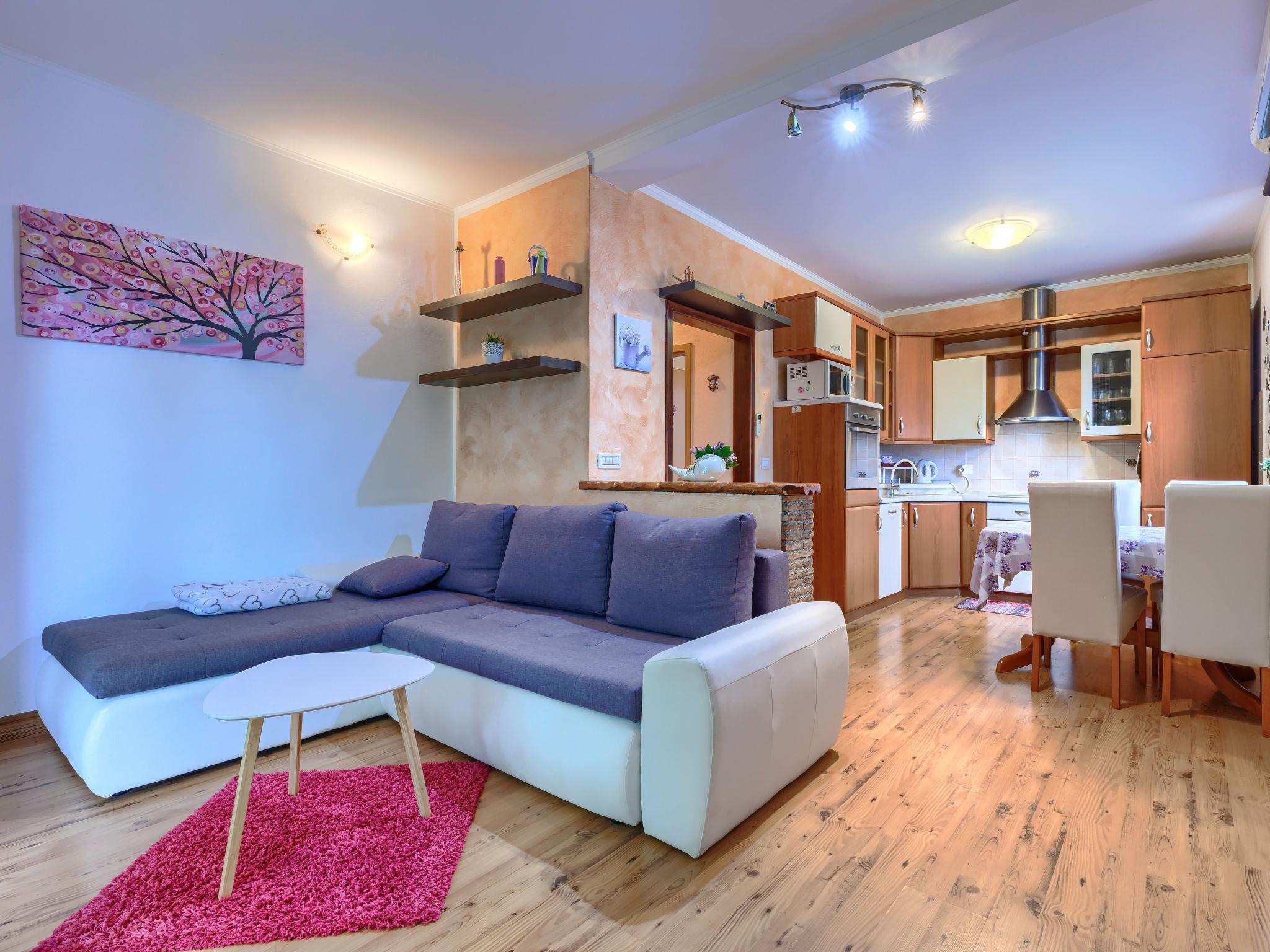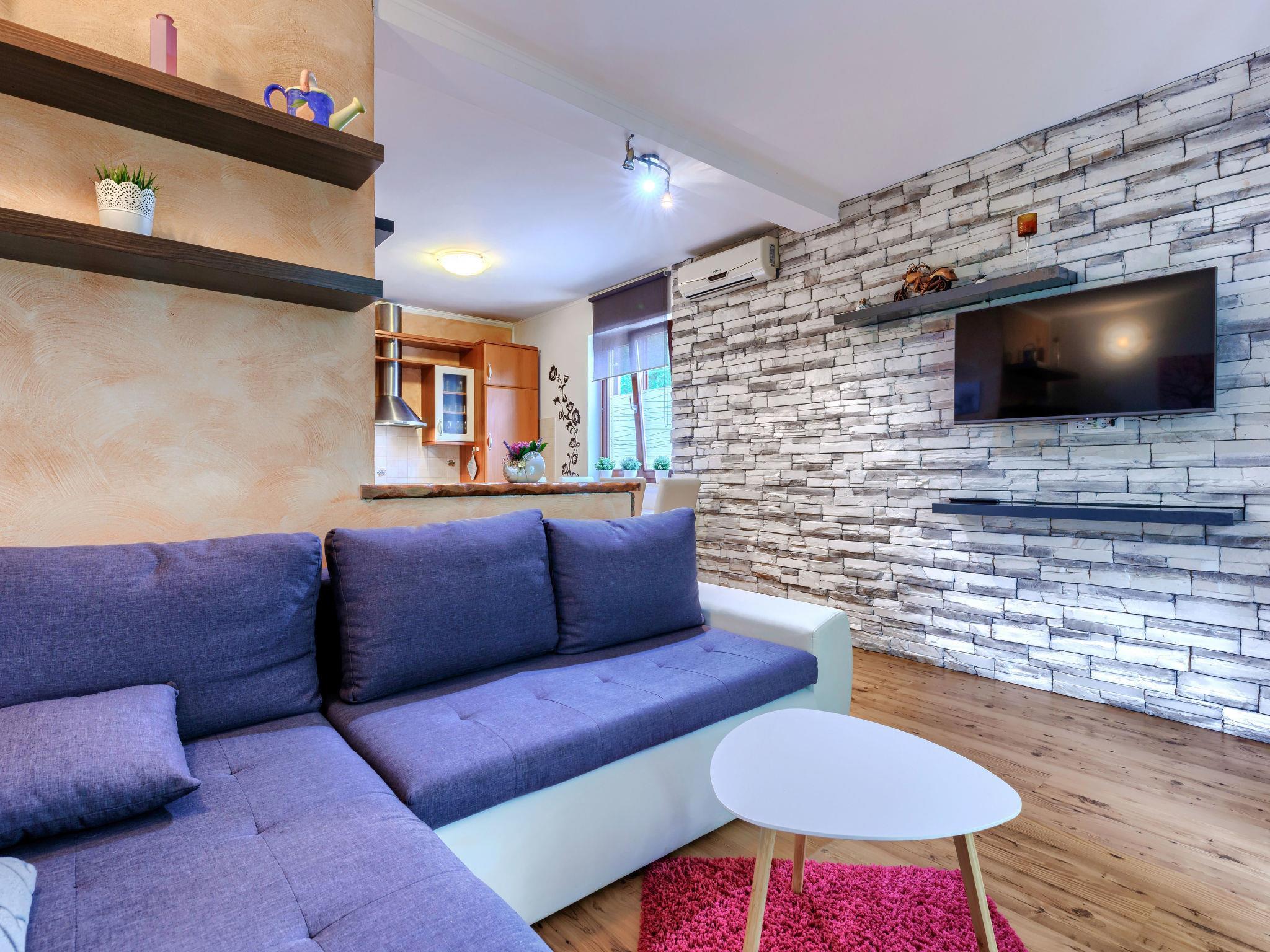 2-Zimmer-Wohnung 45 m2, im Erdgeschoss. Wohn-/Esszimmer mit 1 Doppeldiwanbett (140 cm, Länge 190 cm), Sat-TV (Flachbildschirm). 1 Zimmer mit 1 franz. Bett (180 cm, Länge 200 cm). Offene Küche (Backofen, Geschirrspüler, 4 Induktionskochplatten, Wasserkocher, Mikrowelle, Tiefkühler, elektrische Kaffeemaschine) mit Klimaanlage. Ausgang zum Balkon. Dusche/WC. Balkon 5 m2. Balkonmöbel. Zur Verfügung: Haartrockner. Internet (WLAN, gratis).