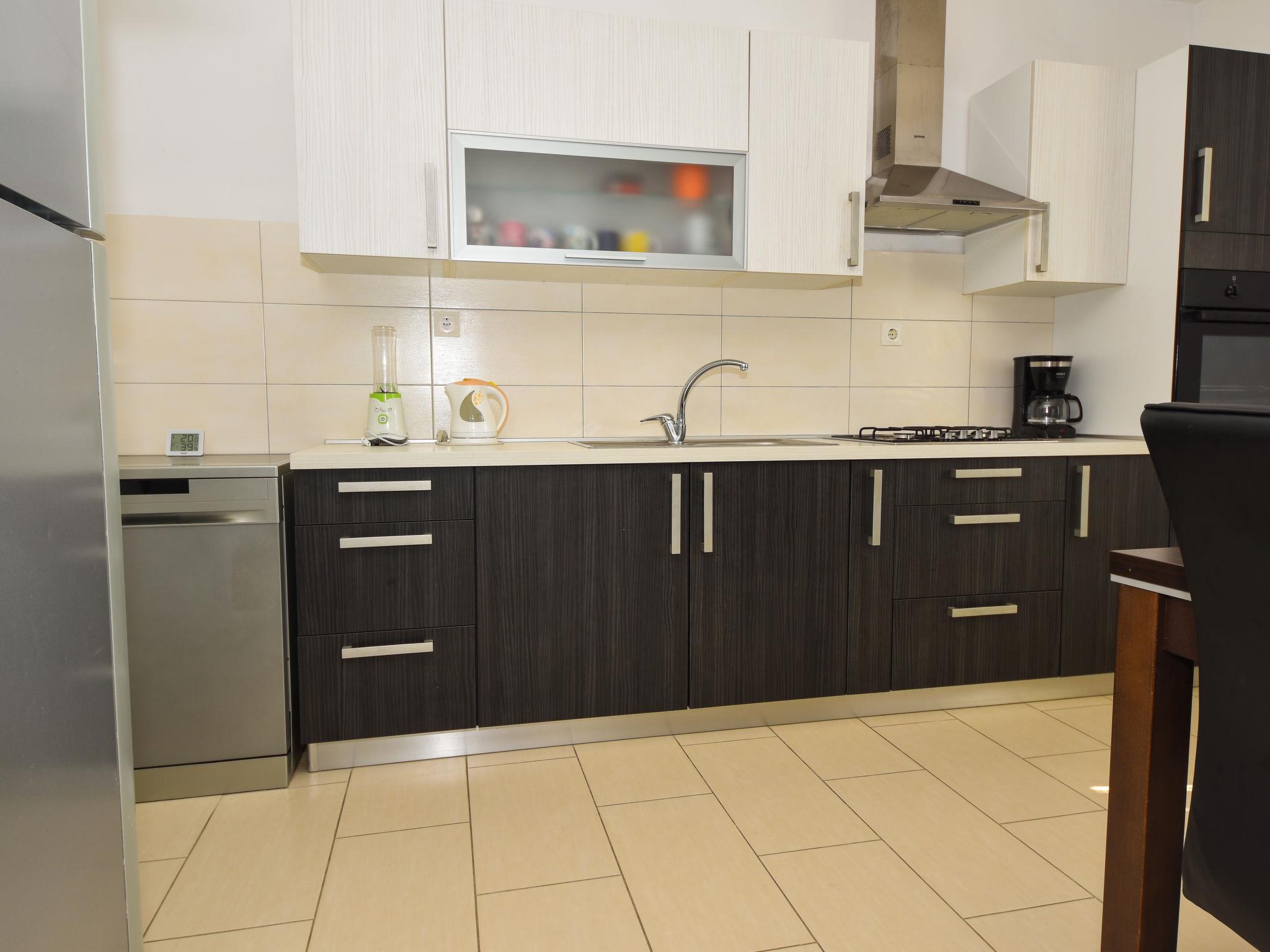 3-Zimmer-Reihenhaus 90 m2 im 1. Stock, Nordostlage. Wohn-/Esszimmer 35 m2 mit 1 Diwanbett (140 cm, Länge 190 cm), TV (Flachbildschirm), Klimaanlage. Ausgang zur Terrasse. 1 Zimmer mit 1 franz. Bett (160 cm, Länge 200 cm). 1 Zimmer mit 1 Bett (90 cm, Länge 200 cm), 1 franz. Bett (160 cm, Länge 200 cm). Offene Küche (1 Kochplatte, Backofen, Geschirrspüler, 3 Flammen, Tiefkühler, elektrische Kaffeemaschine). Dusche/WC. Keine Heizmöglichkeit. Terrasse 40 m2, überdacht. Terrassenmöbel. Fernsicht auf das Meer. Zur Verfügung: Waschmaschine, Haartrockner. Internet (Wireless LAN, gratis). Bitte beachten: eigener Eingang.