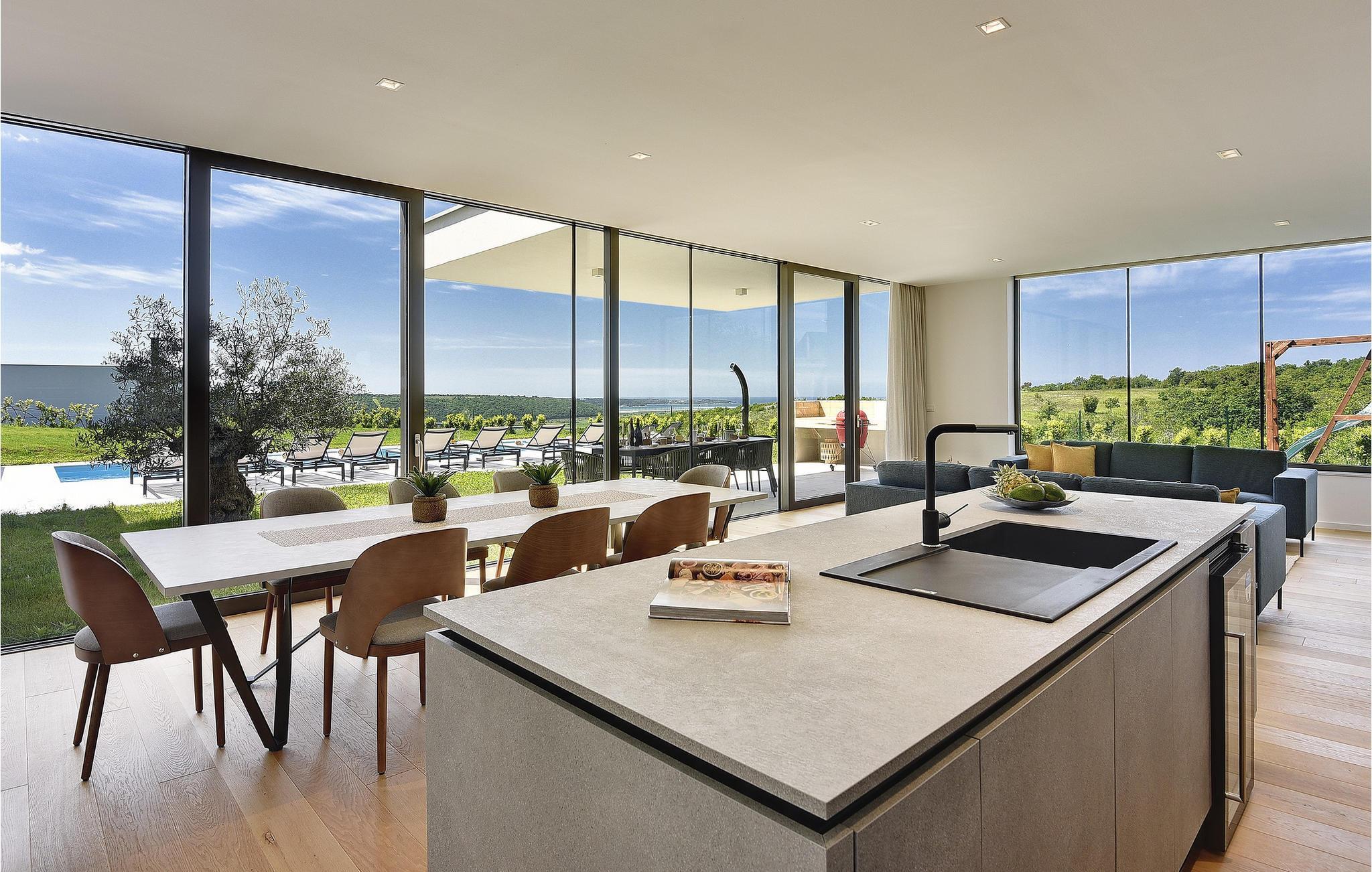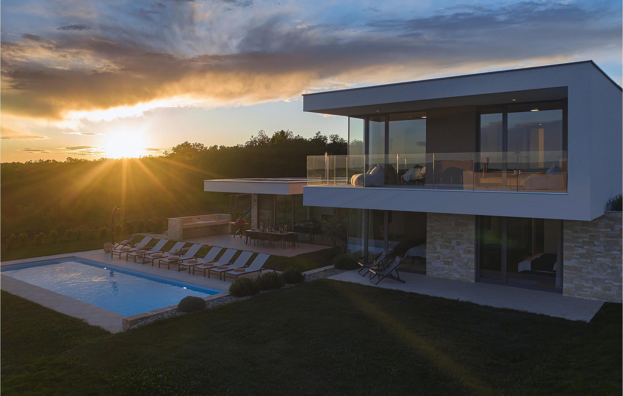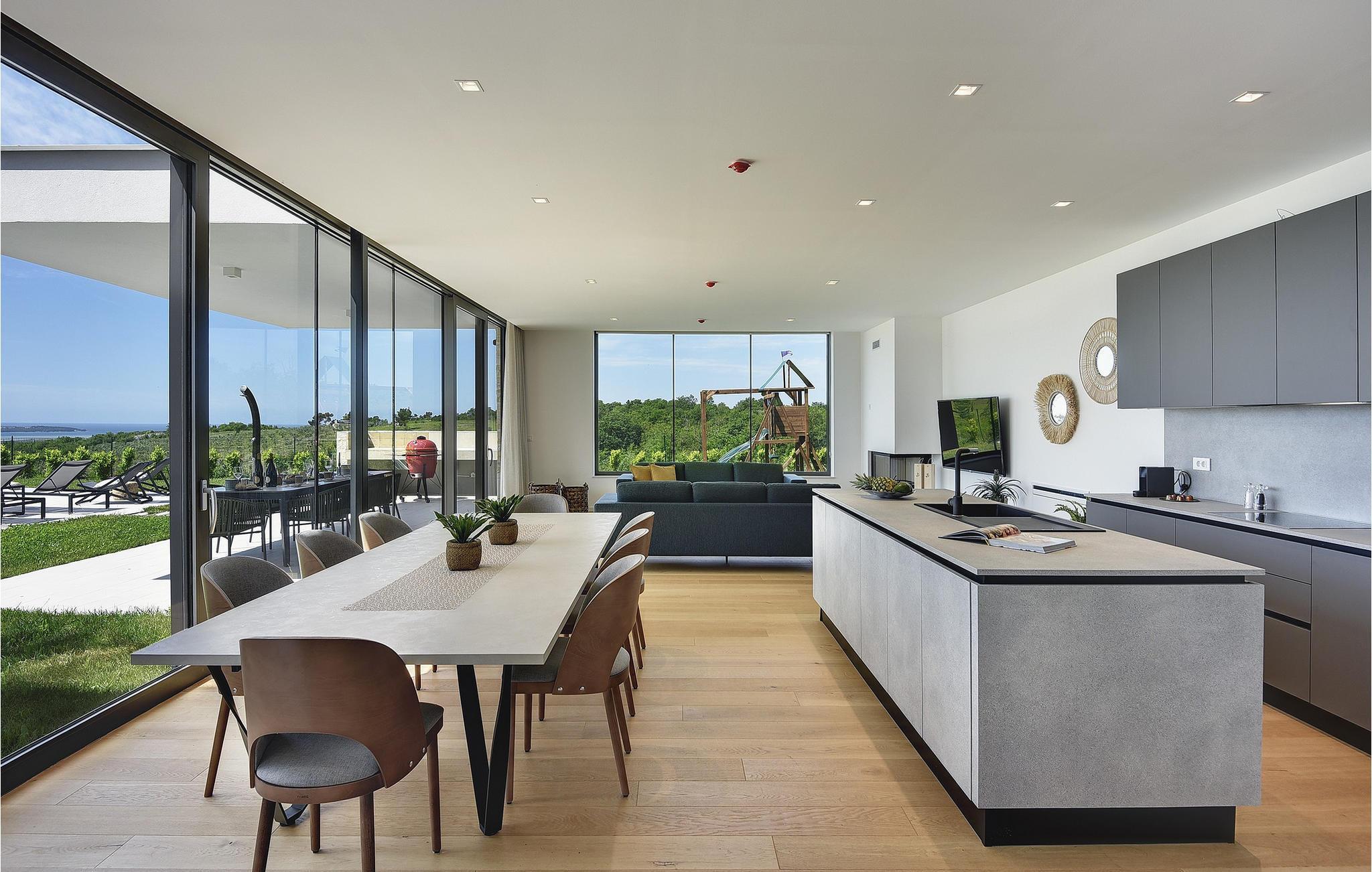 Die wunderschöne Villa Rošinjola im kleinen istrischen Ort Nova Vas beeindruckt durch ihre minimalistische Schlichtheit und isolierte Lage, die Ihnen Ruhe und Privatsphäre bietet. Der zeitgenössische Baustil umfasst große Glaswände in jedem Raum der Villa, die für Luftigkeit und Helligkeit im Innenraum sorgen. Die Unterkunftskapazität der Villa beträgt maximal 8 Personen. Von den insgesamt 4 Schlafzimmern verfügen zwei über ein Doppelbett und die restlichen zwei über jeweils zwei Einzelbetten, die auch zu Doppelbetten zusammengestellt werden können. 2 weitere Personen können in der Villa übernachten: zwei Kinder bis 7 Jahre nutzen ein Zustellbett. Im Obergeschoss der Villa befinden sich zwei Schlafzimmer mit eigenem Bad, und im Erdgeschoss der Villa gibt es zwei weitere Schlafzimmer, ebenfalls mit eigenem Bad, ein geräumiges Wohnzimmer, eine moderne Küche und ein offenes Esszimmer. Außerdem stehen Ihnen eine Waschmaschine, ein Bügeleisen und Bügelbrett sowie ein Futterspender und ein Babybett zur Verfügung. Auf der großen Terrasse und im von viel Grün umgebenen Innenhof der Villa befindet sich ein großer Pool von 40 m2 und einer Tiefe von 1,5 m. Rund um den Pool stehen 10 Liegestühle bereit, auf denen Sie angenehme Sommermomente in Gesellschaft Ihrer Lieben verbringen können. Es gibt auch einen Kamado-Grill im Freien und einen Esstisch im Freien. Für die Kleinsten gibt es einen Kinderspielplatz mit Rodelbahn, Tischtennis, Darts oder Badminton, der Ihren Urlaub mit interessanten Aktivitäten abrunden wird. Im komplett umzäunten Hof der Villa stehen 4 Parkplätze zur Verfügung. In Novigrad, einer wunderschönen Stadt an der Küste Istriens, liegt etwas weiter von der Villa entfernt der nächste Strand namens Maestral, an dem Sie Wassersportarten wie Tauchen, Schwimmen und Segeln nachgehen können. Istrien ist vor allem für sein hervorragendes öno-gastronomisches Angebot bekannt. Versäumen Sie es daher nicht, einige der Spitzenspezialitäten wie frischen Fisch, verschiedene Nudelsorten, istrisches Boškarin-Fleisch, Olivenöl oder lokale Weine wie Malvasia, Teran und Cabernet Sauvignon zu probieren . Eine weitere besondere istrische Gourmetspezialität ist der Trüffel, eine unterirdische Wildknolle, die entlang der Wurzeln von Bäumen wächst. Obwohl es besonders bitter im Geschmack ist, ist dieses unterirdische Juwel eine sehr teure Gourmet-Delikatesse, die hauptsächlich in Italien und Frankreich wächst, aber auch in Istrien zu finden ist. All dies können Sie bei den Trüffeljagdtouren sehen und erleben, die in den Herbstmonaten in ganz Istrien organisiert werden. In Istrien finden Sie in den Sommermonaten verschiedene Unterhaltungs- und Kulturveranstaltungen. Im benachbarten Brtonigla, einem malerischen Ort auf einem von Weinbergen umgebenen Hügel, können Sie im Sommer an verschiedenen Gastro-Festivals wie dem Schokoladen- und Weinfest, den Pilztagen oder der Ethno-Veranstaltung „In den Farben der Tradition“ teilnehmen ". Wenn Sie dennoch lieber kulturelle und historische Denkmäler und interessante Straßen erkunden möchten, finden Sie an der istrischen Küste viele historische Städte wie das nahegelegene Umag oder Porec, deren Straßen verschiedene antike Denkmäler verbergen. In Porec, einer Stadt mit einer mehr als 2000-jährigen Geschichte, gibt es beispielsweise eine monumentale frühchristliche Euphrasius-Basilika aus dem 6. Jahrhundert. Aufgrund seiner außergewöhnlichen architektonischen und stilistischen Merkmale wurde es in die Liste des UNESCO-Weltkulturerbes aufgenommen. Genießen Sie alle Vorzüge des wunderschönen und magischen Istriens und entspannen Sie sich im bezaubernden Luxus der Villa Rošinjola! Eine Poolheizung ist gegen eine zusätzliche Gebühr verfügbar, die vor Ort zu zahlen ist.