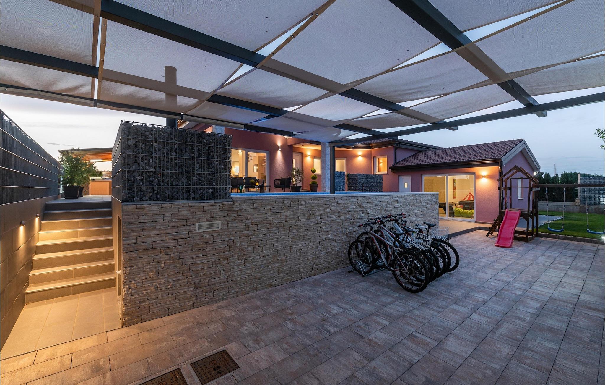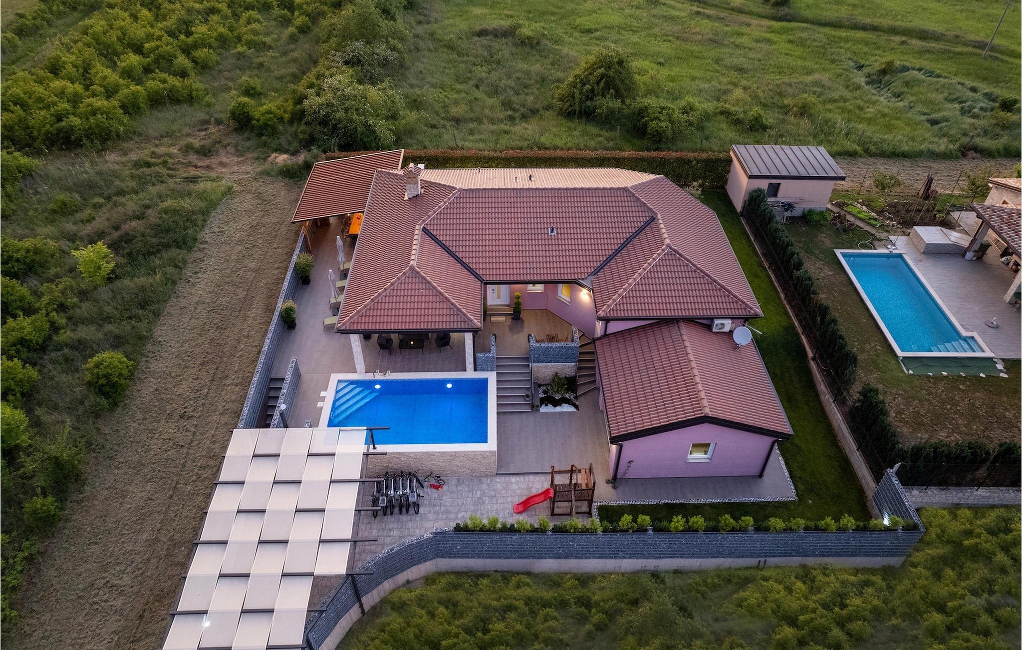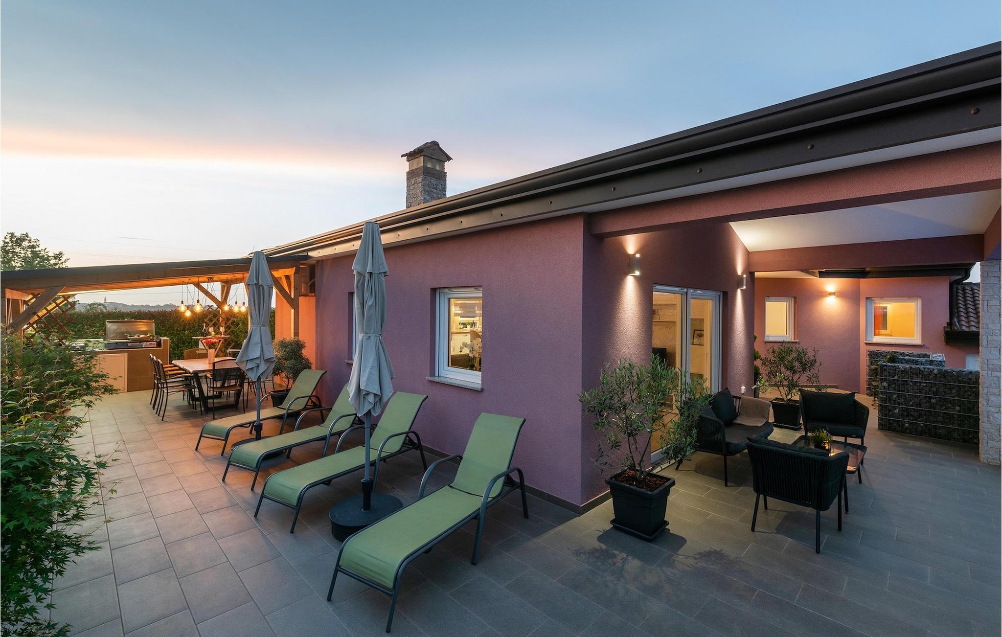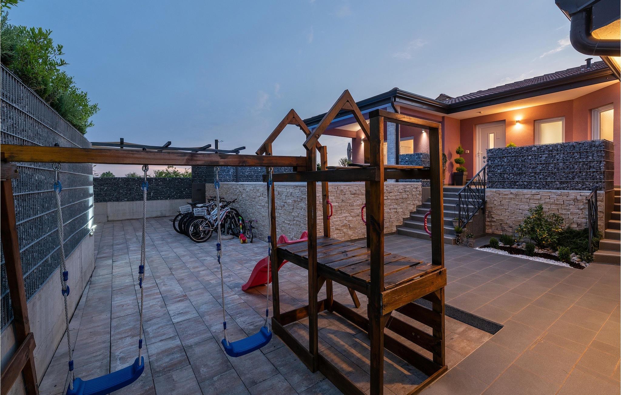 Die Villa verfügt über einen Kinderspielplatz, eigenen Fahrrädern, die den Gästen kostenlos zur Verfügung gestellt werden, und einem tollen Spielzimmer mit separatem Eingang. Während die kleinen Gäste spielen, können die restlichen Gäste ein erfrischendes Bad im Pool genießen oder auf einen der Liegestühle die Sonne Istriens genießen. Freunde des Grillens werden sich über die schöne Außenküche freuen. Dort können Sie die Augen über das unendliche Grün der Felder schweifen lassen, während sie ein schönes Gericht zubereiten. Der Essbereich auf der Terrasse bietet Platz für eine ganze Familie.