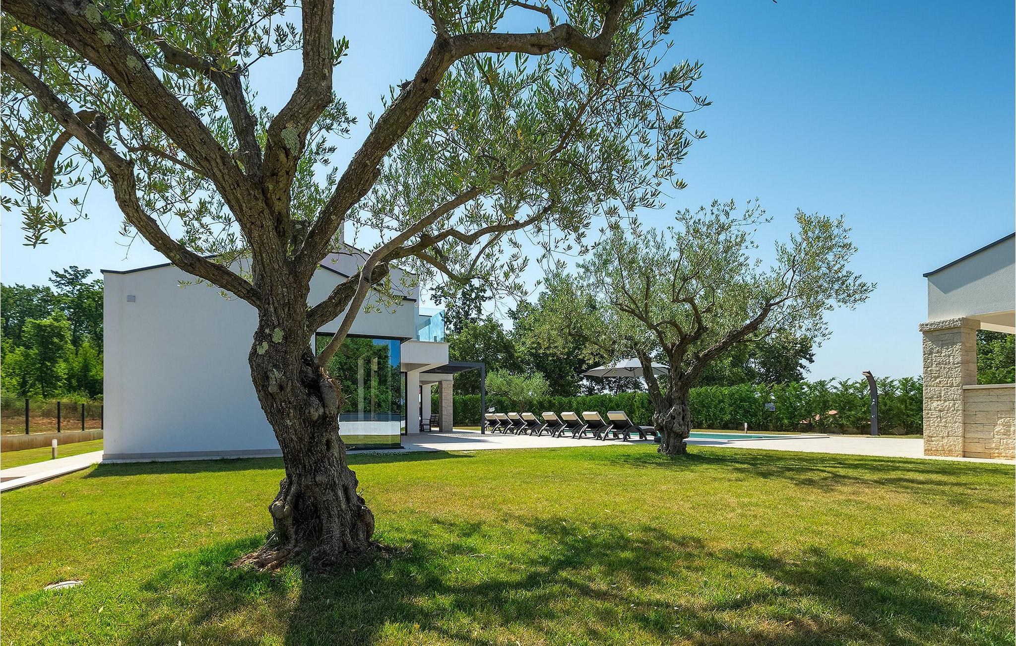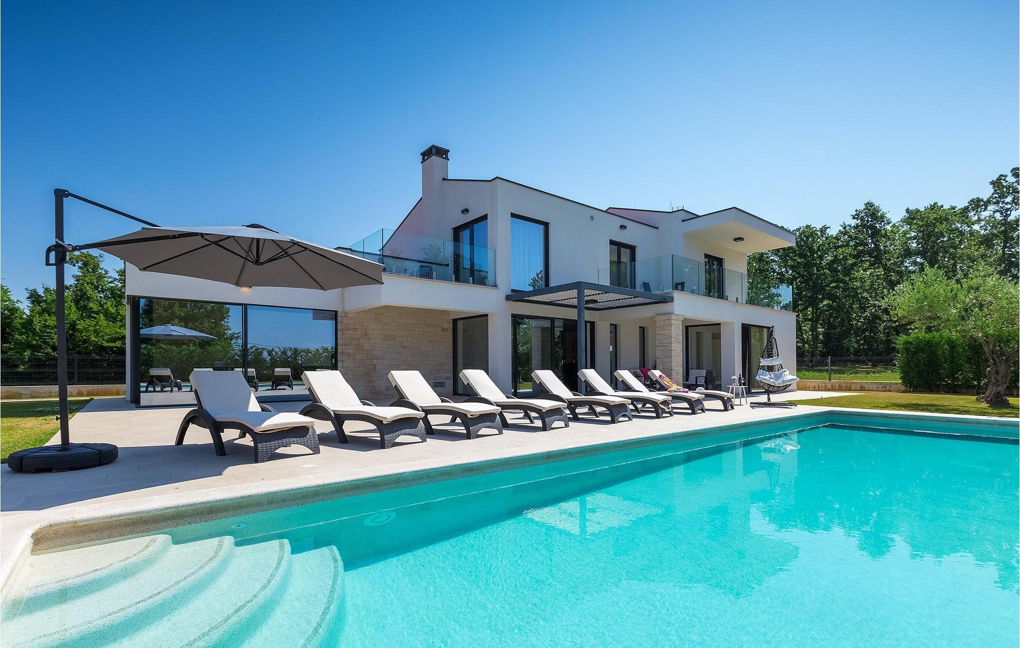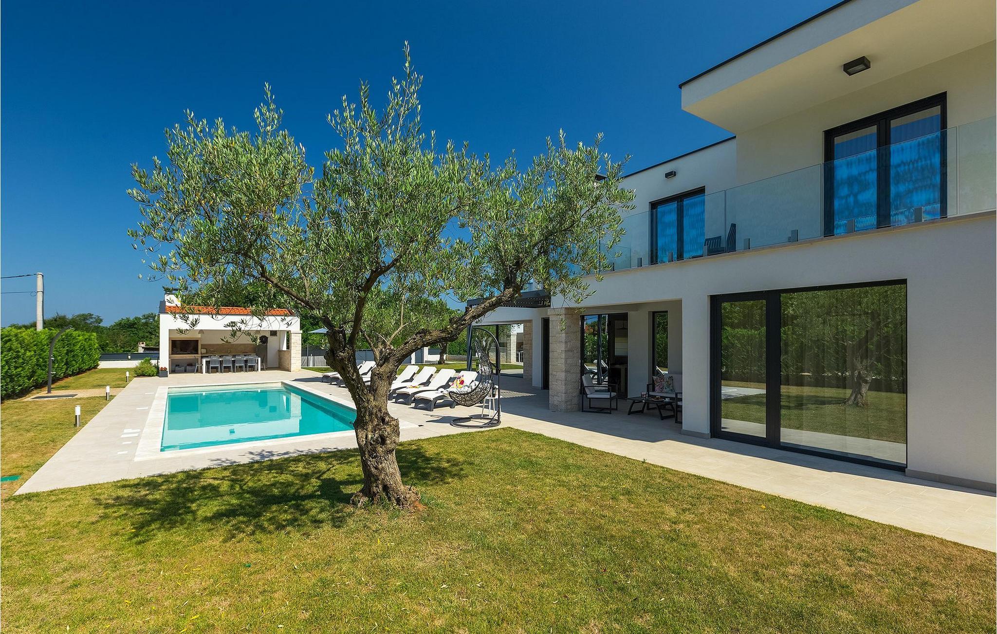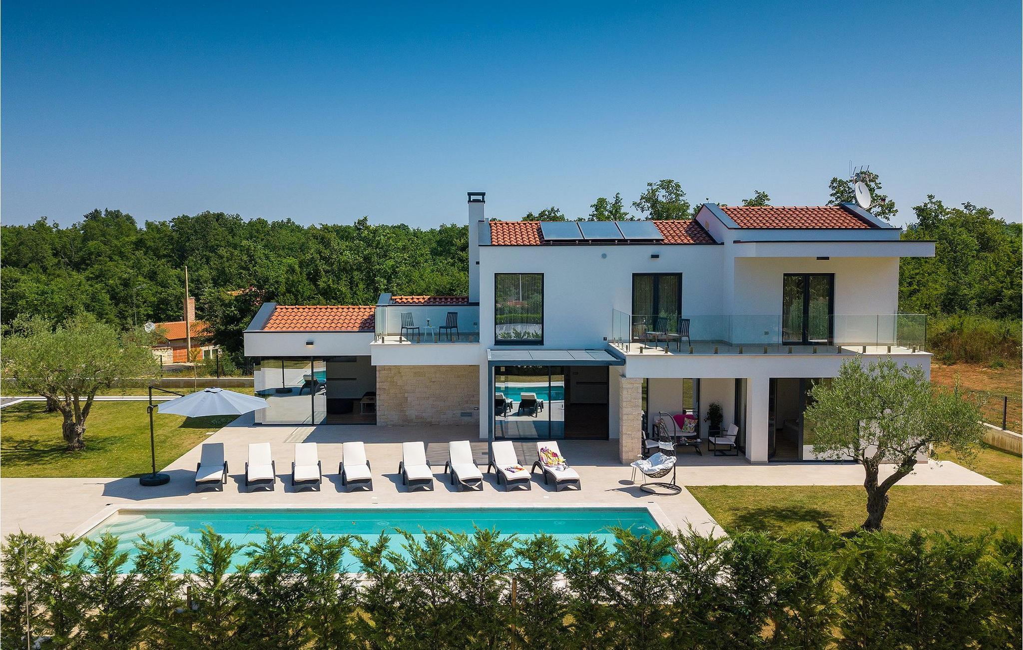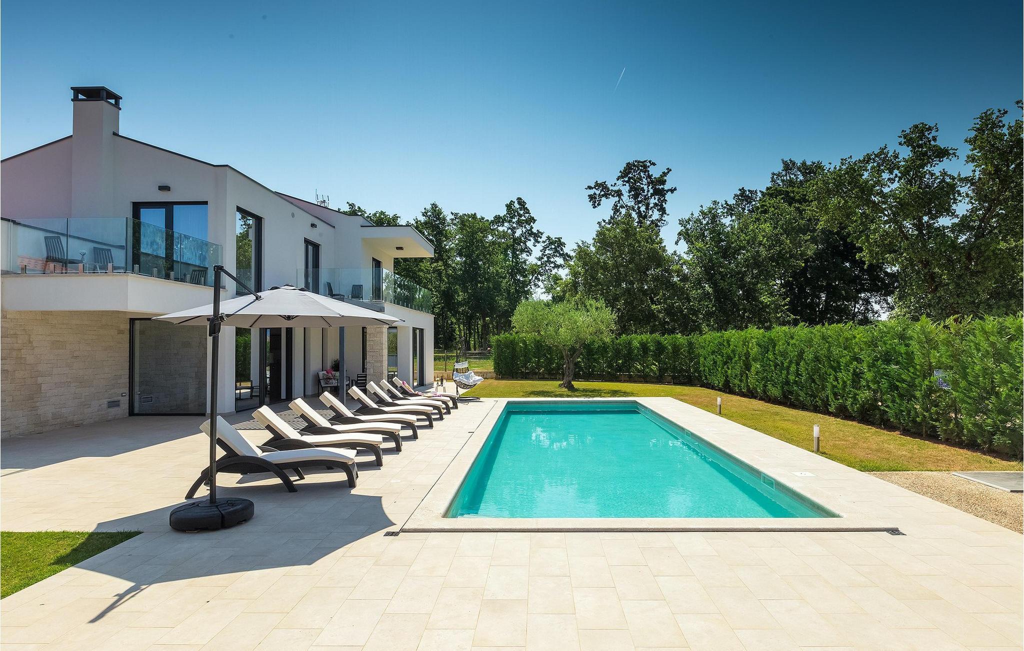 Villa Silvia ist eine elegante, komfortable Villa, gelegen in der Nähe von einem der beliebtesten touristischen Urlaubsdestinationen in Istrien - der schönen Stadt Porec. Die Villa verfügt über 4 Schlafzimmer und kann bis zu 10 Personen beherbergen. Im Erdgeschoss finden Sie ein geräumiges und elegantes Wohnzimmer verbunden mit dem Essbereich und einer völlig ausgestatteten Küche mit Frühstücksbar vor. Auf dieser Etage befinden sich auch ein Schlafzimmer mit en-suite Badezimmer, ein Wäscheraum und ein Gäste-WC. Die anderen 3 lichtdurchfluteten und gemütlichen Schlafzimmer befinden sich auf der oberen Etage. Sie sind alle mit einem Doppelbett ausgestattet und verfügen über ein eigenes Badezimmer. Zwei der Schlafzimmer im Obergeschoss teilen sich eine Terrasse, während ein Schlafzimmer eine eigene Terrasse hat. Von den Terrassen erstreckt sich ein schöner Ausblick auf den Pool und die Umgebung. Vom Wohn- / Essbereich haben Sie direkten Zugang zum 45 m2 großen privaten Pool. Der Außenbereich verfügt auch über eine Sommerküche mit Grill und einen Essbereich, wo sie einen entspannten Sommerabend mit lokalen Köstlichkeiten genießen können. Der gesamte Außenbereich und der Pool sind nachts beleuchtet.