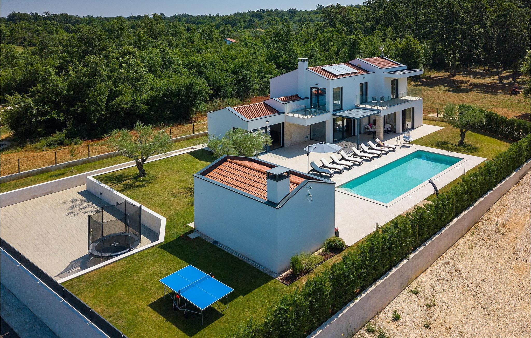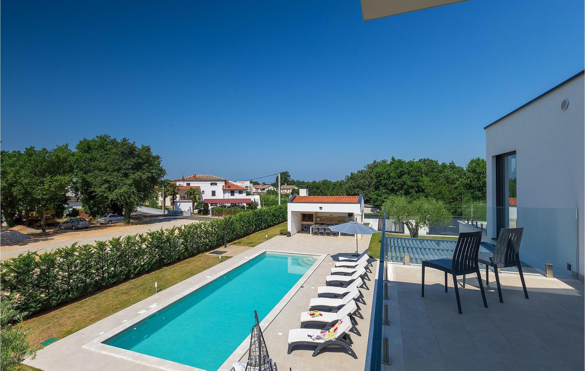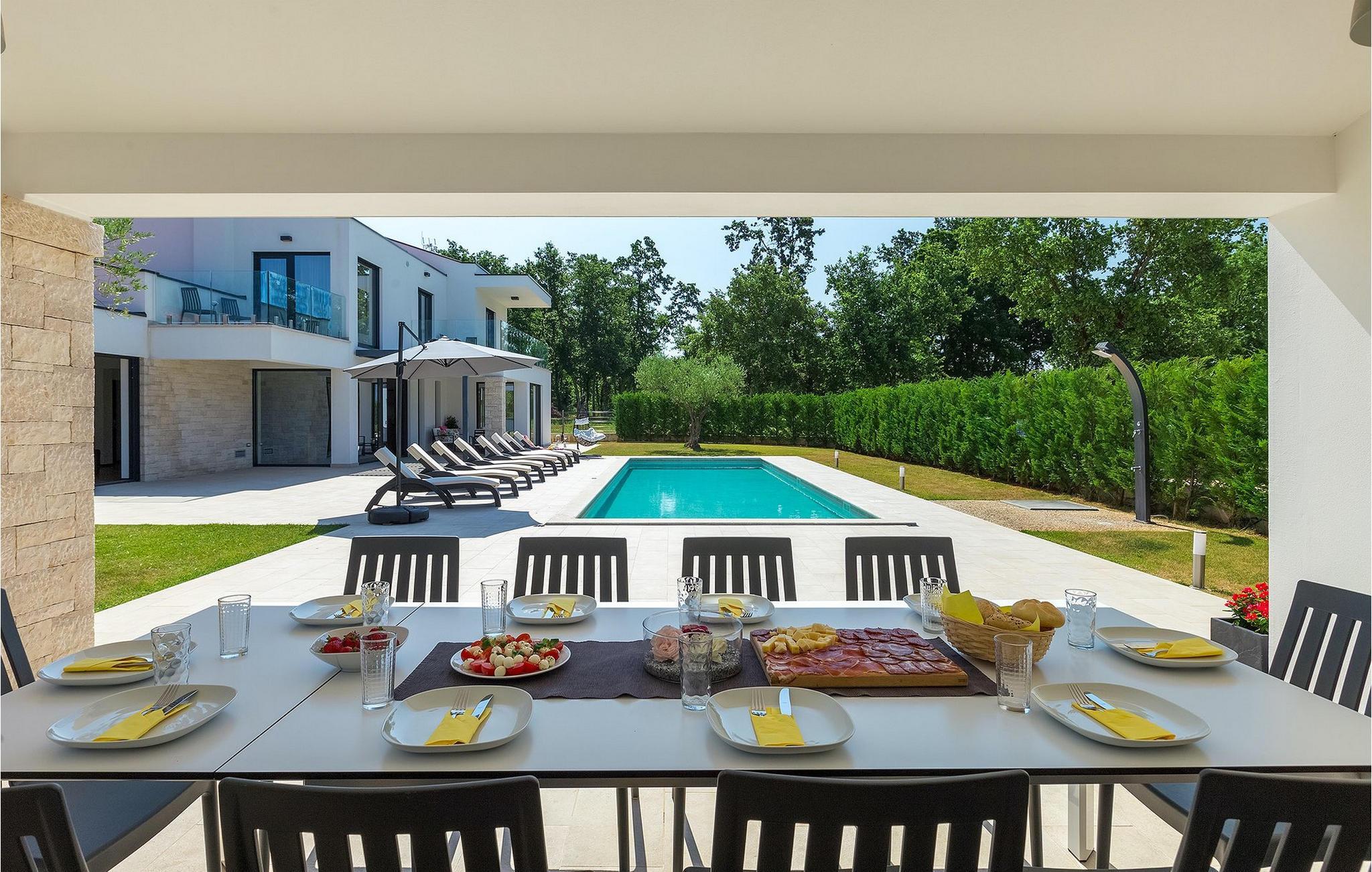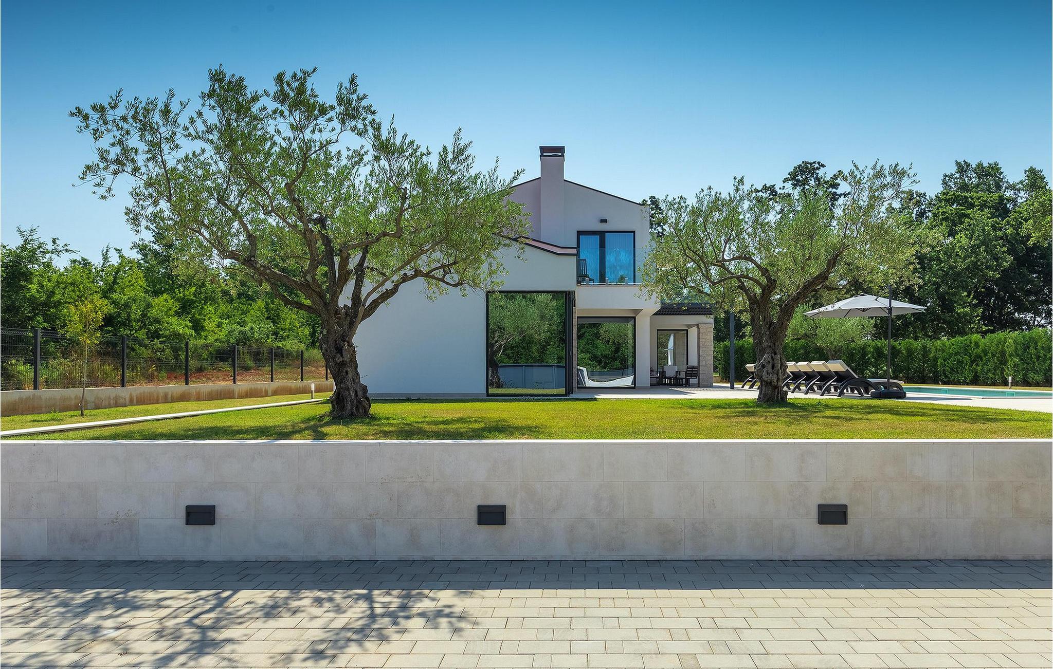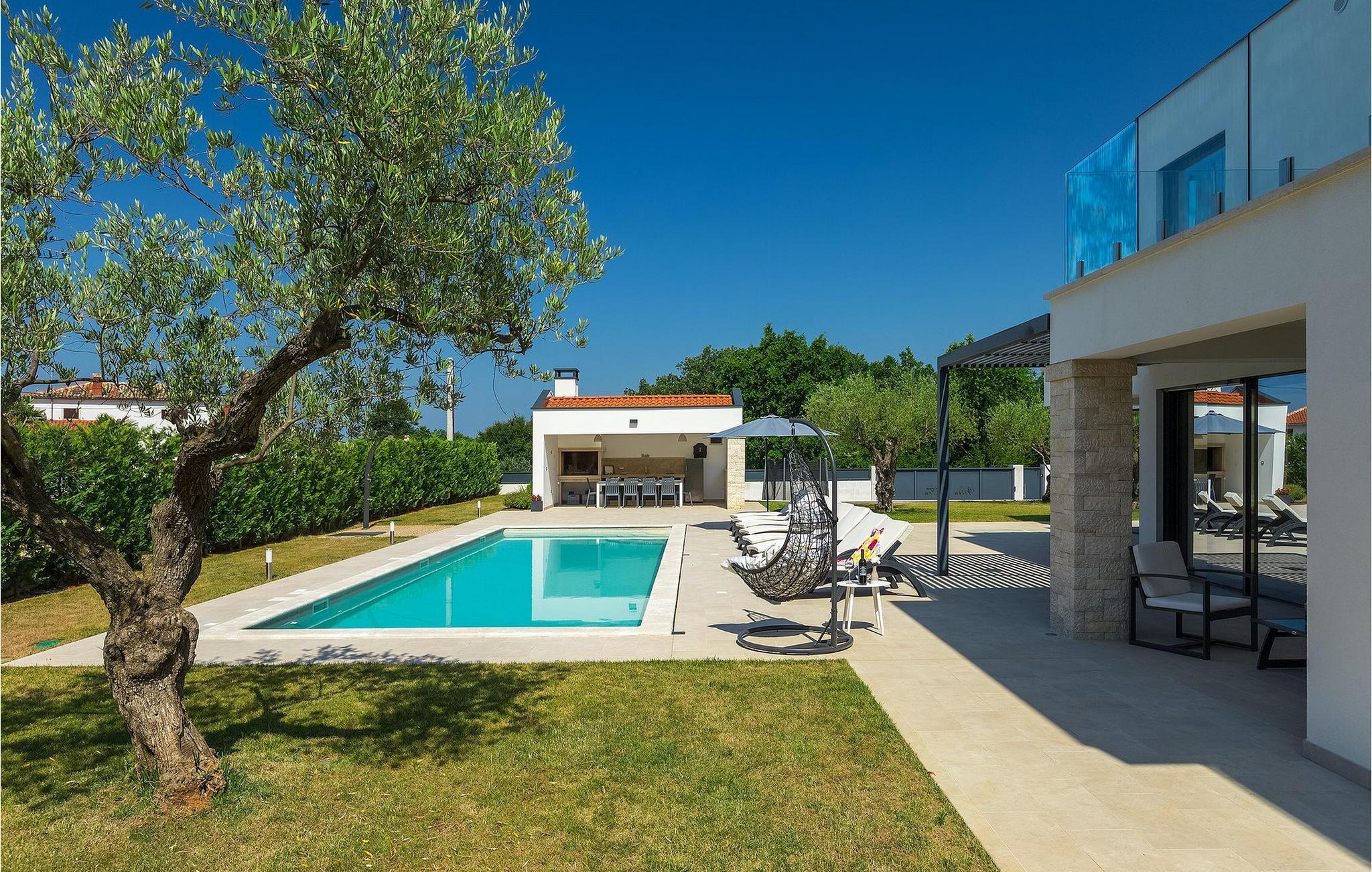 Villa Silvia ist eine elegante, komfortable Villa, gelegen in der Nähe von einem der beliebtesten touristischen Urlaubsdestinationen in Istrien - der schönen Stadt Porec. Die Villa verfügt über 4 Schlafzimmer und kann bis zu 10 Personen beherbergen. Im Erdgeschoss finden Sie ein geräumiges und elegantes Wohnzimmer verbunden mit dem Essbereich und einer völlig ausgestatteten Küche mit Frühstücksbar vor. Auf dieser Etage befinden sich auch ein Schlafzimmer mit en-suite Badezimmer, ein Wäscheraum und ein Gäste-WC. Die anderen 3 lichtdurchfluteten und gemütlichen Schlafzimmer befinden sich auf der oberen Etage. Sie sind alle mit einem Doppelbett ausgestattet und verfügen über ein eigenes Badezimmer. Zwei der Schlafzimmer im Obergeschoss teilen sich eine Terrasse, während ein Schlafzimmer eine eigene Terrasse hat. Von den Terrassen erstreckt sich ein schöner Ausblick auf den Pool und die Umgebung. Vom Wohn- / Essbereich haben Sie direkten Zugang zum 45 m2 großen privaten Pool. Der Außenbereich verfügt auch über eine Sommerküche mit Grill und einen Essbereich, wo sie einen entspannten Sommerabend mit lokalen Köstlichkeiten genießen können. Der gesamte Außenbereich und der Pool sind nachts beleuchtet.