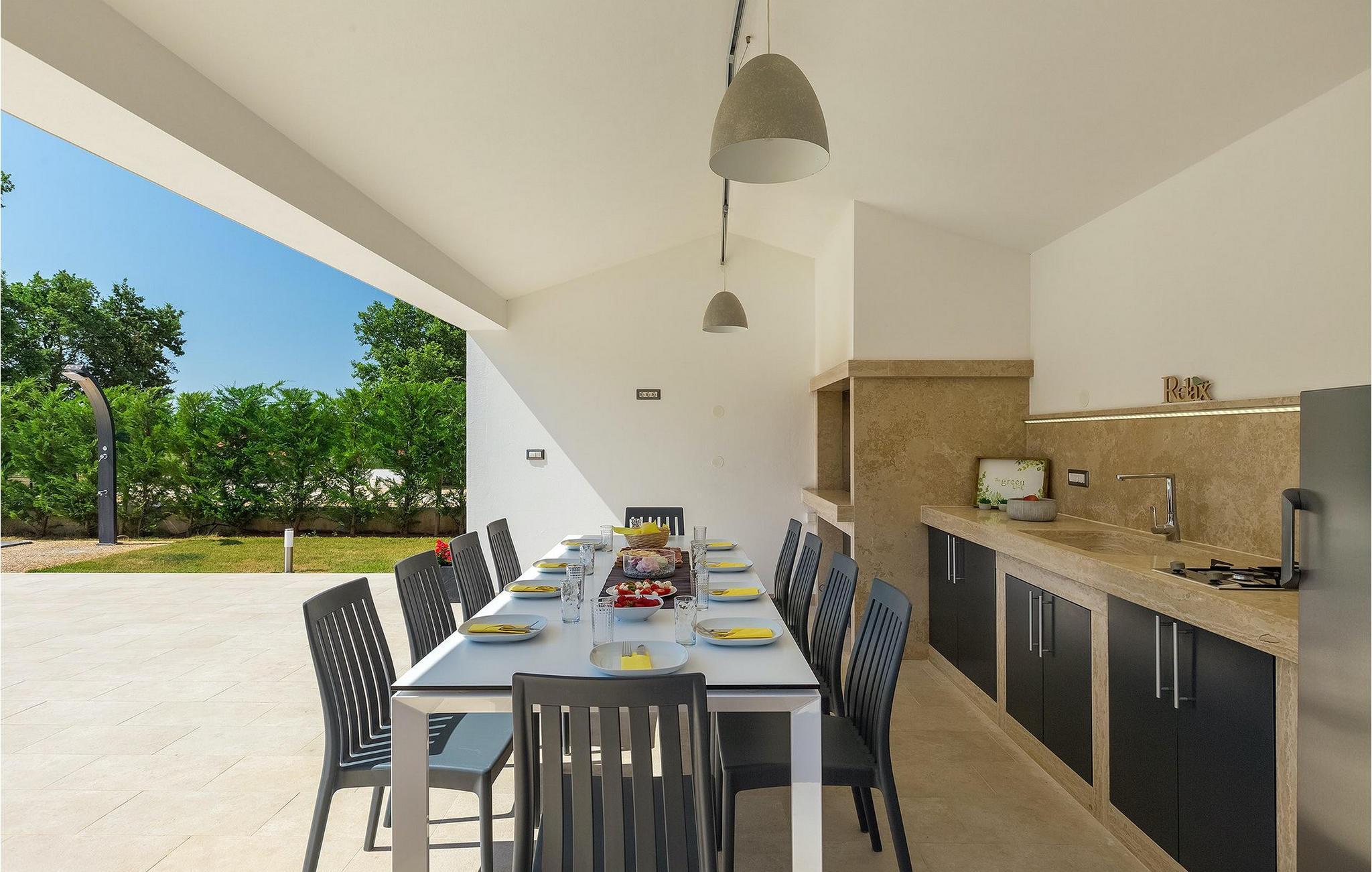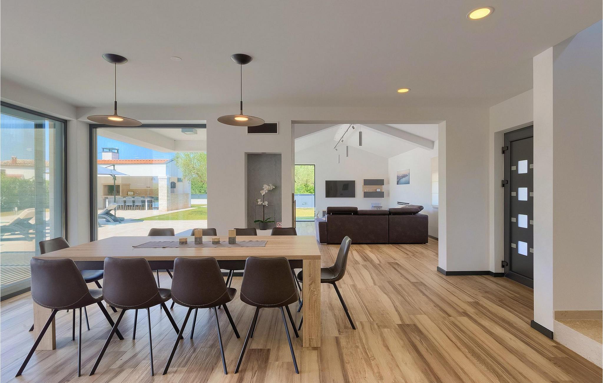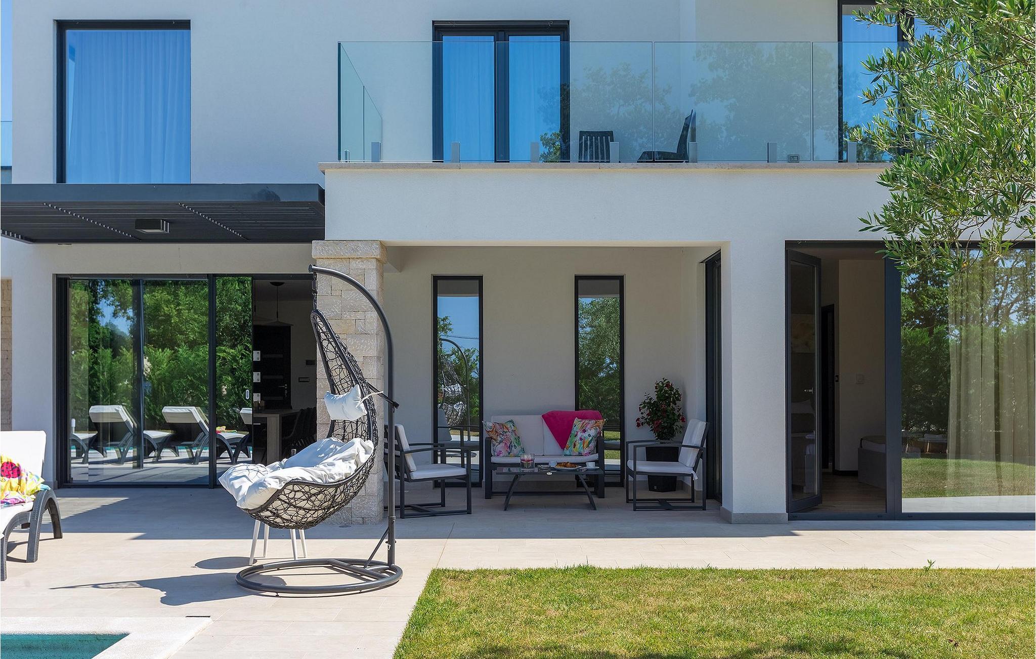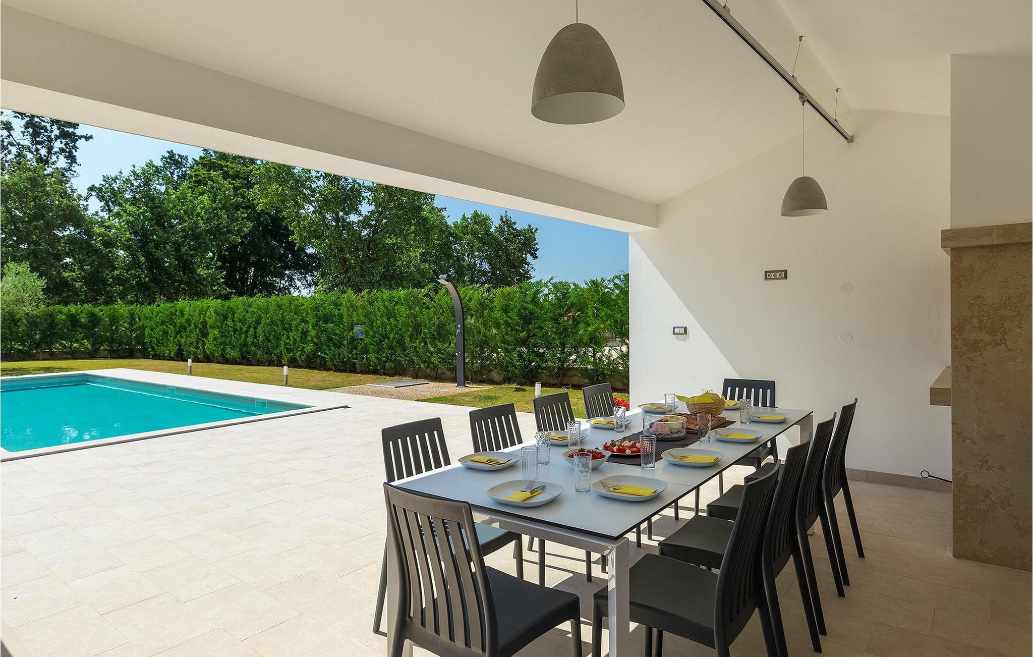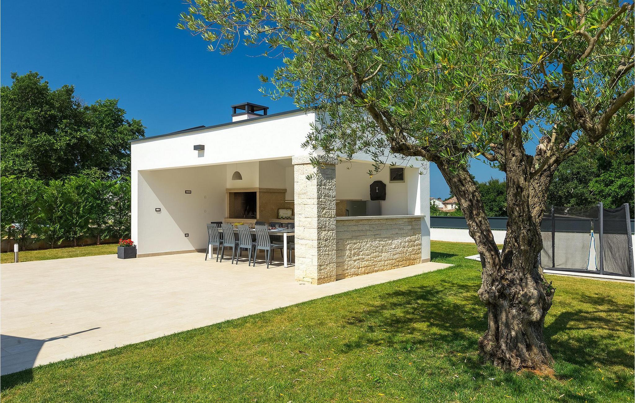 Villa Silvia ist eine elegante, komfortable Villa, gelegen in der Nähe von einem der beliebtesten touristischen Urlaubsdestinationen in Istrien - der schönen Stadt Porec. Die Villa verfügt über 4 Schlafzimmer und kann bis zu 10 Personen beherbergen. Im Erdgeschoss finden Sie ein geräumiges und elegantes Wohnzimmer verbunden mit dem Essbereich und einer völlig ausgestatteten Küche mit Frühstücksbar vor. Auf dieser Etage befinden sich auch ein Schlafzimmer mit en-suite Badezimmer, ein Wäscheraum und ein Gäste-WC. Die anderen 3 lichtdurchfluteten und gemütlichen Schlafzimmer befinden sich auf der oberen Etage. Sie sind alle mit einem Doppelbett ausgestattet und verfügen über ein eigenes Badezimmer. Zwei der Schlafzimmer im Obergeschoss teilen sich eine Terrasse, während ein Schlafzimmer eine eigene Terrasse hat. Von den Terrassen erstreckt sich ein schöner Ausblick auf den Pool und die Umgebung. Vom Wohn- / Essbereich haben Sie direkten Zugang zum 45 m2 großen privaten Pool. Der Außenbereich verfügt auch über eine Sommerküche mit Grill und einen Essbereich, wo sie einen entspannten Sommerabend mit lokalen Köstlichkeiten genießen können. Der gesamte Außenbereich und der Pool sind nachts beleuchtet.