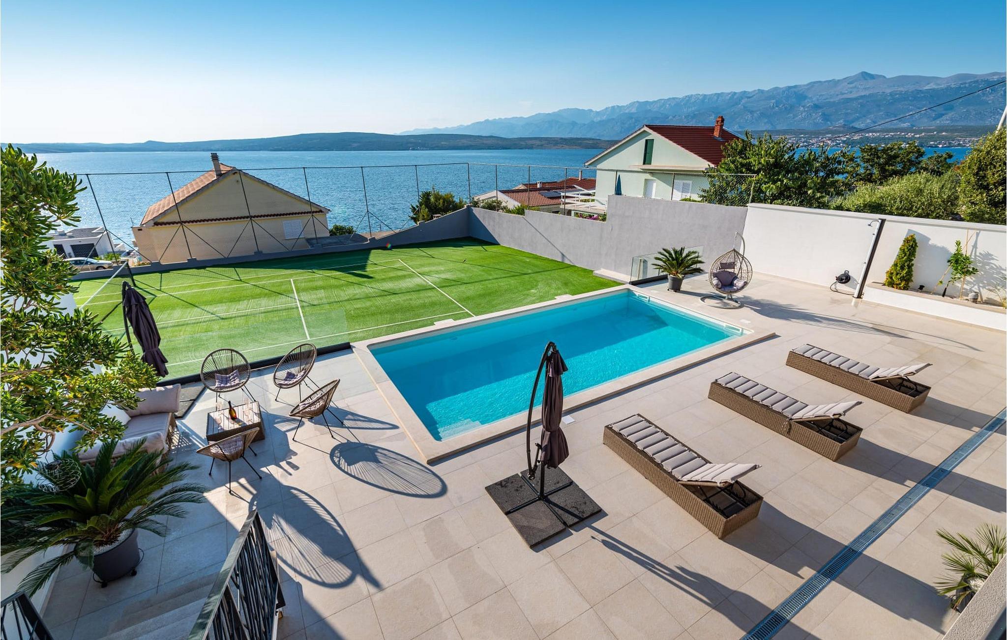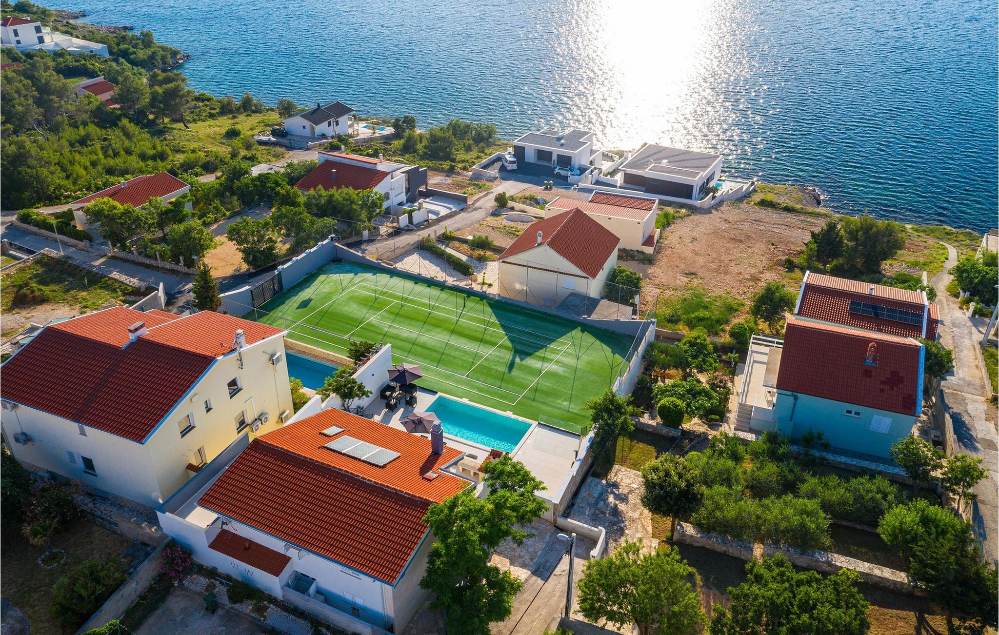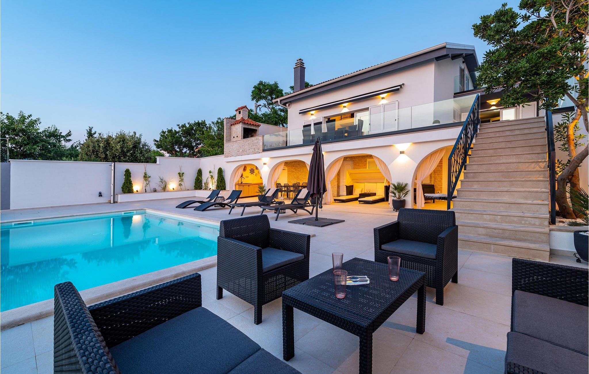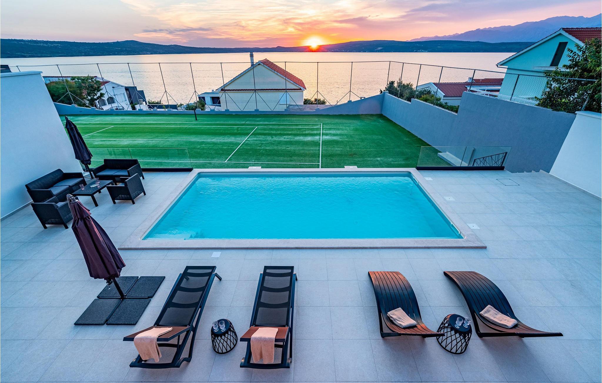 Für den ultimativen modernen Kurzurlaub und Urlaub an der Adria ist die Villa Ava in Novigrad in der Nähe von Zadar genau das Richtige. Diese moderne Villa in Novigrad bietet viele Möglichkeiten zur völligen Entspannung und zum Vergessen des Alltagslebens. Das prächtige, für absolute Privatsphäre geschützte Gebäude auf insgesamt drei Etagen bietet Vergnügen ohne Ablenkung und die Innen- und Außenanlagen sind mit modernen Annehmlichkeiten für einen äußerst angenehmen Aufenthalt für Erwachsene und Kinder auf insgesamt 1.000 Quadratmetern ausgestattet. Der Innen- und Außenbereich ist sorgfältig mit stilvollem Design und zeitloser Eleganz gestaltet, was zu einem ruhigen Raumgefühl führt. Eines der Lieblingsmerkmale dieser Villa ist die Tatsache, dass die Innen- und Außenräume ideal miteinander kommunizieren und mit all ihren modernen und funktionalen Annehmlichkeiten ein äußerst angenehmes Ganzes bilden. In der obersten Etage befinden sich zwei geräumige, helle, modern eingerichtete Schlafzimmer mit angeschlossenen En-Suite-Badezimmern in luxuriösem Design mit Badewannen und begehbaren Duschen, von denen eines über eine eigene Terrasse mit dazugehörigen Einrichtungen zum Entspannen verfügt. Neben den Zimmern gibt es auch eine Ecke zum Entspannen und Lesen mit einem Massagesessel. Die mittlere Etage besteht aus einem geräumigen, modern eingerichteten Wohnzimmer, Esszimmer, Küche, Schlafzimmern, Badezimmern und darunter einer Wellnessoase mit finnischer Sauna und einem Ruhebereich mit Zugang zu einem Teil der Terrasse mit Whirlpool. Vom Wohnzimmer aus gibt es einen Ausgang zu einer geräumigen Terrasse mit Blick auf das Meer und das Velebit-Gebirge. Die Terrasse ist mit einem Steingrill im Freien abgeschlossen. Die untere Etage ist die endgültige Kombination aus der Sport- und Erholungszone und der Hedonismus- und Unterhaltungszone im Außen- und Innenbereich. Im Innenteil gibt es nämlich eine Taverne mit überdachter Außenküche und Esszimmer, dann Innen- und Außenduschen, einen Bereich mit Massagetisch, ein Spielzimmer mit PlayStation, einen weiteren Raum mit Tischfußball und Darts sowie ein Fitnessstudio Davor steht ein Projektor für ein sommerliches Kinoerlebnis. Daran schließt sich ein großer Innenhofbereich mit einem wunderschönen perlweißen Swimmingpool an, von dem aus Sie einen Blick auf die gesamte Landschaft und das Novigrader Meer genießen können, sowie auf den dazugehörigen Tennisplatz aus Kunstrasen. Auf dem Tennisplatz gibt es auch weitere Sportmöglichkeiten für Fußball und Basketball. Schauen Sie sich für einen besseren Eindruck die Fotos an und erleben Sie sorgfältig ausgewählte Details und Dekorationen im Innen- und Außenbereich visuell. Bitte beachten Sie, dass diese Unterkunft keine Jugendgruppen oder Junggesellenabschiede akzeptiert. Eine Jugendgruppe in dieser Unterkunft besteht aus Personen unter 30 Jahren. Buchen Sie diese Unterkunft nicht, wenn Sie eine Jugendgruppe oder ein Junggesellenabschied sind, da Ihre Buchung nach der Buchung abgelehnt wird, was auch bei der Ankunft in der Unterkunft oder während Ihres Aufenthalts der Fall sein kann, und Sie keine Rückerstattung erhalten.