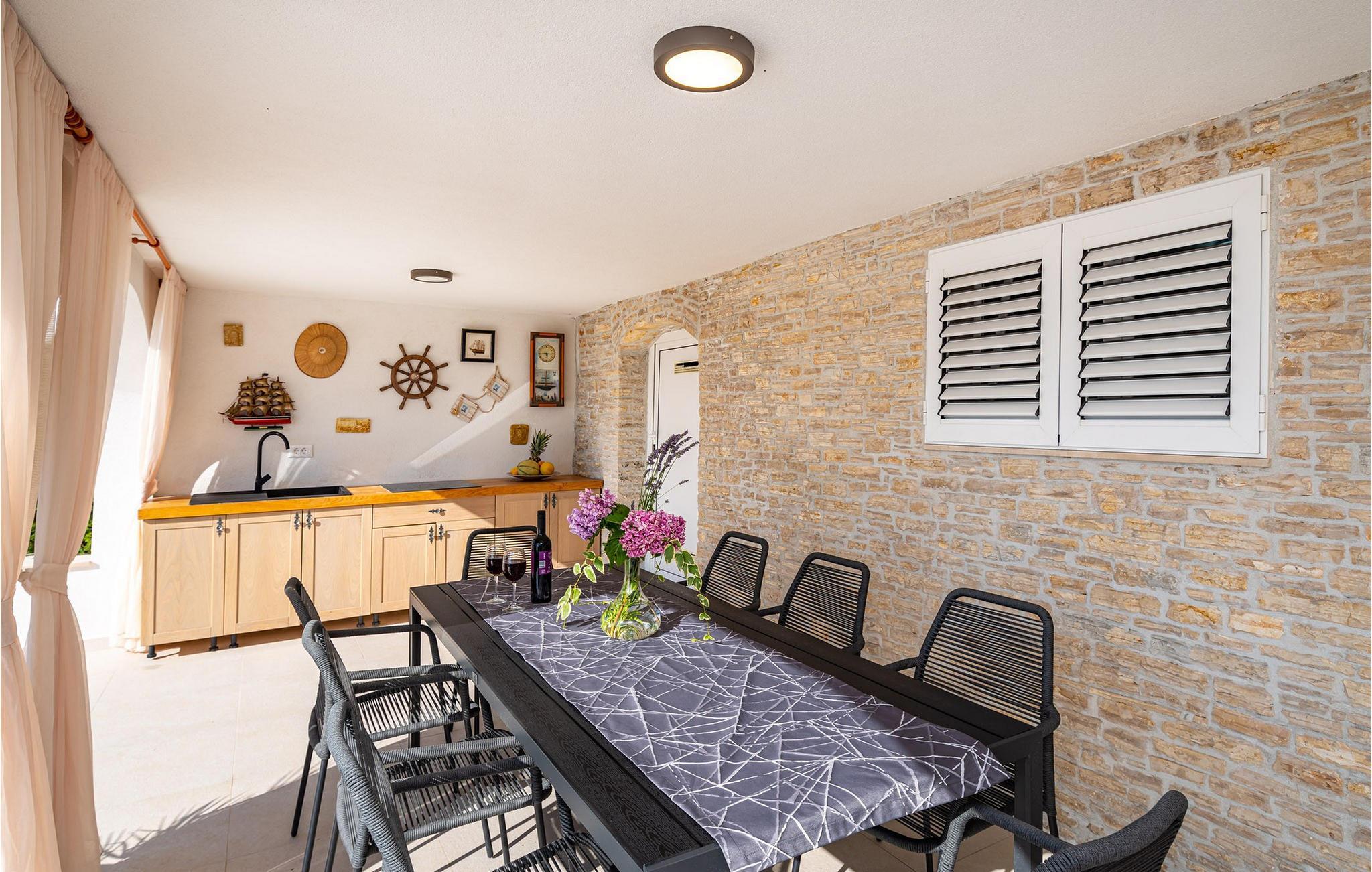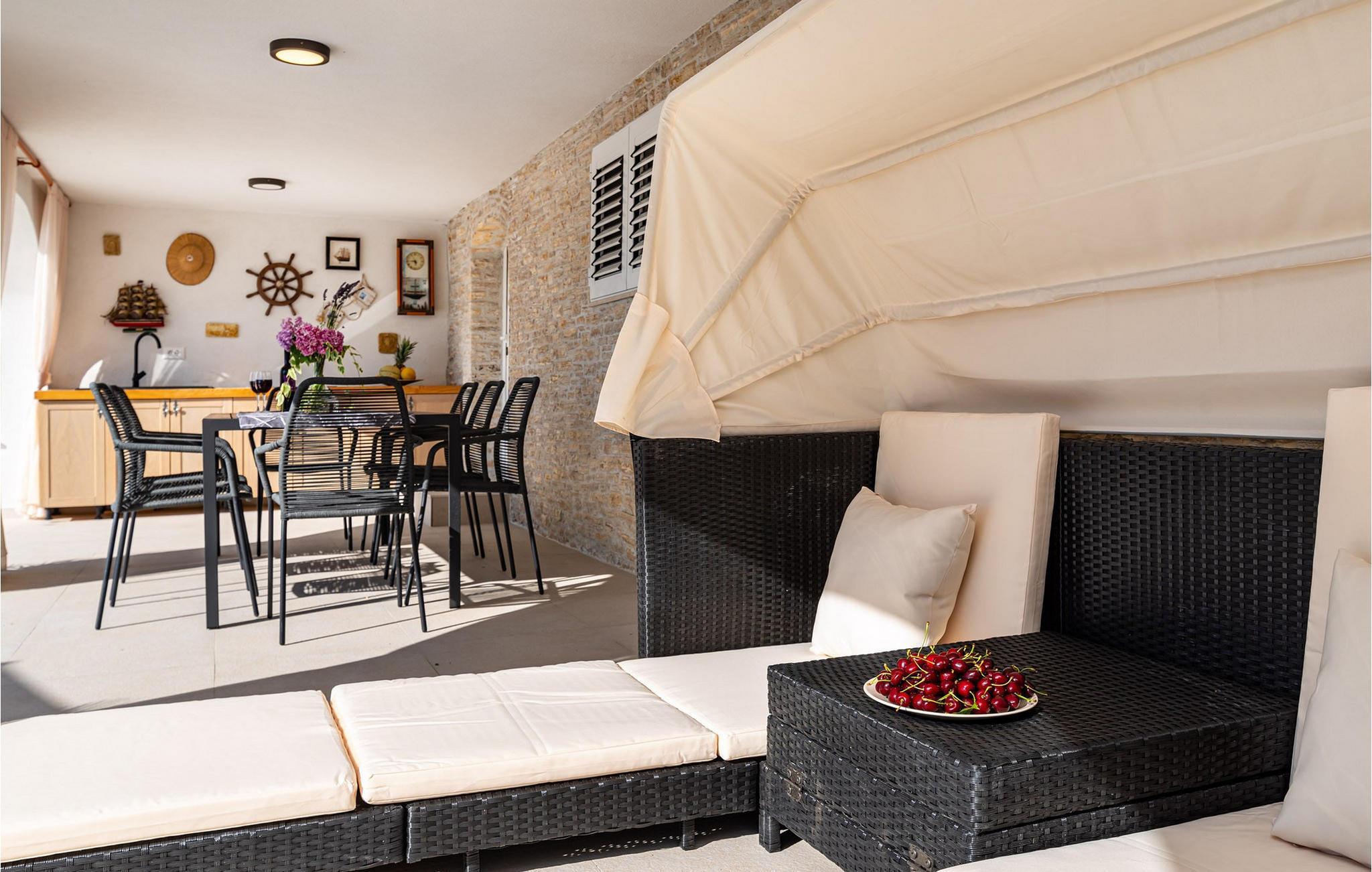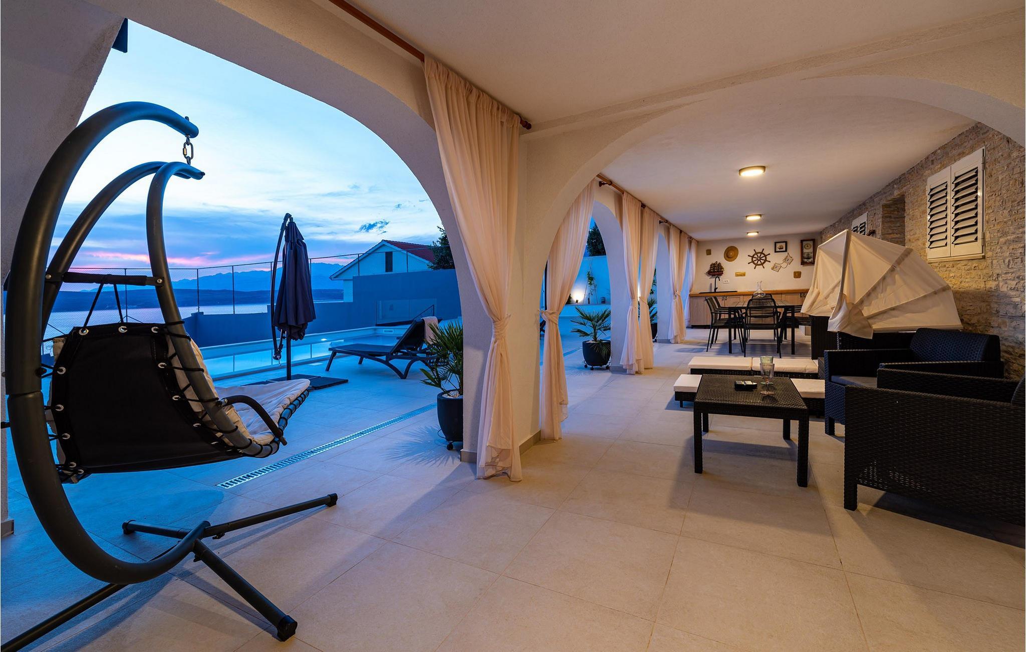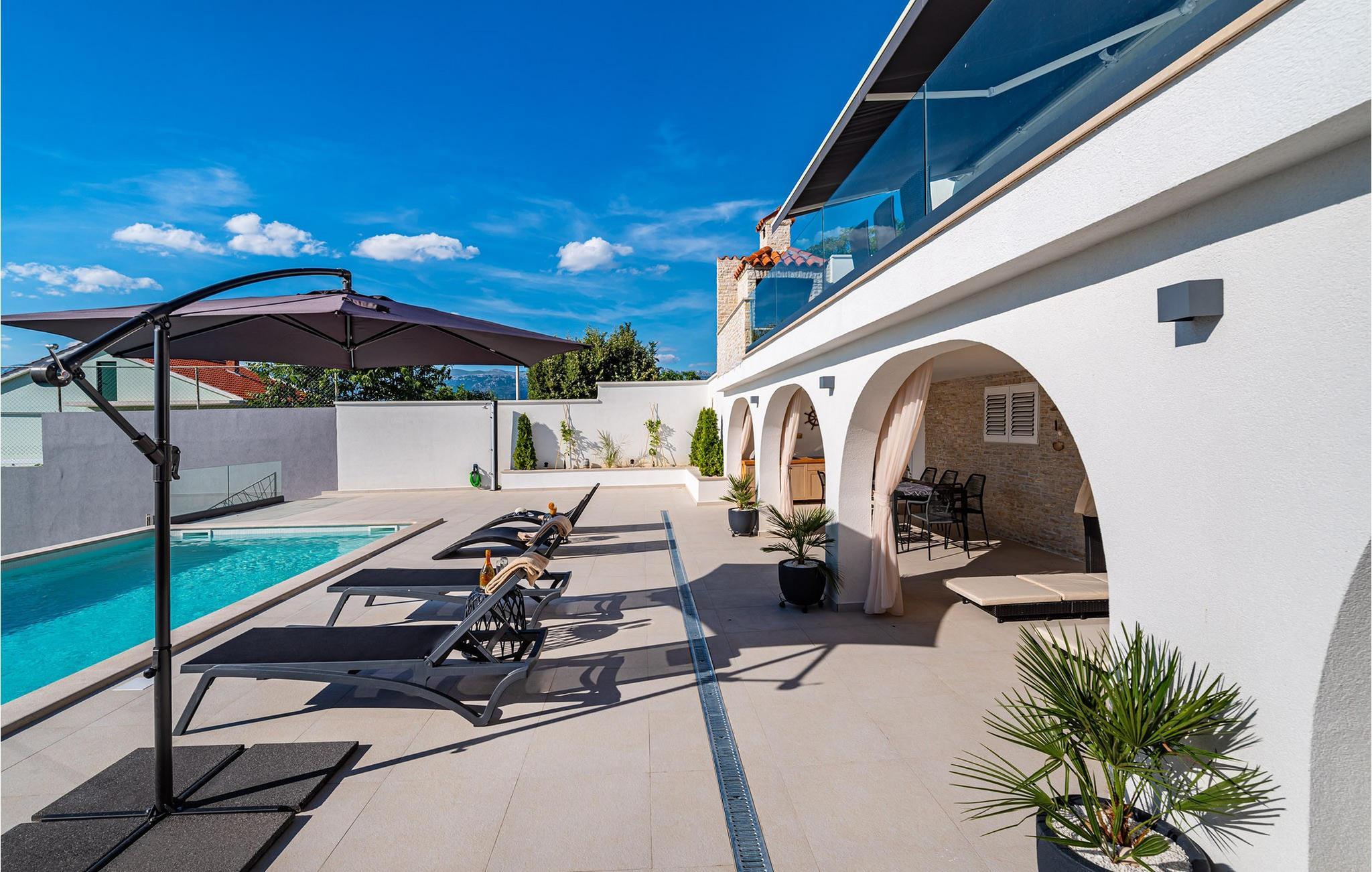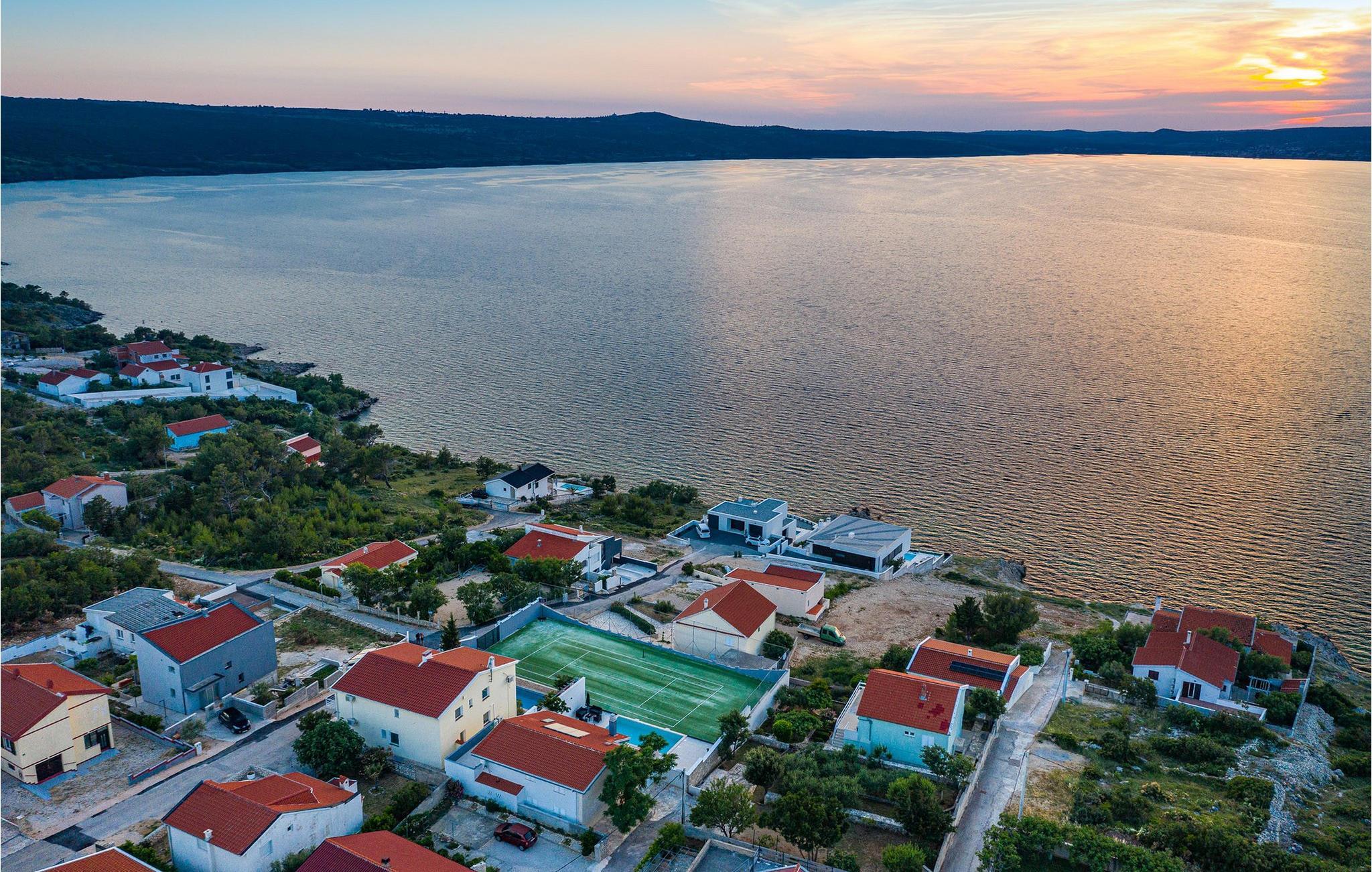 Für den ultimativen modernen Kurzurlaub und Urlaub an der Adria ist die Villa Ava in Novigrad in der Nähe von Zadar genau das Richtige. Diese moderne Villa in Novigrad bietet viele Möglichkeiten zur völligen Entspannung und zum Vergessen des Alltagslebens. Das prächtige, für absolute Privatsphäre geschützte Gebäude auf insgesamt drei Etagen bietet Vergnügen ohne Ablenkung und die Innen- und Außenanlagen sind mit modernen Annehmlichkeiten für einen äußerst angenehmen Aufenthalt für Erwachsene und Kinder auf insgesamt 1.000 Quadratmetern ausgestattet. Der Innen- und Außenbereich ist sorgfältig mit stilvollem Design und zeitloser Eleganz gestaltet, was zu einem ruhigen Raumgefühl führt. Eines der Lieblingsmerkmale dieser Villa ist die Tatsache, dass die Innen- und Außenräume ideal miteinander kommunizieren und mit all ihren modernen und funktionalen Annehmlichkeiten ein äußerst angenehmes Ganzes bilden. In der obersten Etage befinden sich zwei geräumige, helle, modern eingerichtete Schlafzimmer mit angeschlossenen En-Suite-Badezimmern in luxuriösem Design mit Badewannen und begehbaren Duschen, von denen eines über eine eigene Terrasse mit dazugehörigen Einrichtungen zum Entspannen verfügt. Neben den Zimmern gibt es auch eine Ecke zum Entspannen und Lesen mit einem Massagesessel. Die mittlere Etage besteht aus einem geräumigen, modern eingerichteten Wohnzimmer, Esszimmer, Küche, Schlafzimmern, Badezimmern und darunter einer Wellnessoase mit finnischer Sauna und einem Ruhebereich mit Zugang zu einem Teil der Terrasse mit Whirlpool. Vom Wohnzimmer aus gibt es einen Ausgang zu einer geräumigen Terrasse mit Blick auf das Meer und das Velebit-Gebirge. Die Terrasse ist mit einem Steingrill im Freien abgeschlossen. Die untere Etage ist die endgültige Kombination aus der Sport- und Erholungszone und der Hedonismus- und Unterhaltungszone im Außen- und Innenbereich. Im Innenteil gibt es nämlich eine Taverne mit überdachter Außenküche und Esszimmer, dann Innen- und Außenduschen, einen Bereich mit Massagetisch, ein Spielzimmer mit PlayStation, einen weiteren Raum mit Tischfußball und Darts sowie ein Fitnessstudio Davor steht ein Projektor für ein sommerliches Kinoerlebnis. Daran schließt sich ein großer Innenhofbereich mit einem wunderschönen perlweißen Swimmingpool an, von dem aus Sie einen Blick auf die gesamte Landschaft und das Novigrader Meer genießen können, sowie auf den dazugehörigen Tennisplatz aus Kunstrasen. Auf dem Tennisplatz gibt es auch weitere Sportmöglichkeiten für Fußball und Basketball. Schauen Sie sich für einen besseren Eindruck die Fotos an und erleben Sie sorgfältig ausgewählte Details und Dekorationen im Innen- und Außenbereich visuell. Bitte beachten Sie, dass diese Unterkunft keine Jugendgruppen oder Junggesellenabschiede akzeptiert. Eine Jugendgruppe in dieser Unterkunft besteht aus Personen unter 30 Jahren. Buchen Sie diese Unterkunft nicht, wenn Sie eine Jugendgruppe oder ein Junggesellenabschied sind, da Ihre Buchung nach der Buchung abgelehnt wird, was auch bei der Ankunft in der Unterkunft oder während Ihres Aufenthalts der Fall sein kann, und Sie keine Rückerstattung erhalten.
