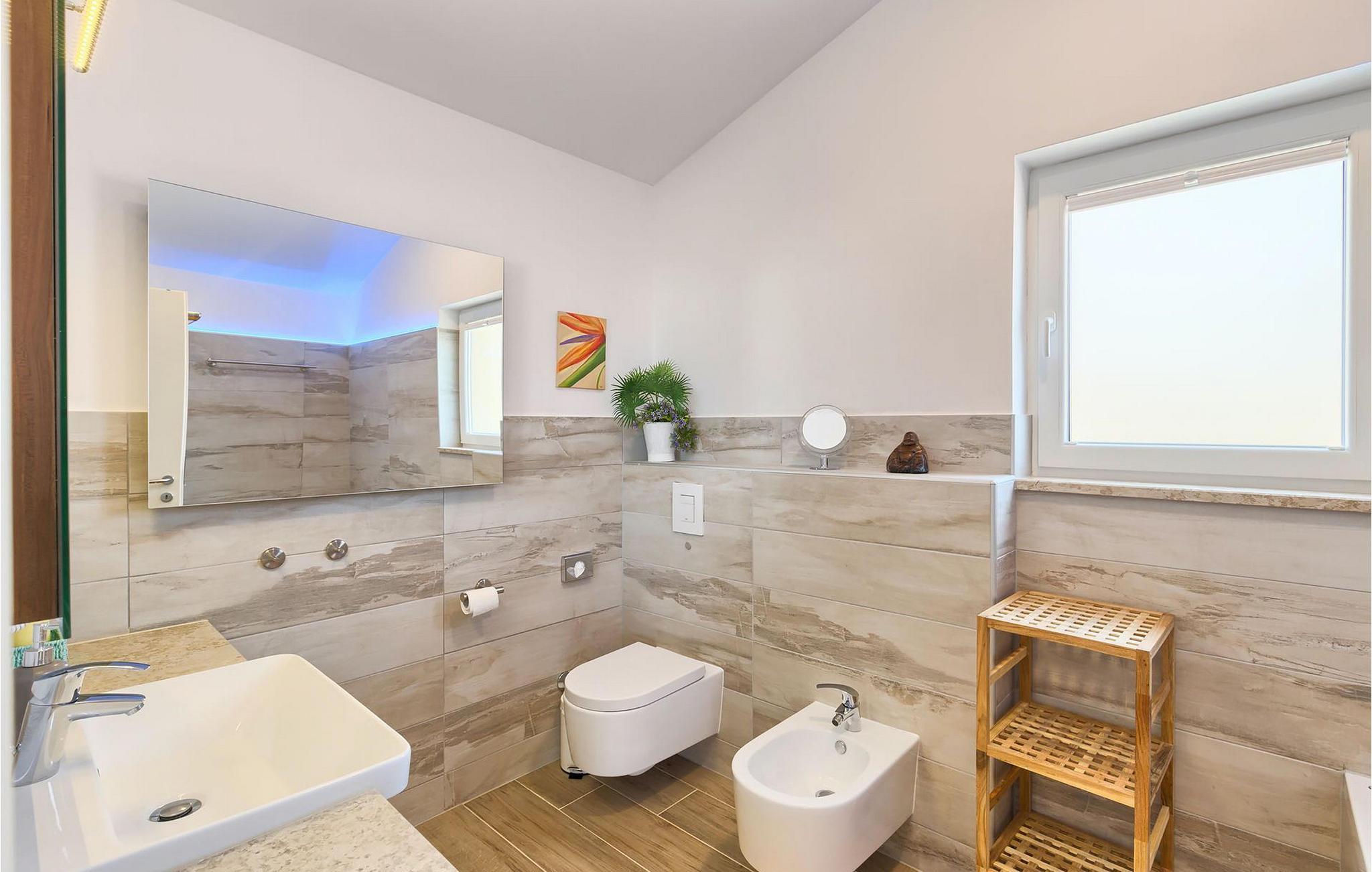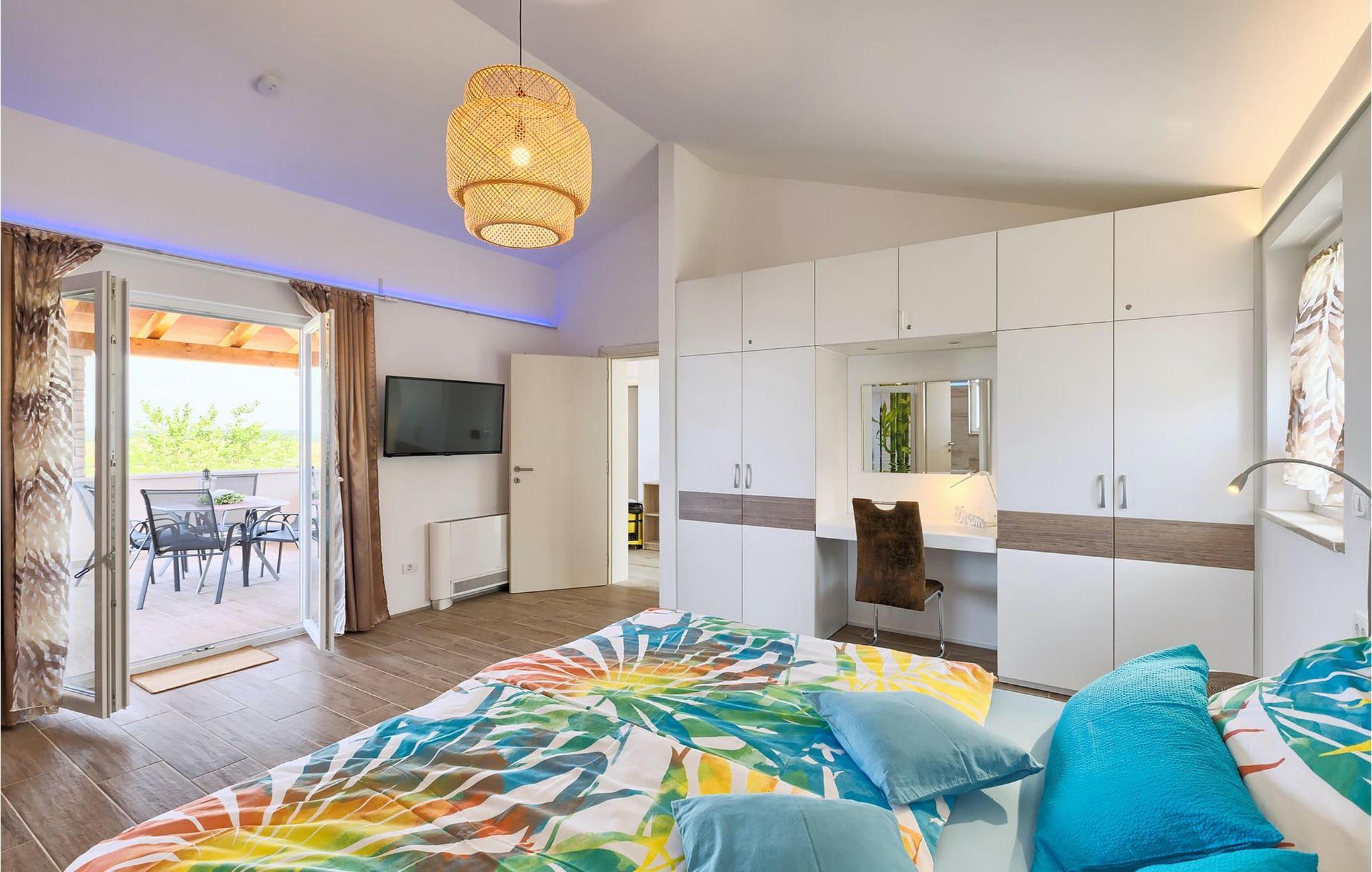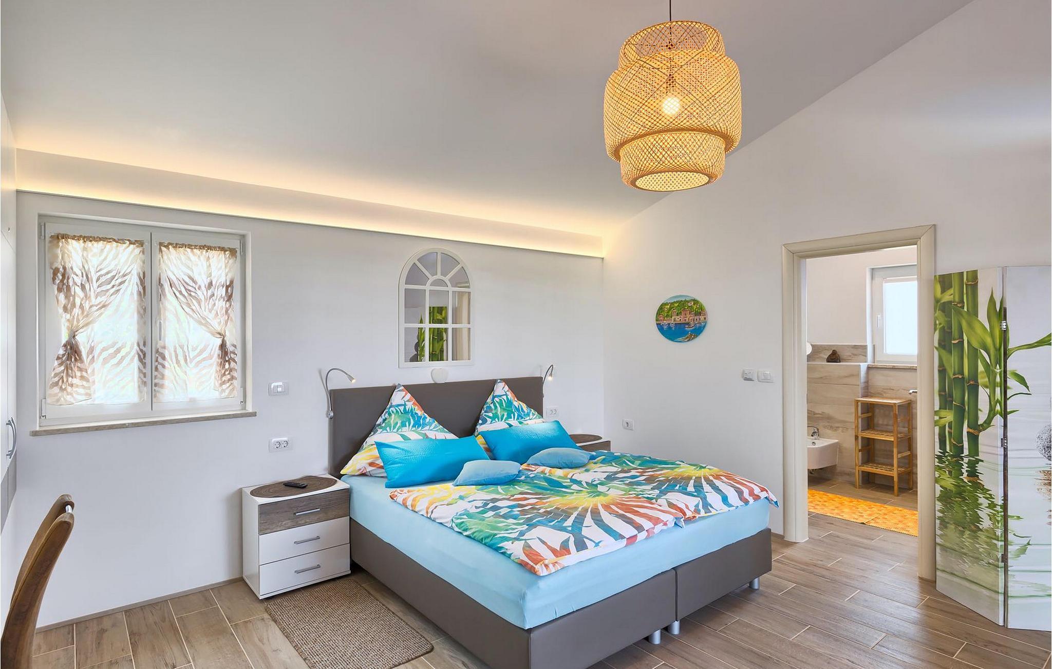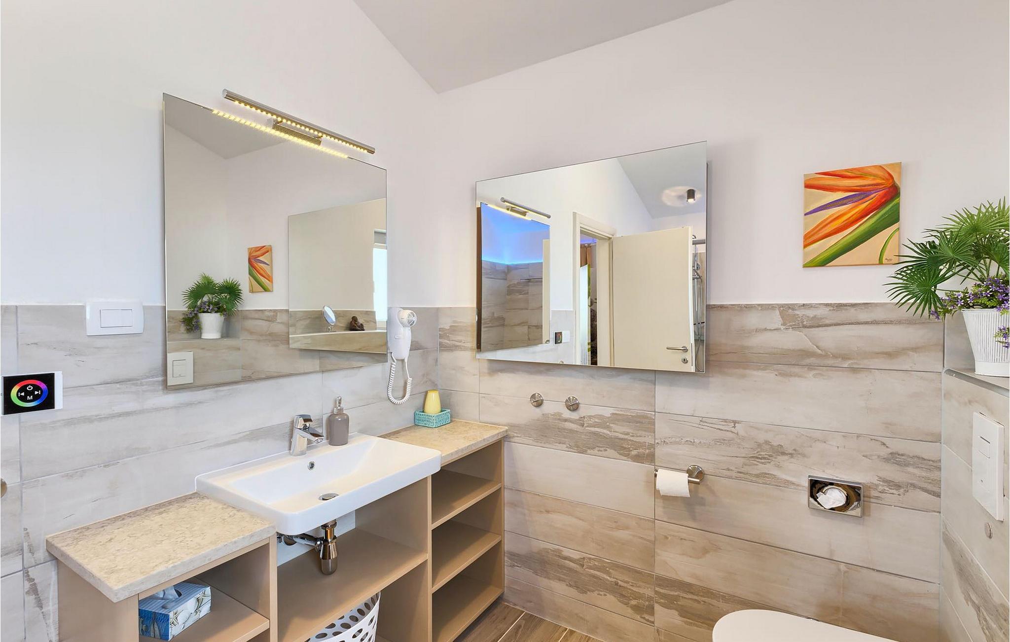 Zwei von den Schlafzimmern - alle mit Klimaanlage und Flachbildfernseher - liegen auf der oberen Etage, mit zwei hübschen Ensuite-Bädern mit Fußbodenheizung und einer geräumigen Terrasse, von wo aus man eine herrliche Aussicht über Olivenhaine bis zum Meer hin geniessen kann. Das lichtdurchflutete großzügige Erdgeschoss mit seinem offenen Layout teilt sich sehr geschmackvoll eingerichtet in Küchen-, Ess- und Wohnbereich mit einem gemütlichen Kamin und bildet den gesellschaftlichen Mittelpunkt des Hauses. Hier befindet sich auch das dritte Schlafzimmer, auch dieses mit Klimaanlage und Flachbildfernseher, sowie einem Ensuite-Bad. Fast alle Räume und Bäder sind mit einer ambiente LED-Beleuchtung ausgestattet, die individuell an die Stimmung angepasst werden kann.