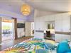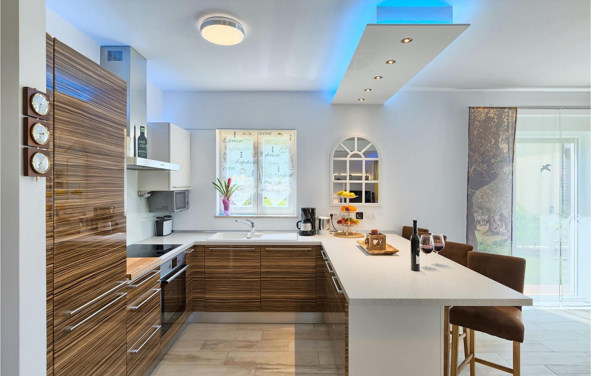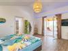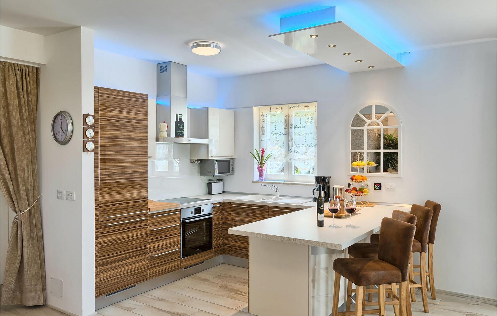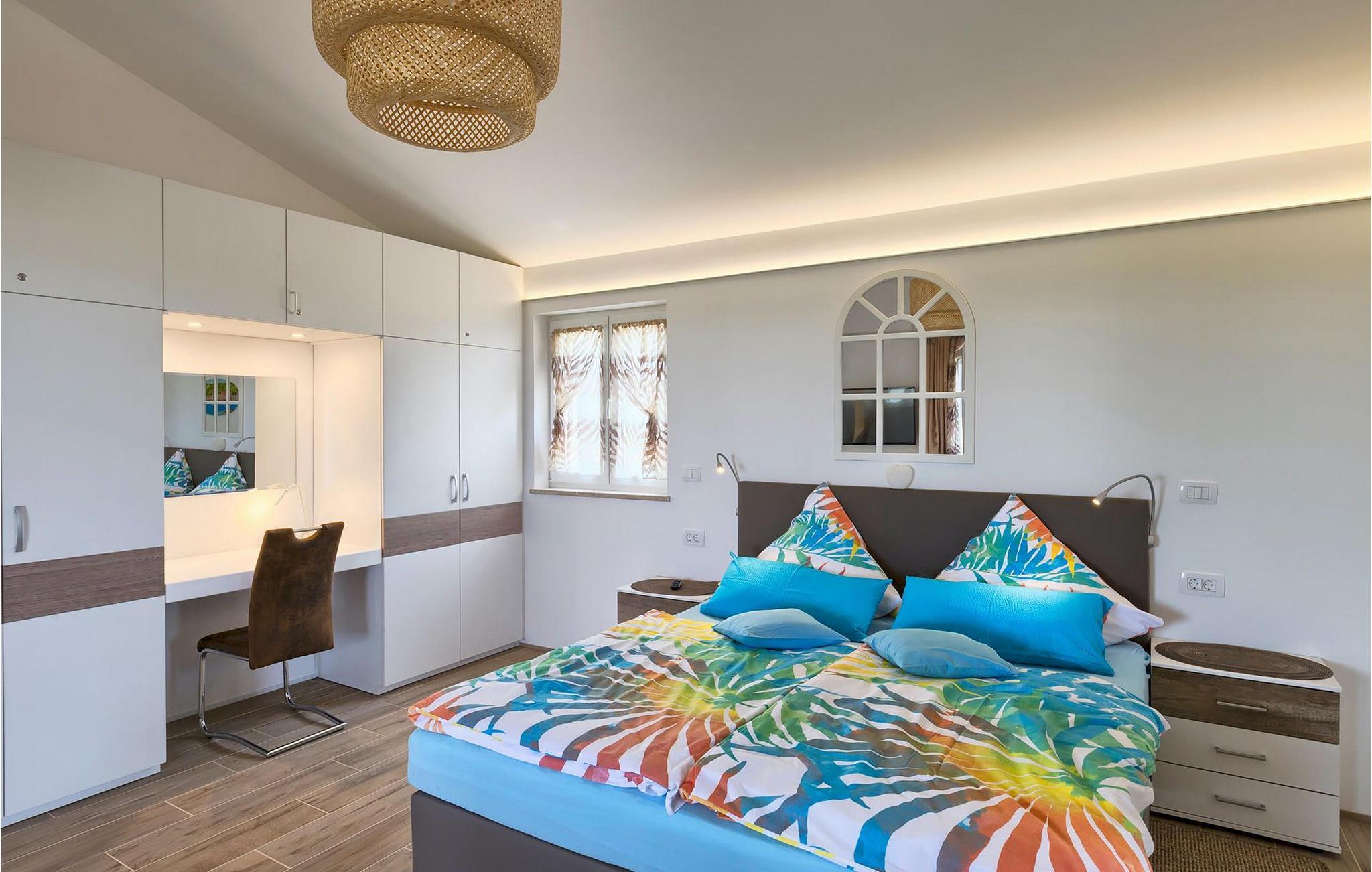 Zwei von den Schlafzimmern - alle mit Klimaanlage und Flachbildfernseher - liegen auf der oberen Etage, mit zwei hübschen Ensuite-Bädern mit Fußbodenheizung und einer geräumigen Terrasse, von wo aus man eine herrliche Aussicht über Olivenhaine bis zum Meer hin geniessen kann. Das lichtdurchflutete großzügige Erdgeschoss mit seinem offenen Layout teilt sich sehr geschmackvoll eingerichtet in Küchen-, Ess- und Wohnbereich mit einem gemütlichen Kamin und bildet den gesellschaftlichen Mittelpunkt des Hauses. Hier befindet sich auch das dritte Schlafzimmer, auch dieses mit Klimaanlage und Flachbildfernseher, sowie einem Ensuite-Bad. Fast alle Räume und Bäder sind mit einer ambiente LED-Beleuchtung ausgestattet, die individuell an die Stimmung angepasst werden kann.