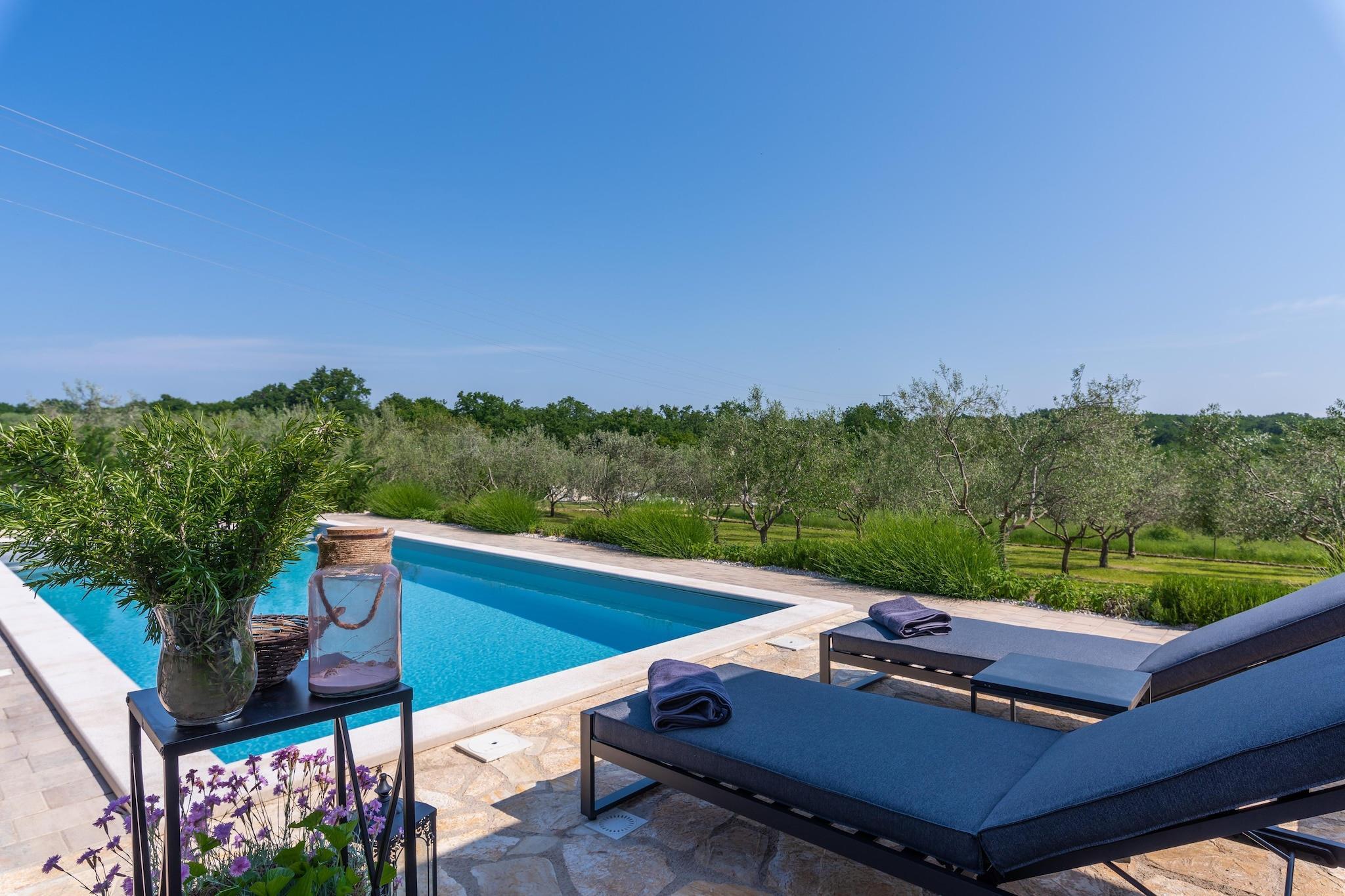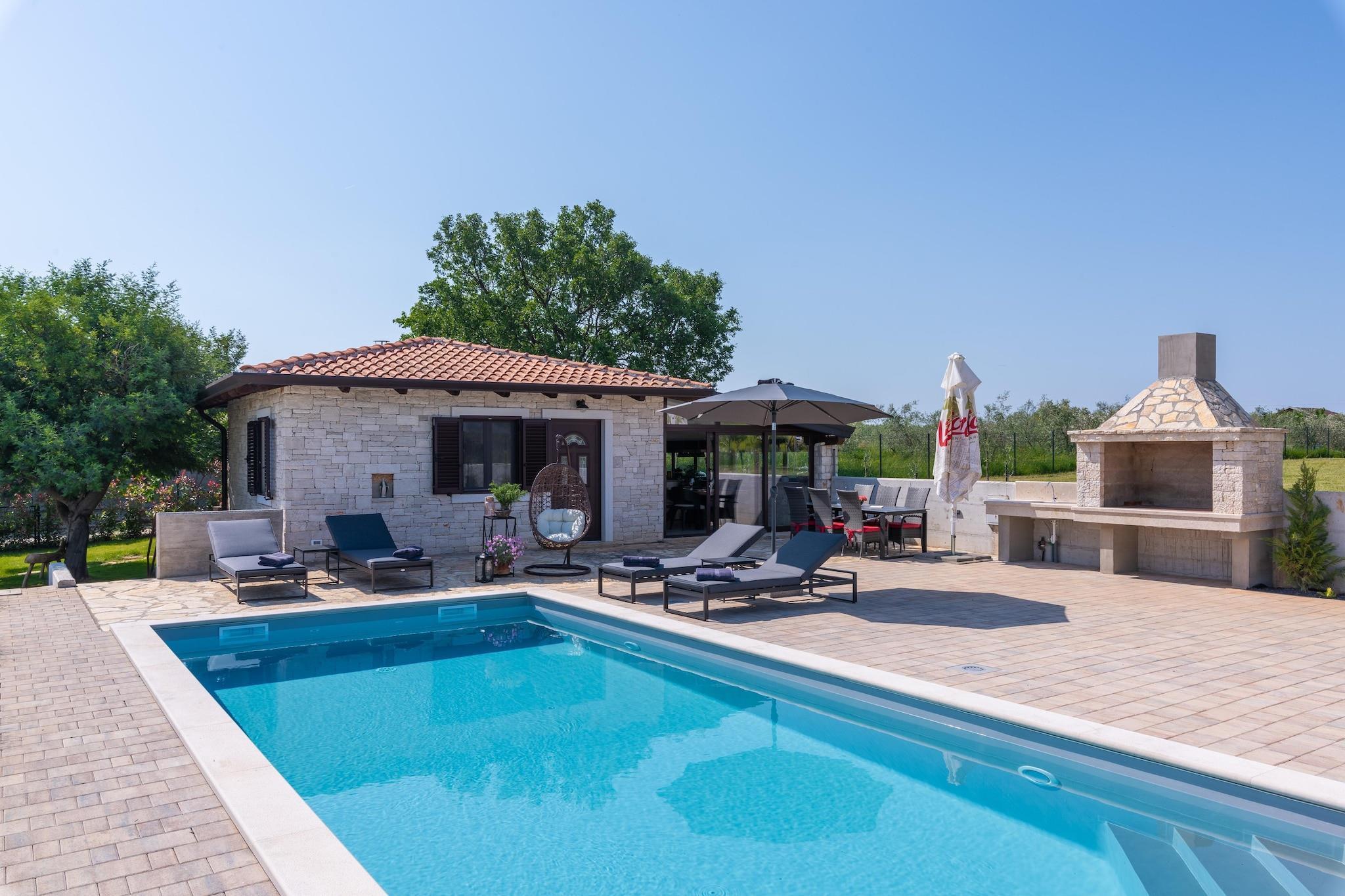 Parterre: (Wohnzimmer(Doppelbett, TV(Flatscreen, Satellit), Sitzecke, Klimaanlage), Küche(Esstisch, Wasserkocher, Toaster, Kochherd, Backofen, Mikrowelle, Spülmaschine, Kühl-/Gefrierkombination), Schlafzimmer mit Badezimmer(Doppelbett, TV(Flatscreen, Satellit), Dusche, Waschbecken, Toilette, Bidet, Klimaanlage), Badezimmer(Dusche, Waschbecken, Toilette), Terrasse(alleinige Nutzung)) Waschmaschine, Klimaanlage, Terrasse, Garten, Gartenmöbel, Liegen, Grill, Parkplatz, Sonnenschirm, Pool(alleinige Nutzung), Gartenlounge