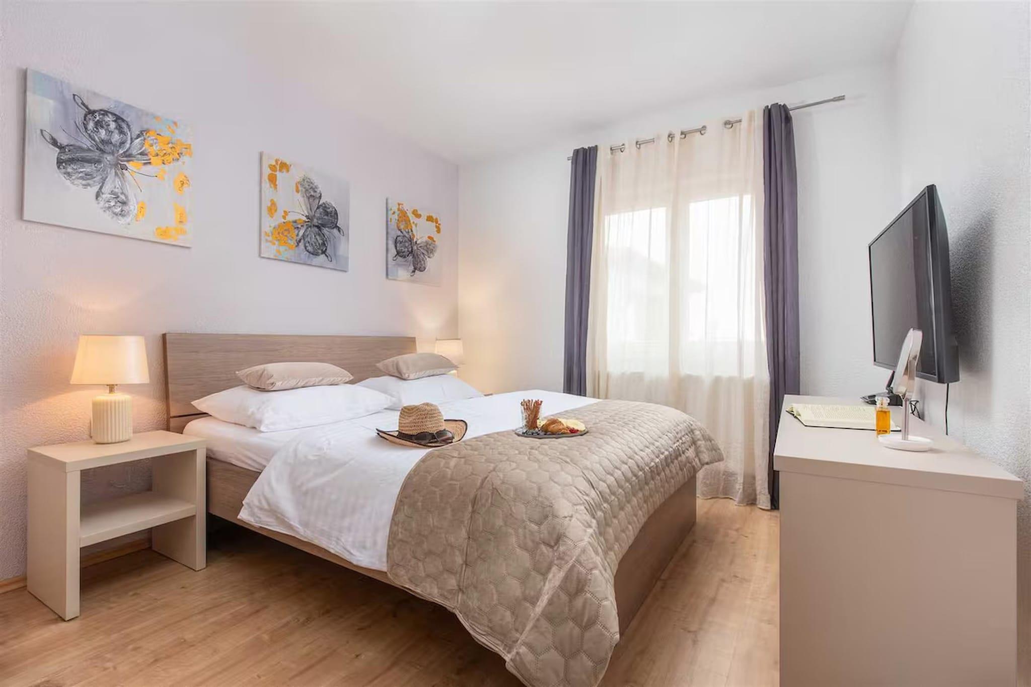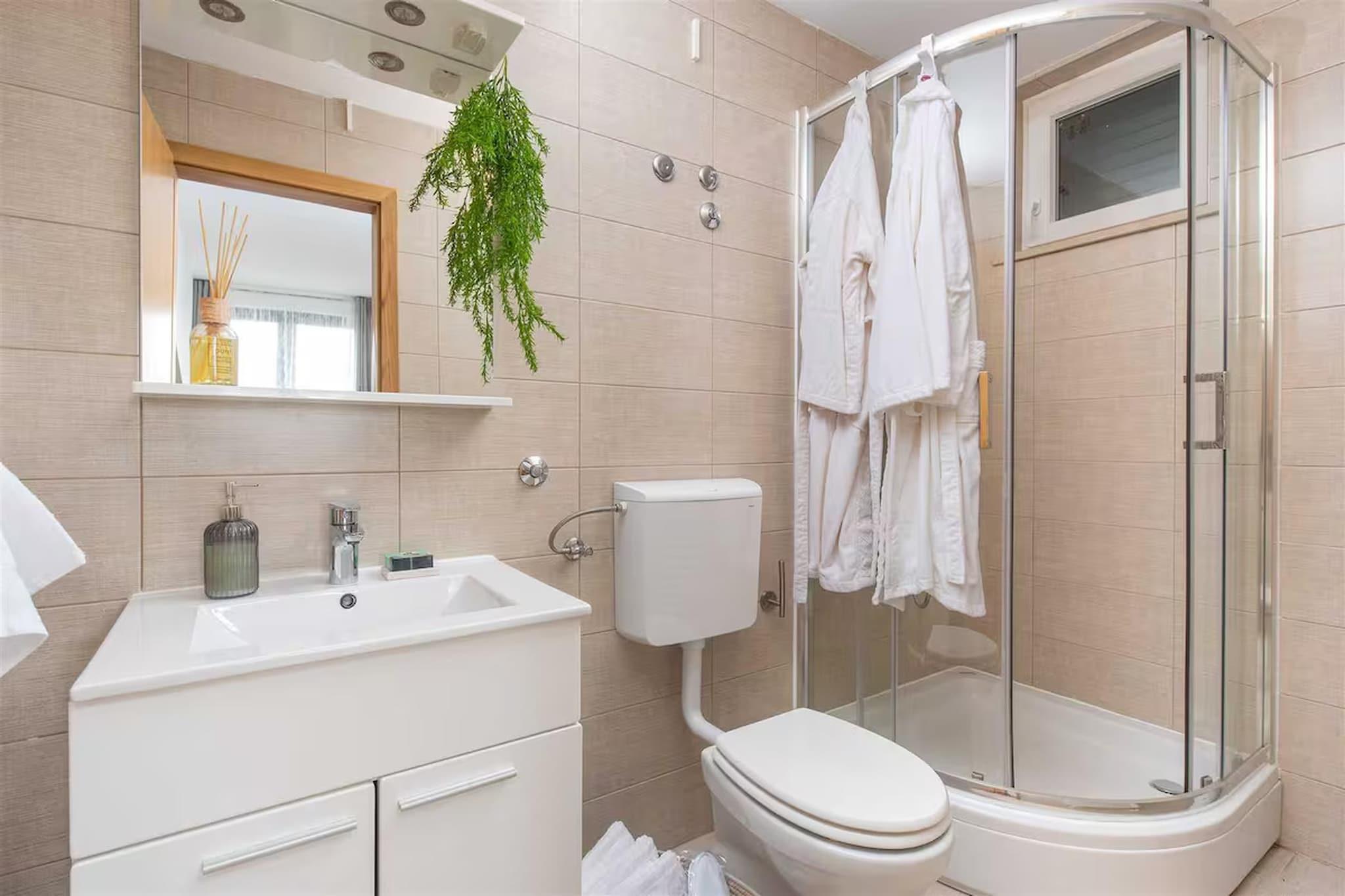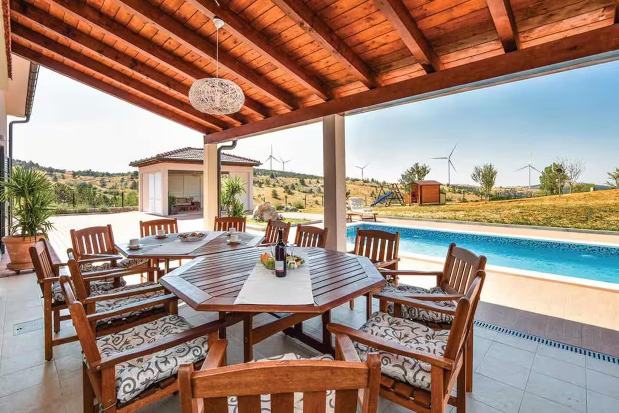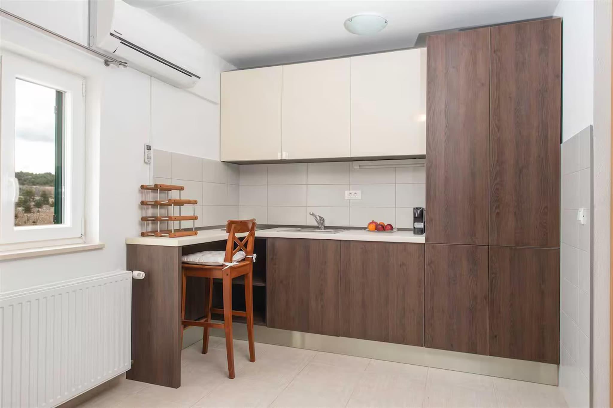 Inmitten der wunderschönen Küstenlandschaft von Okrug Gornji nahe der historischen Stadt Trogir bietet diese geräumige Villa einen eleganten mediterranen Rückzugsort, ideal für entspannte Gruppenaufenthalte. Umgeben vom Charme der dalmatinischen Küste, bietet das Anwesen eine ruhige Umgebung, in der Gäste sonnige Tage am Pool, malerische Spaziergänge am Meer und die Nähe zu Stränden, Cafés und Restaurants am Wasser genießen können. Die Villa ist durchdacht auf mehrere Ebenen aufgeteilt und bietet so ausreichend Platz für größere Gruppen. Im Erdgeschoss befinden sich ein heller Wohn- und Essbereich mit bequemen Sitzgelegenheiten, Kamin, Fernseher und Esstisch sowie eine offene Küche mit Kaffeemaschine, Backofen, Geschirrspüler und Kühl-/Gefrierkombination. Ein Schlafzimmer auf dieser Ebene verfügt über ein Doppelbett, ein Schlafsofa und ein modernes Badezimmer mit Dusche und WC. Im ersten Stock ergänzt eine weitere offene Küche mit allen notwendigen Geräten zwei weitere Schlafzimmer, die jeweils mit einem Doppelbett und einem eigenen Badezimmer ausgestattet sind. Ein Nebengebäude sorgt für zusätzliche Privatsphäre mit einer weiteren offenen Küche und einem vierten Schlafzimmer mit Doppelbett und Badezimmer. Klimaanlage, Heizung, WLAN, Waschmaschine und Wäschetrockner garantieren Komfort während des gesamten Aufenthalts. Der Außenbereich ist ideal zum Entspannen und für gesellige Stunden. Ein privater, beheizter Swimmingpool mit Sonnenliegen und Gartenmöbeln lädt zum Verweilen unter der dalmatinischen Sonne ein. Gäste können außerdem den Garten mit Grill, Außenkamin und Essbereich im Freien nutzen. Billard, Tischtennis und Fitnessgeräte runden das Angebot ab. Parkplätze stehen direkt am Haus zur Verfügung.