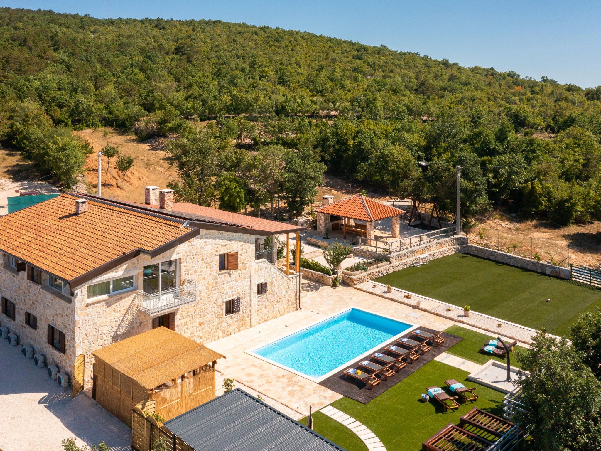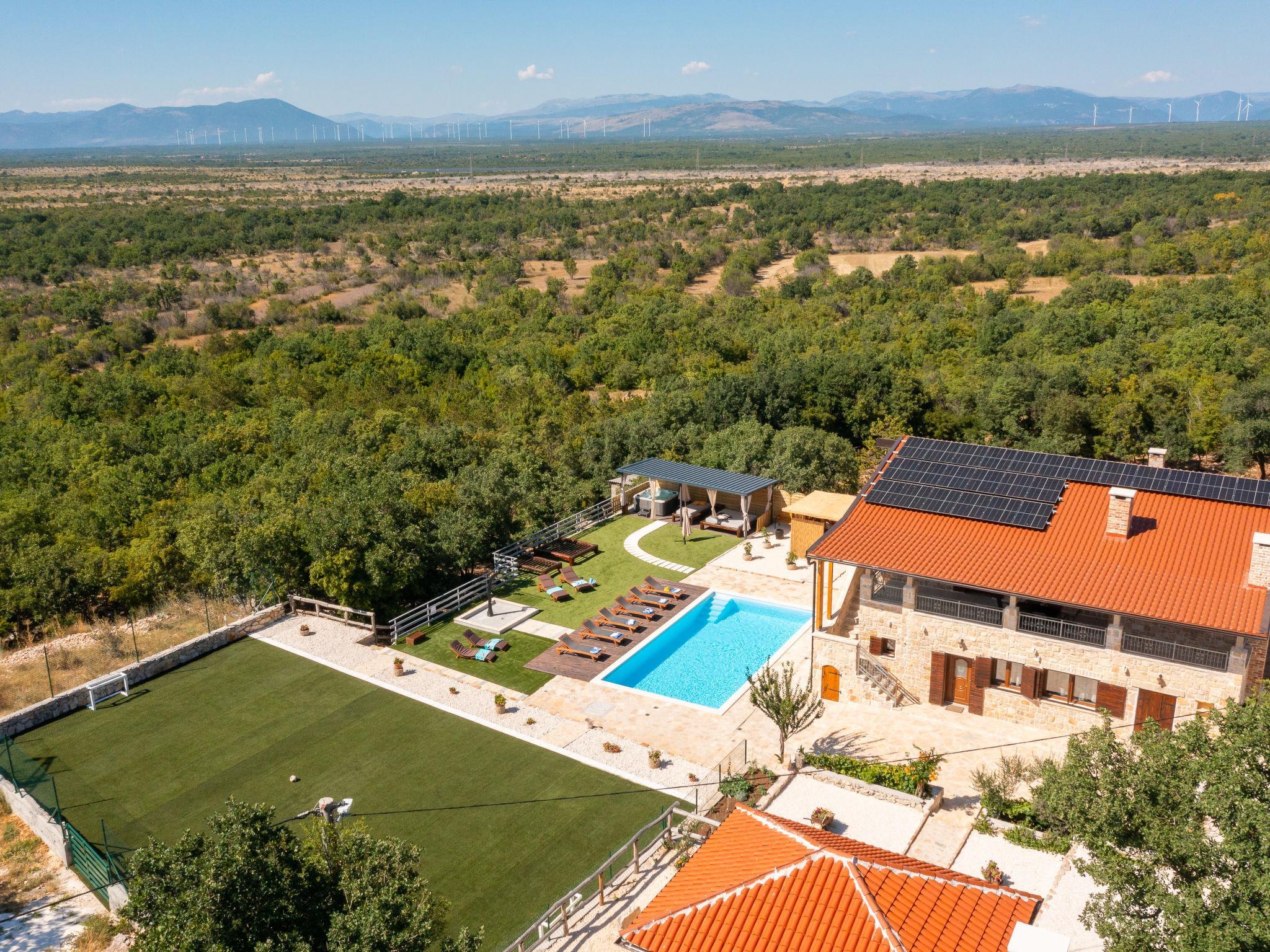 Lukar 3 km von Oklaj: Einfamilienhaus "Perva". Ruhige, sonnige Lage, 48 km vom Meer, im Grünen. Zur Alleinbenutzung: Grundstück 3'500 m2 (eingezäunt), Schwimmbad eckig, beheizt (10 x 5 m, 150 cm tief, saisonale Verfügbarkeit: 15.Mai. - 30.Sep.) mit Innentreppe. Aussendusche, Sprudelbad, Tischtennis, Laube (30 m2), Terrasse (30 m2), Gartenmöbel, Grill, Kinderspielplatz (Schaukel). Im Hause: Internetzugang, Fitnessraum, Trampolin, Waschmaschine, Wäschetrockner. Parkplatz (für 6 Autos) beim Haus auf dem Grundstück. Einkaufsgeschäft 3 km, Restaurant 17 km, Café 3 km, Bushaltestelle 3.5 km, Kieselstrand 48 km. Radweg 2 km. Nahe gelegene Sehenswürdigkeiten: NP Krka 28 km.