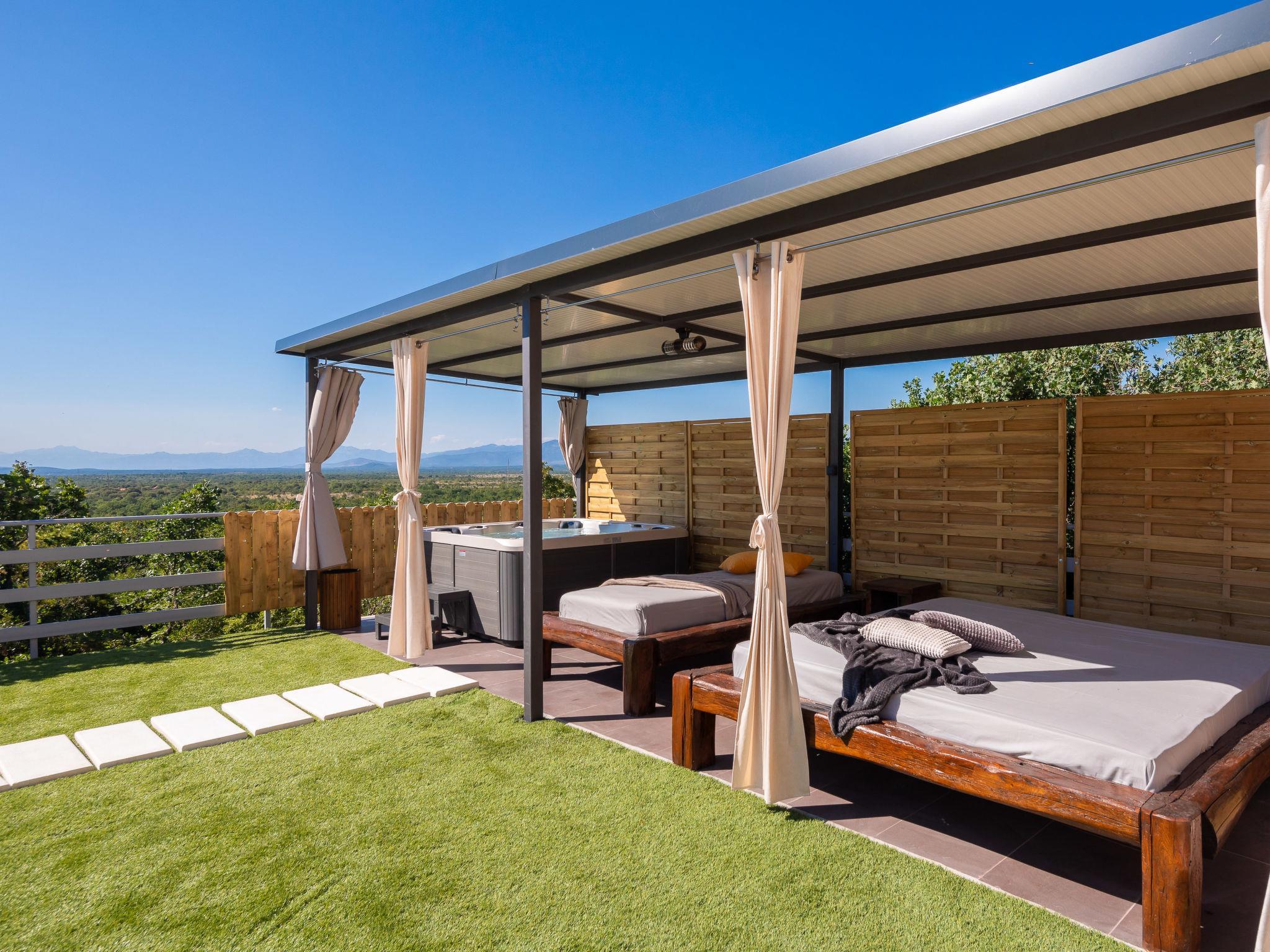 8-Zimmer-Haus 370 m2 auf 2 Stockwerken, Südwestlage. Komfortabel eingerichtet: Wohn-/Esszimmer 30 m2 mit Küchenblock und Sat-TV (Flachbildschirm), Klimaanlage. Ausgang zur Terrasse. 1 Zimmer mit 1 franz. Bett (180 cm, Länge 200 cm), Klimaanlage. Küche (Backofen, Geschirrspüler, 4 Glaskeramikplatten, Wasserkocher, Mikrowelle, Tiefkühler, elektrische Kaffeemaschine). Ausgang zum Schwimmbad. Dusche/WC. Obergeschoss: 1 Zimmer mit 1 franz. Bett (200 cm, Länge 200 cm), Dusche/WC und Klimaanlage. 1 Zimmer mit 1 franz. Bett (180 cm, Länge 200 cm), Dusche/WC und Klimaanlage. 1 Zimmer mit 2 Betten (100 cm, Länge 200 cm), Dusche/WC und Klimaanlage. (Aussentreppe) 1 Zimmer mit 1 franz. Bett (200 cm, Länge 200 cm), Klimaanlage. (Aussentreppe) 1 Zimmer mit 2 Betten (100 cm, Länge 200 cm), Klimaanlage. Dusche/WC. Warmluftheizung. Kleiner Balkon 3 m2, Terrasse 46 m2, überdacht. Terrassenmöbel, Liegestühle, Sitzplatz. Sicht auf das Schwimmbad und die Landschaft. Zur Verfügung: Waschmaschine, Kinderhochstuhl, Babybett, Haartrockner. Internet (Wireless LAN, gratis).