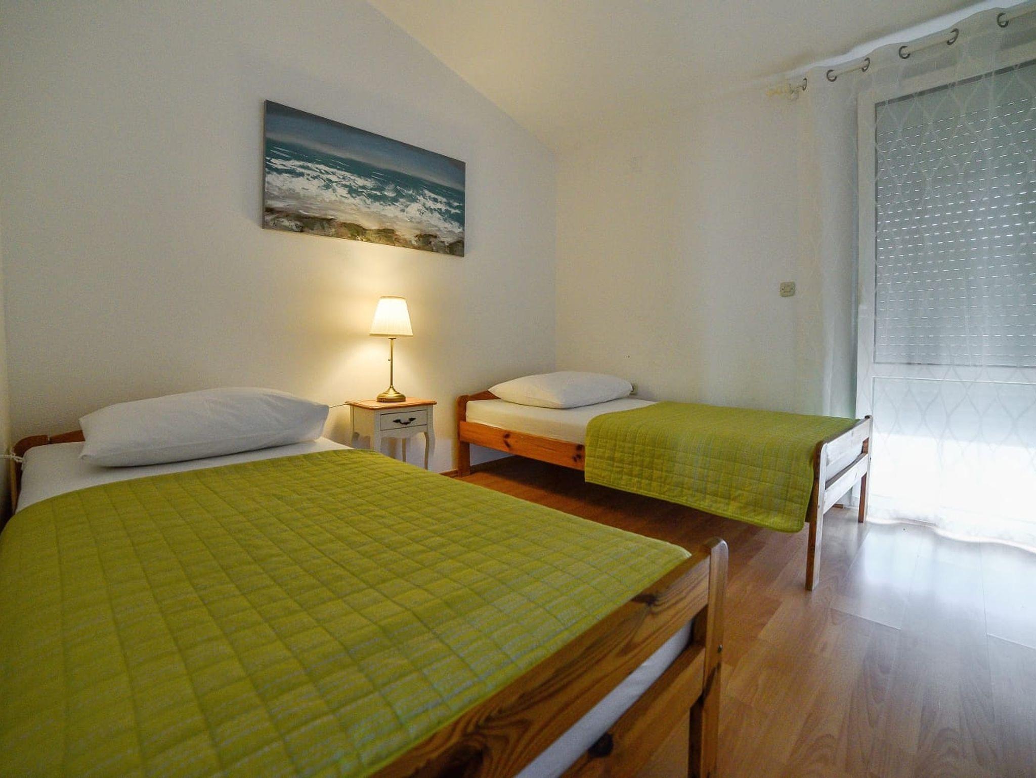 Ferienwohnung bietet Platz für 5 Gäste. Die Betten sind in Schlafzimmern, die es 2 gibt, und in Esszimmer, innerhalb einer Gesamtfläche von 45m2, angeordnet. Die Gäste haben eine eigene Terrasse zur Verfügung, auf der sie in warmen Sommernächten genießen können. Das Apartment bietet Meerblick. Es ist erlaubt, Speisen auf dem Gemeinschafts-Grill vorzubereiten. IM PREIS INBEGRIFFEN: Kurtaxe, Endreinigung, Klimatisierung, Parkplatz, Garage, Internet. VERBINDLICHE ZUSÄTZLICHE KOSTEN: Aufzahlung für Kurzaufenthalte (prozentualer Zuschlag pro Nächtigungsanzahl: 30% - 1, 20% - 2, 10% - 3). Die Verfügbarkeit zusätzlicher Dienstleistungen in Ihrem reservierten Termin und die Preise derselben (falls nicht aufgeführt) müssen im Voraus überprüft werden. Zusätzliche Dienstleistungen die in der Zahlungsaufforderung nicht aufgeführt sind werden direkt beim Vermieter bezahlt, angenommen der Gast nutzt auch diese. Ermäßigung auf den Grundpreis: Gratistag 14=13 (bei einem Aufenthalt von 14 Tagen oder mehr erhalten Sie einen Gratistag für den Aufenthalt bis 31.12.26).