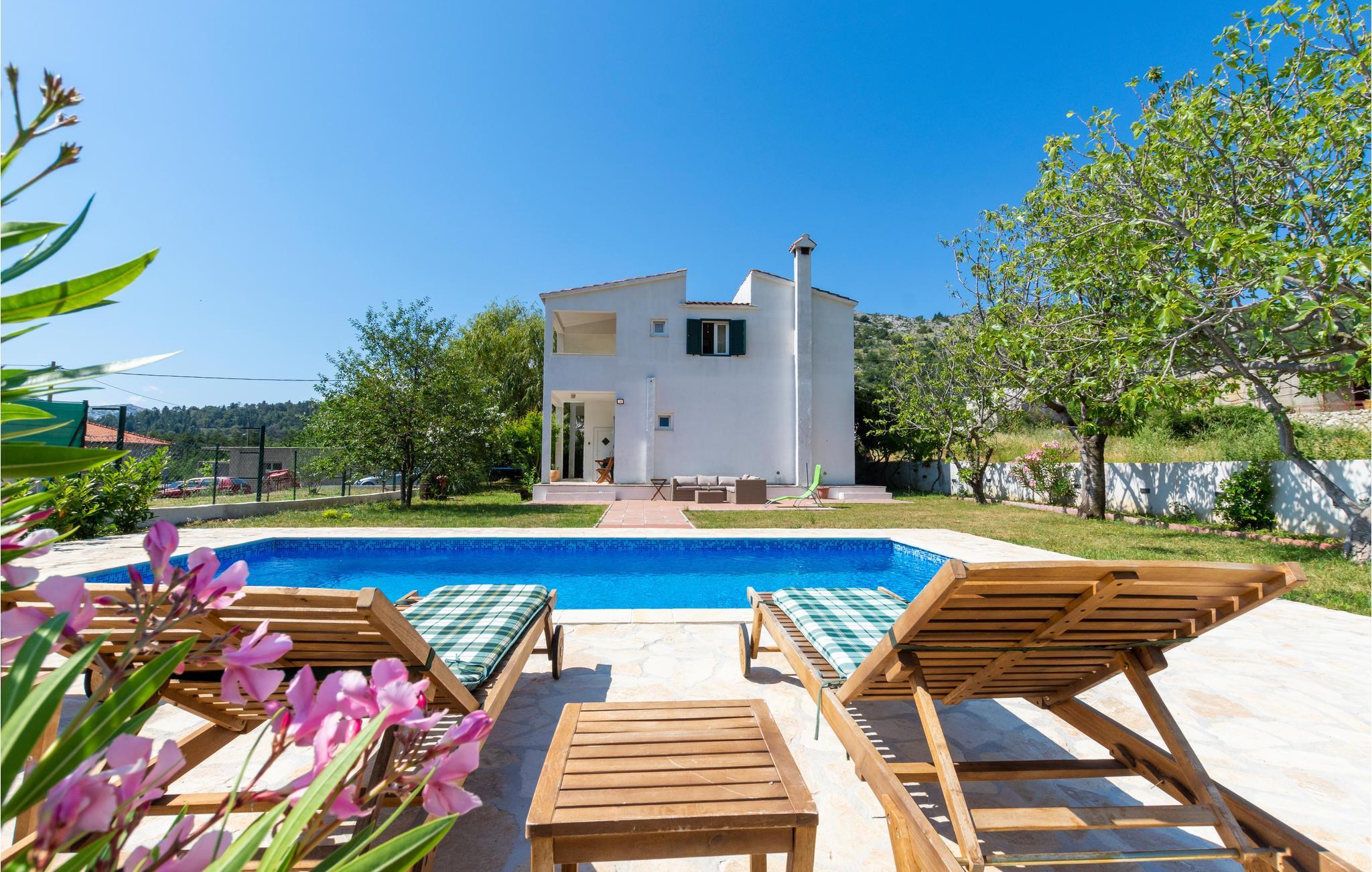 In der kleinen und grünen Oase, liegt die Ortschaft Gata und dieses schmucke Ferienhaus mit Pool Es besteht aus drei Schlafzimmern, einem Wohnzimmer mit Kamin und einer großen Terrasse im ersten Stock, während sich im Erdgeschoss noch eine Küche mit großem Aufenthaltsraum und ein Schlafzimmer befinden. Die Etagen sind nur von außen begehbar. Entspannen Sie beim Pool, am Außengrill, im Garten und im Pavillon. Die Stadt Omis, mit ihren herrlichen Kiesstränden und umfangreichem Unterhaltungsprogramm, liegt nur ca. 5 km entfernt. Für sportliche Aktivitäten bieten sich auch Rafting auf dem Fluß Cetina an, sowie Radfahren und Zipline.