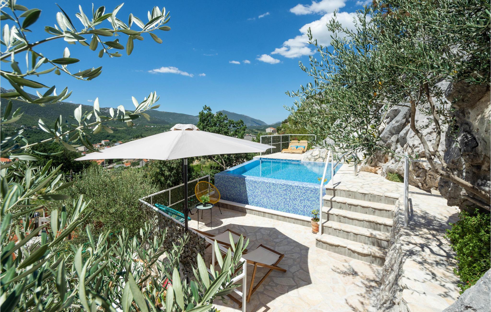 Dieses schön eingerichtete Ferienhaus mit Badebassin, umgeben von der Natur, befindet sich im Dreieck zwischen den Rivieren von Makarska und Omis sowie dem Biokovo Gebirge. In der Nähe liegt auch die kulturelle Stadt Split. Der kleine Ort Kostanje, mit erhaltener Natur und mediterranem Klima, liegt weit weg von Verkehrsstaus und hat trotzdem eine gute Verbindung zu den attraktivsten Stränden. Das Herz von Kostanje ist der Fluss Cetina, gespeist von einer unerschöpflichen Wasserquelle und zu turbulenten Rafting-Abenteuern einladend. Die Etagen sind mit Außentreppen verbunden. Genießen Sie die Düfte, das ruhige Meer, die Kraft und Energie des Flusses beim Rafting, entspannen Sie beim Radfahren oder Wandern, Sie entdecken hier Heilpflanzen und lauschen der Musik Dalmatiens.
