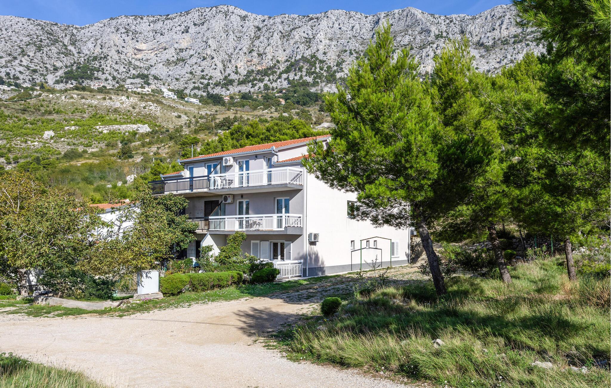 In einem hoch gelegenen und von Pinienbäumen umgebenen Haus finden Sie diese angenehm eingerichtete Ferienwohnung zum Wohlfühlen. Durch die Lage bietet sie viel Ruhe für einen entspannten Urlaub. Das Meer und ein langer, schöner Kiesstrand liegen nur wenige Autominuten von den Wohnungen entfernt, so dass Sie jeden Tag am Meer verbringen können. Die niedrigste Deckenhöhe in den Dachgeschosswohnungen beträgt ca. 100 cm. Besuchen Sie aber auch die anderen schönen kleinen Städte in der Umgebung und erkunden dabei die wunderbare Küste und deren Strände. Empfehlenswert ist ein Besuch der Städte Omiš und Makarska mit vielen Sommerveranstaltungen.