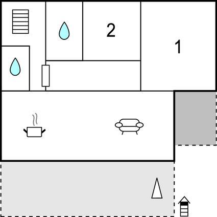 Es besteht aus zwei Schlafzimmern, Küche, Wohnzimmer und zwei Badezimmern, von denen sich das eine unmittelbar vor dem Haupteingang der Ferienwohnung bzw. außerhalb der eigentlichen Wohnung befindet.